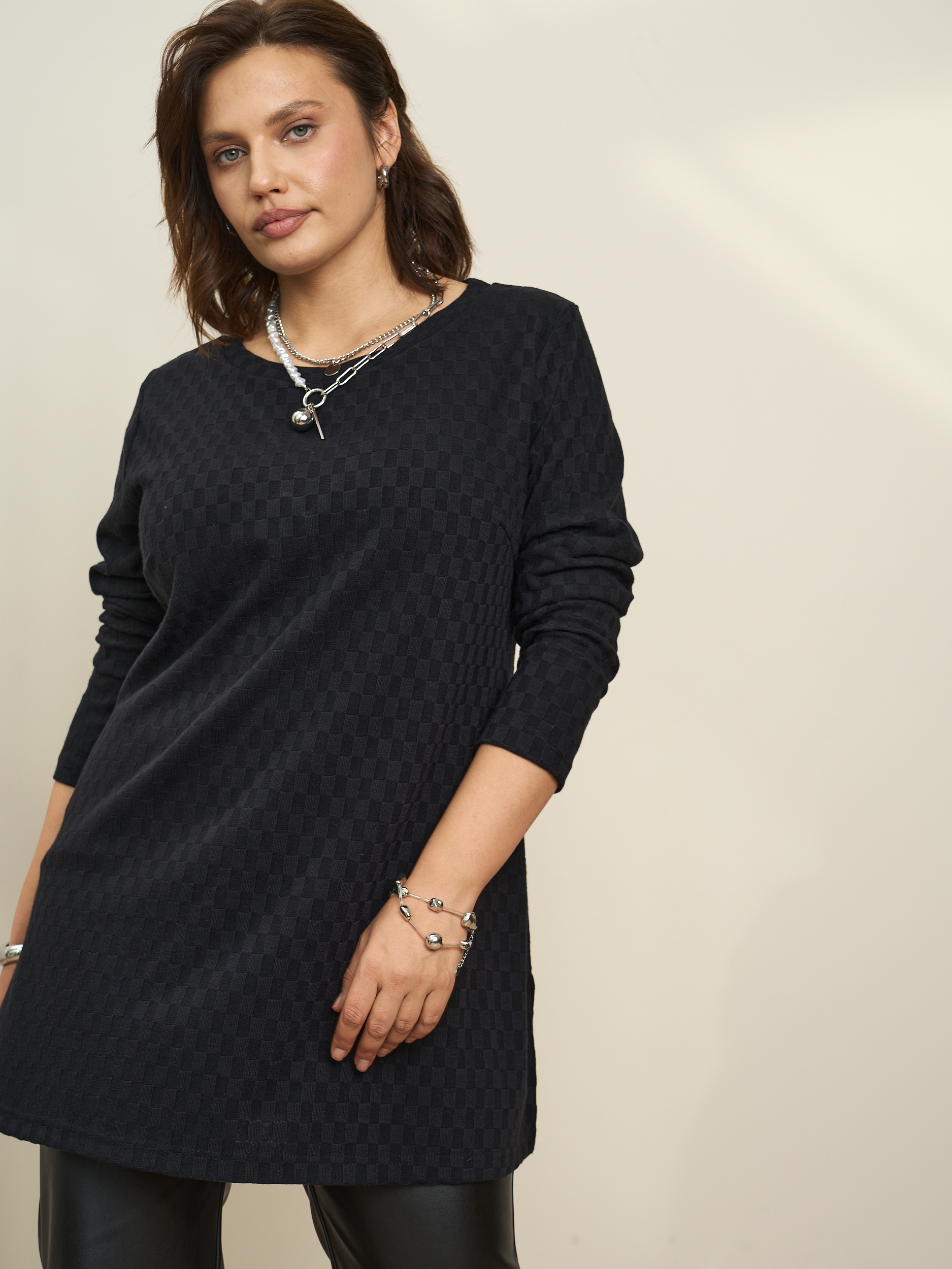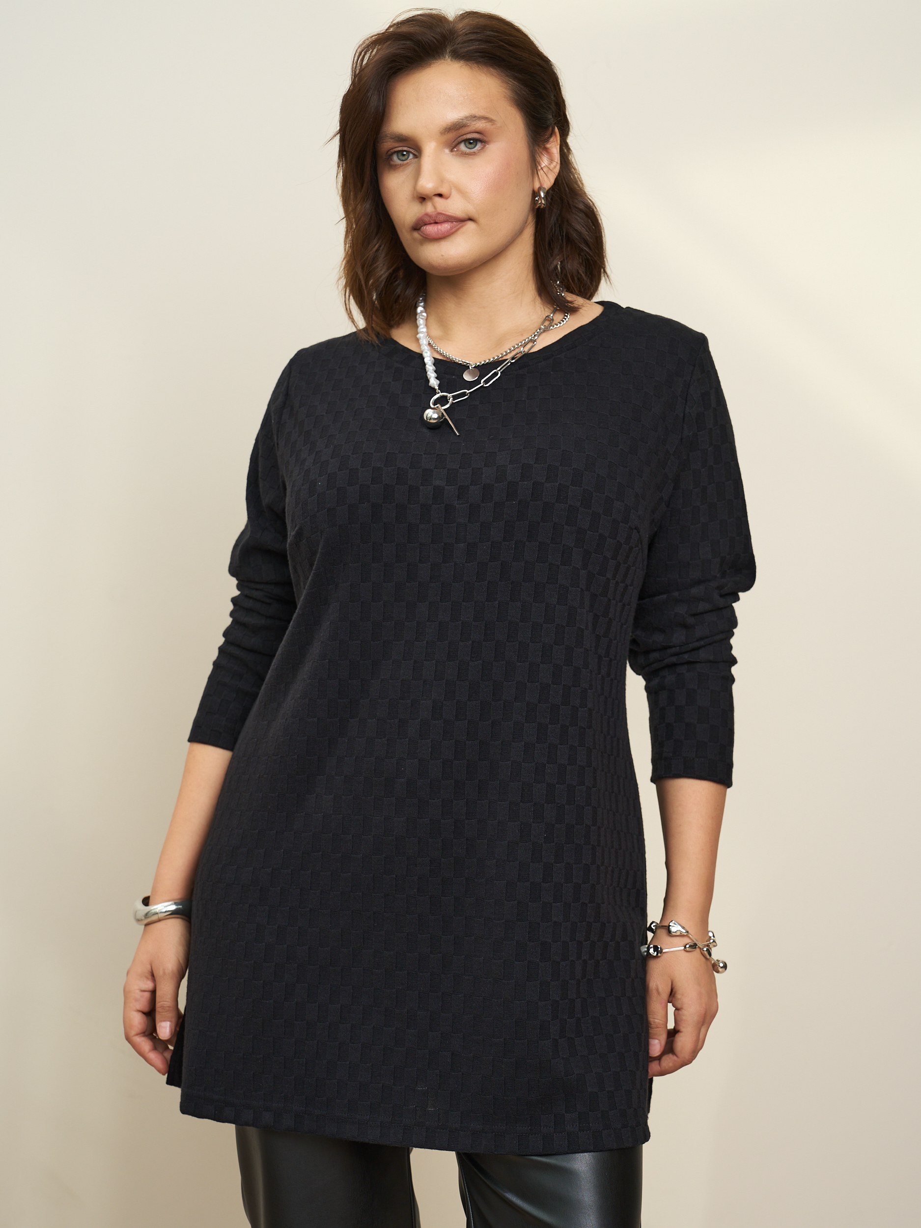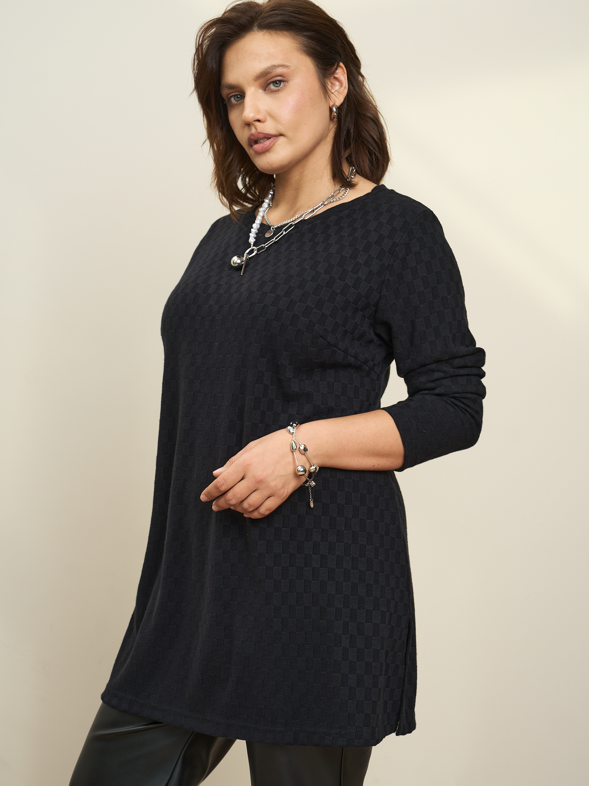 Стильная туника длиной до середины бедра. Длинный рукав. Округлая горловина, боковые разрезы. Лаконичная и женственная модель, которая будет уместной в гардеробе классического, романтического стилей, а также хорошо прекрасно дополнит комплекты для торжественных случаев.
