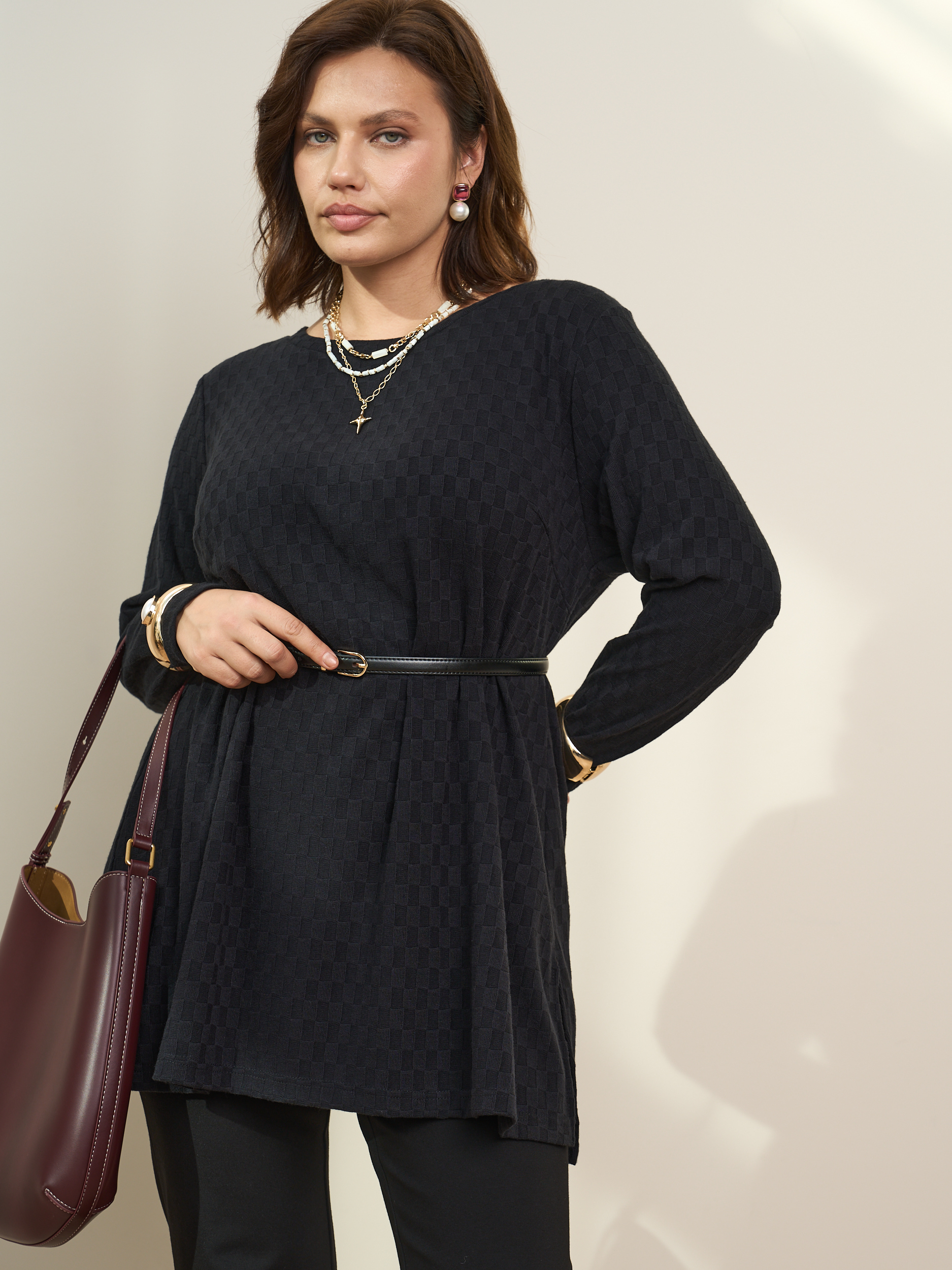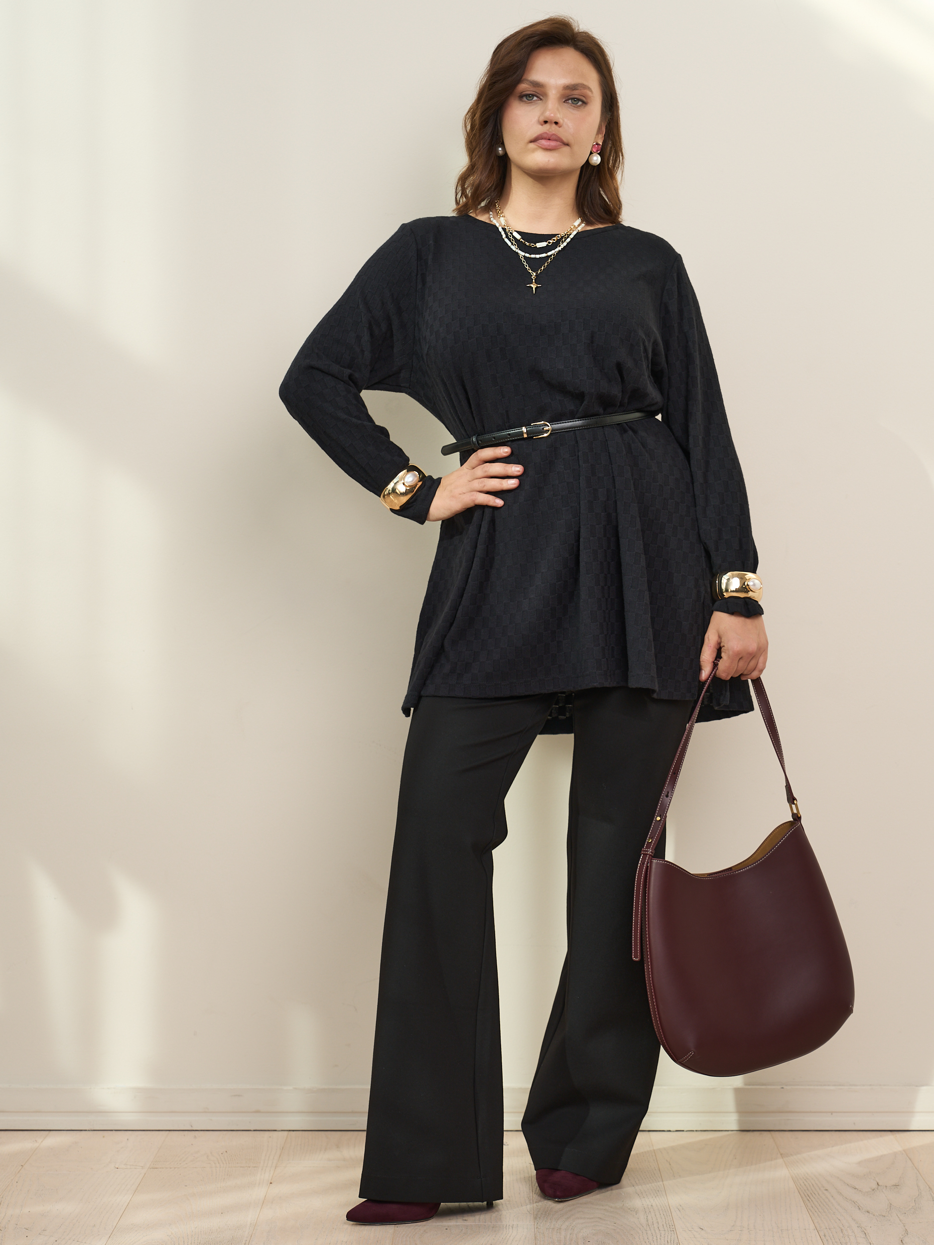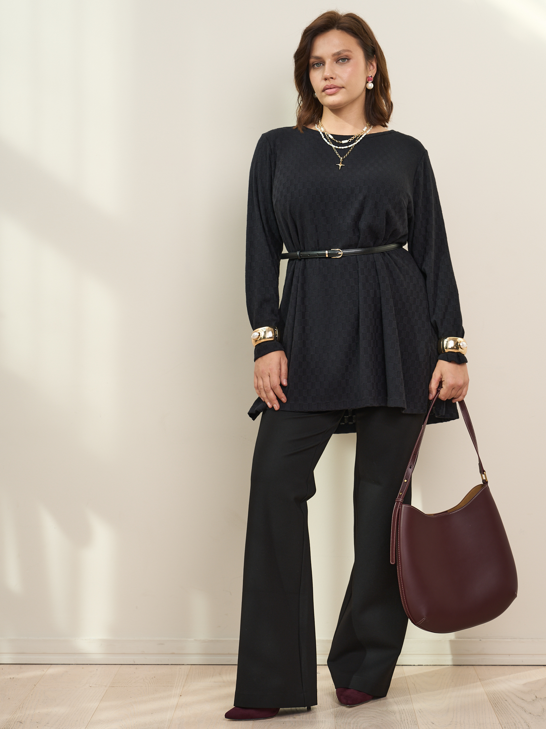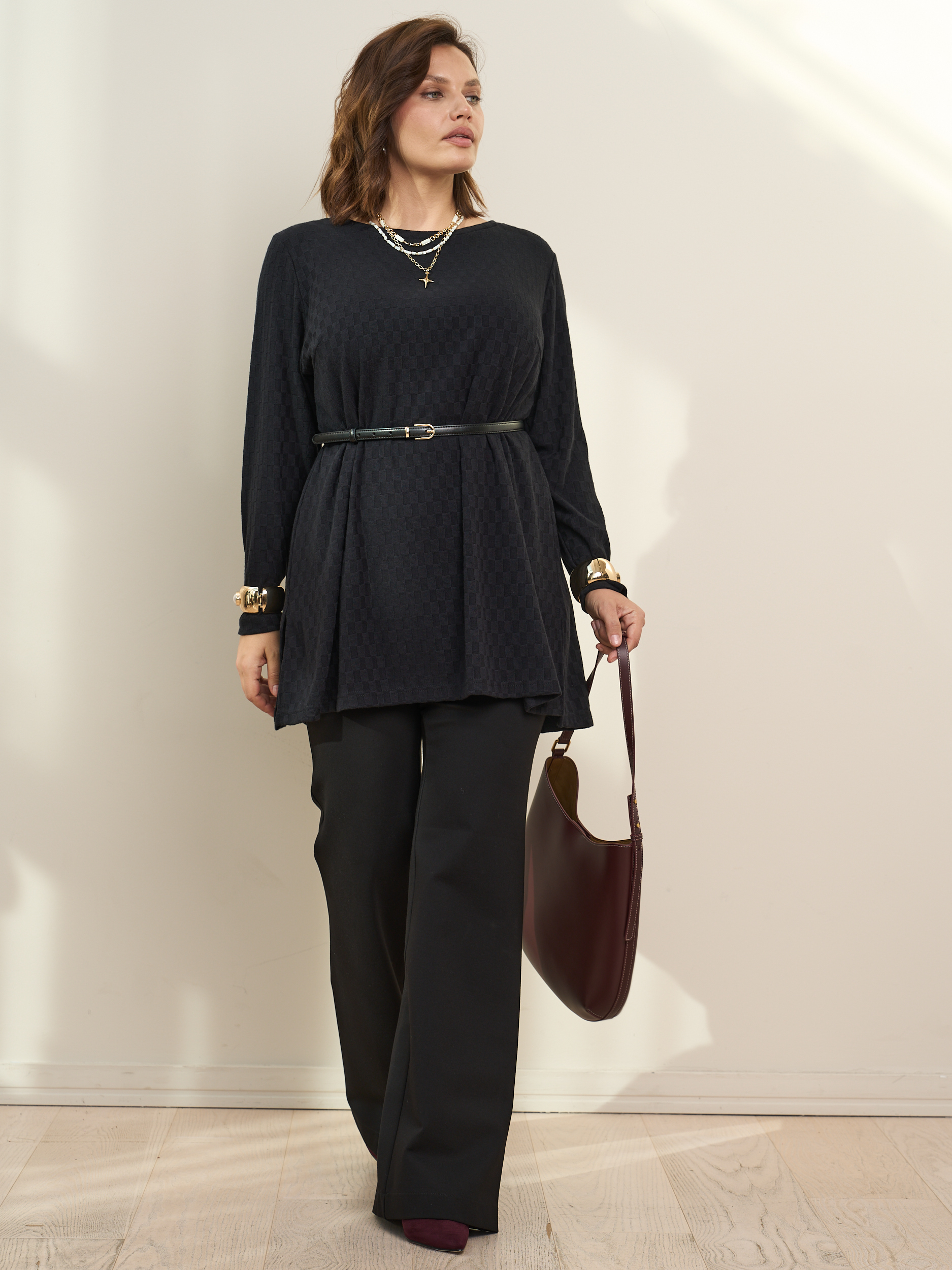 Стильная туника длиной до середины бедра. Длинный рукав. Округлая горловина, боковые разрезы. Лаконичная и женственная модель, которая будет уместной в гардеробе классического, романтического стилей, а также хорошо прекрасно дополнит комплекты для торжественных случаев.