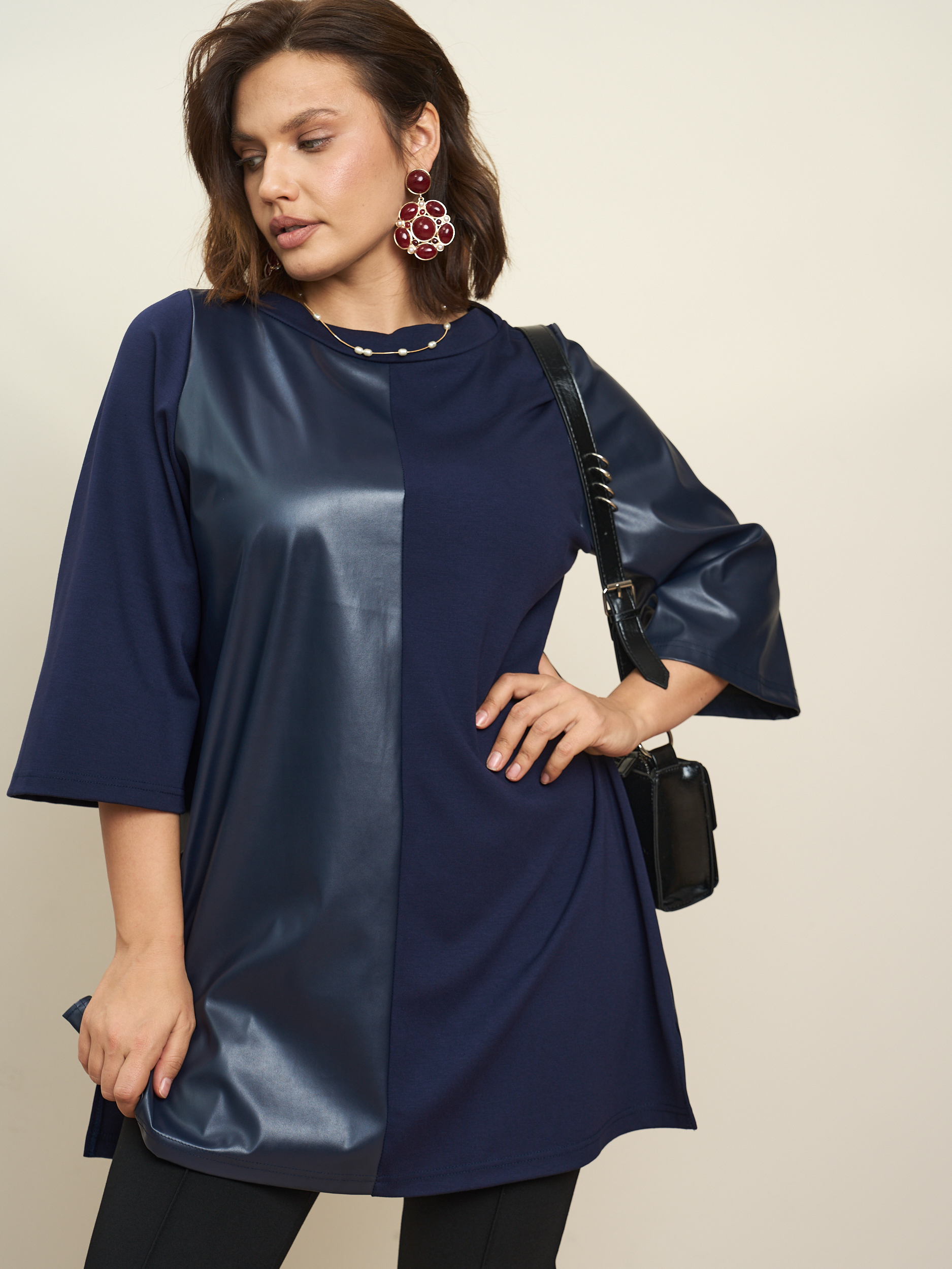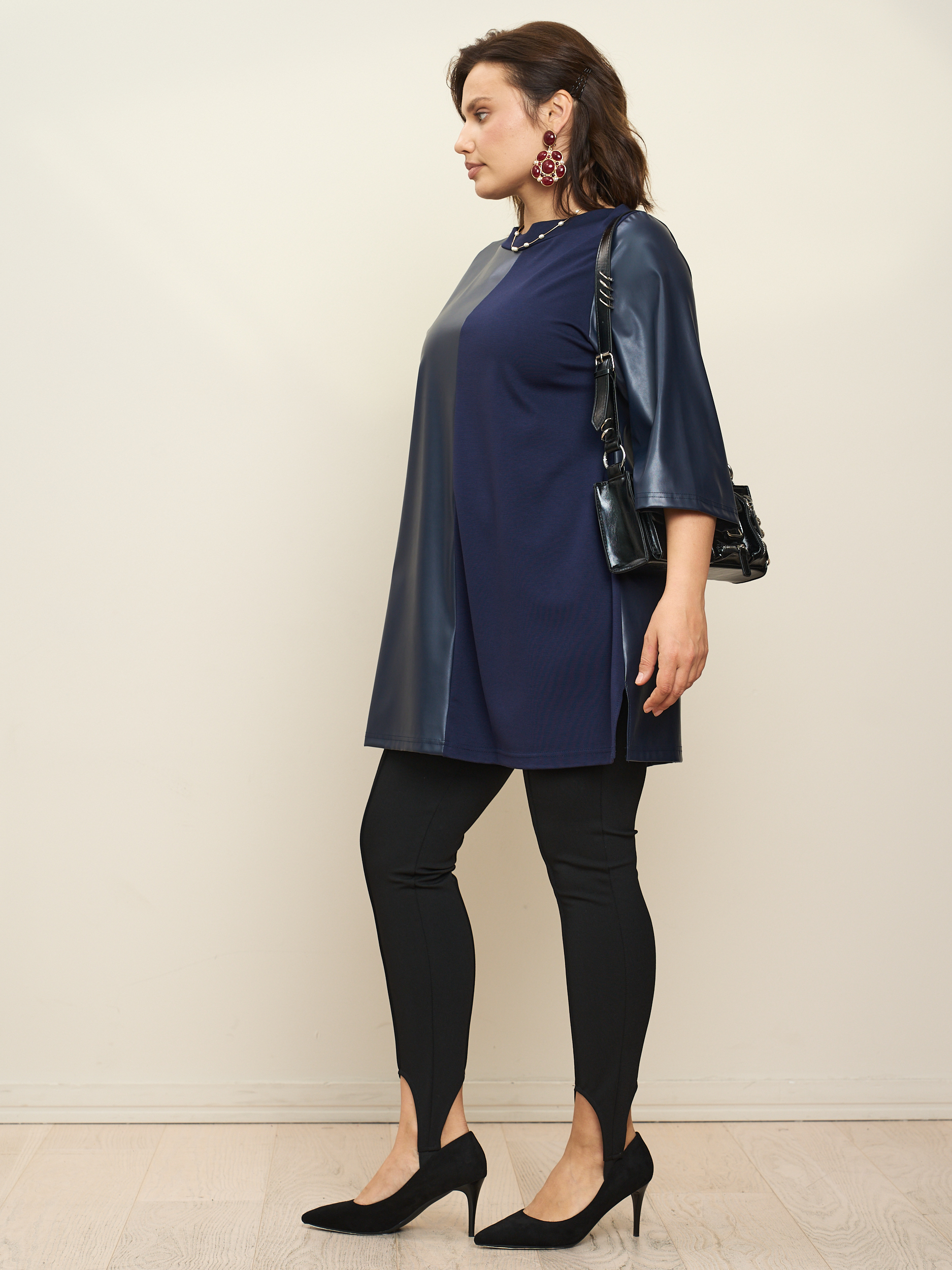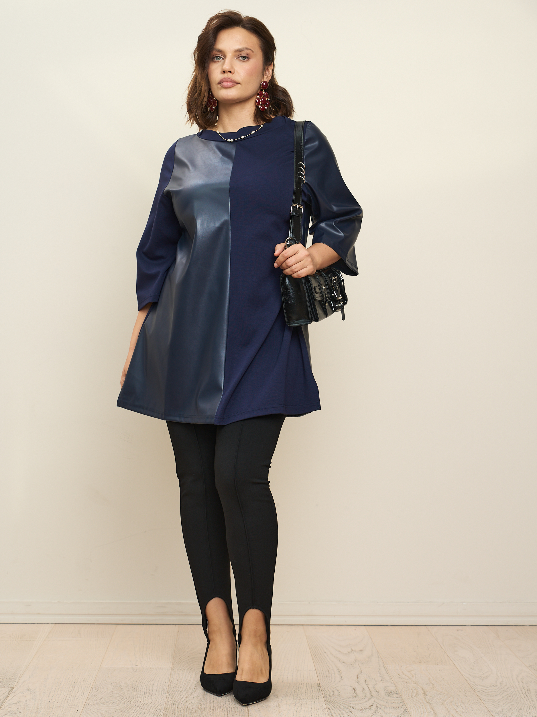 Стильная туника А-силуэта. Выразительная и женственная модель для женщин plus size. Длина изделия до середины бедра, рукав 3/4. Туника изготовлена из качественного трикотажа и фактурной эко-кожи. Модель отлично подойдёт поклонницам экстравагантного стиля, хорошо сочетается с леггинсами и зауженными брюками.