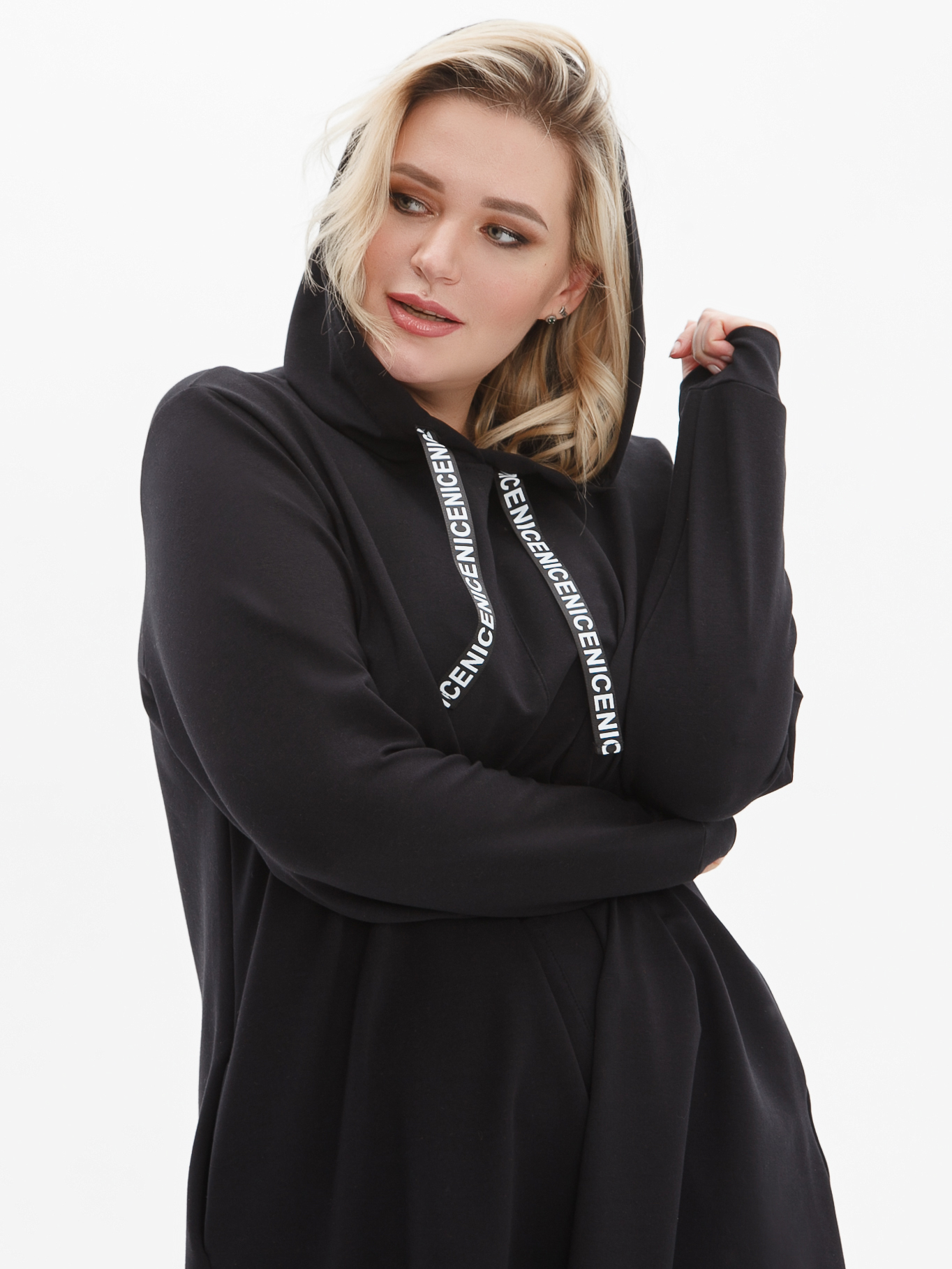 Стильное платье из тонкого футера необычного кроя с капюшоном. Рукав втачной, прямой, на манжете. Низ изделия имеет неровный край. Роль шнурков выполняет репсовая тесьма с надписью. Капюшон обьемный, функциональный. Отлично сочетается с короткими куртками типа «косуха» в кожаном и джинсовом исполнении, подойдет как под спортивную обувь, так и под ботинки и слипоны. Отлично подойдет как для повседневной носки в прохладное время года, так и для прохладных летних дней.