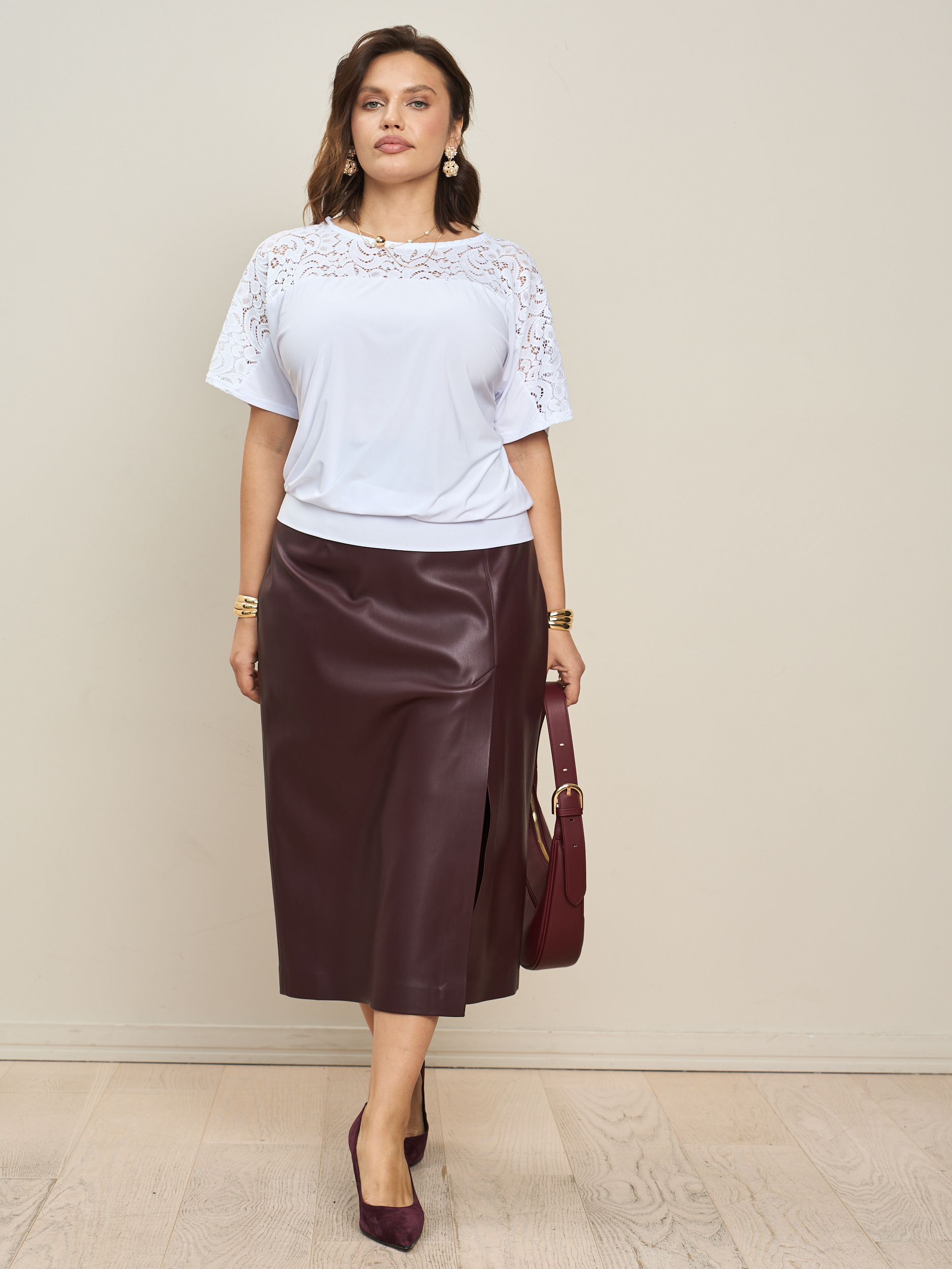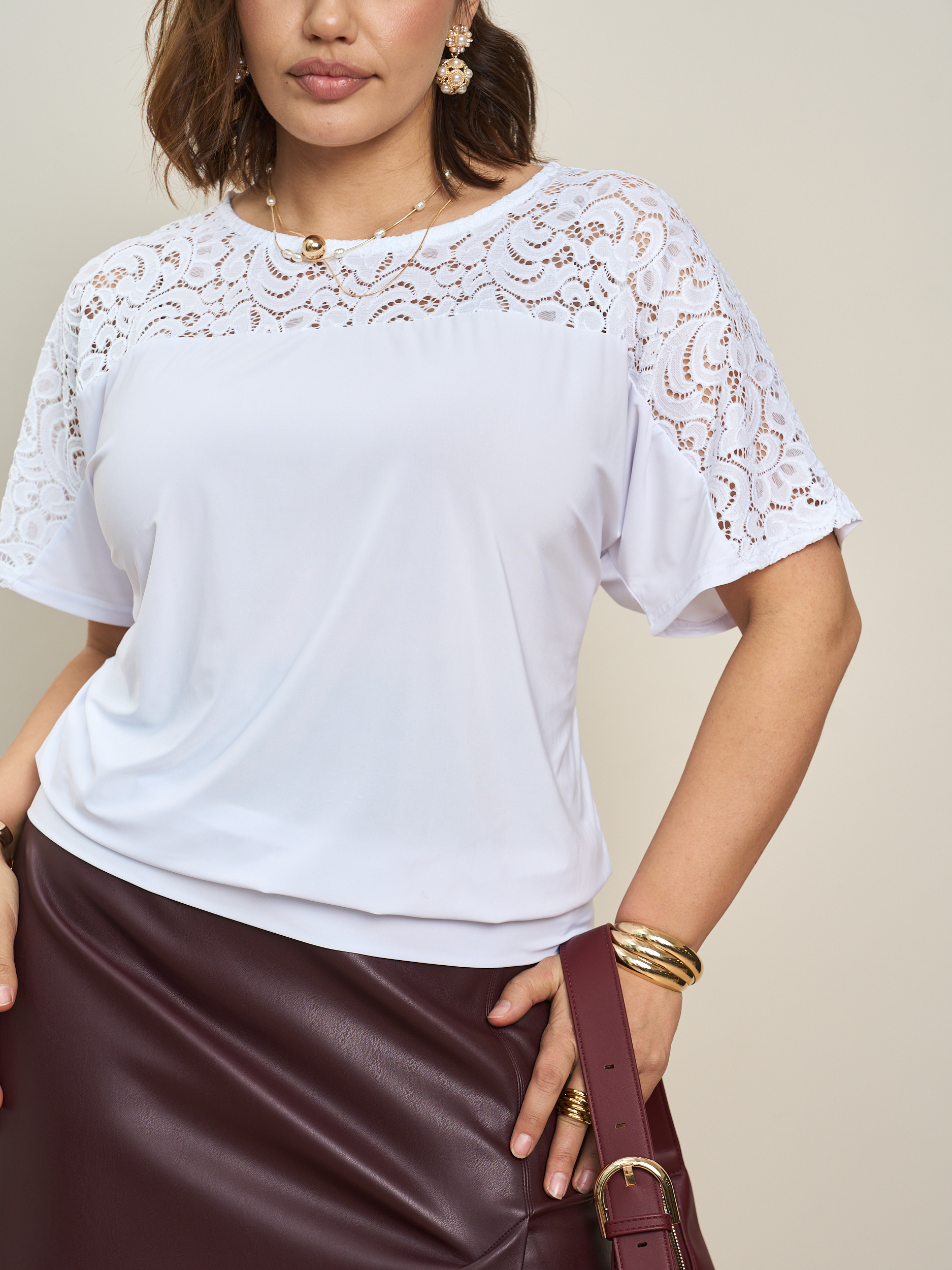 Блуза комбинированная с гипюром. Низ на широком манжете. Приспущенный рукав. Ткань- трикотаж с гладкой шелковистой фактурой. Базовая вещь под жакет, пиджак или, как самостоятельная еденица гардероба