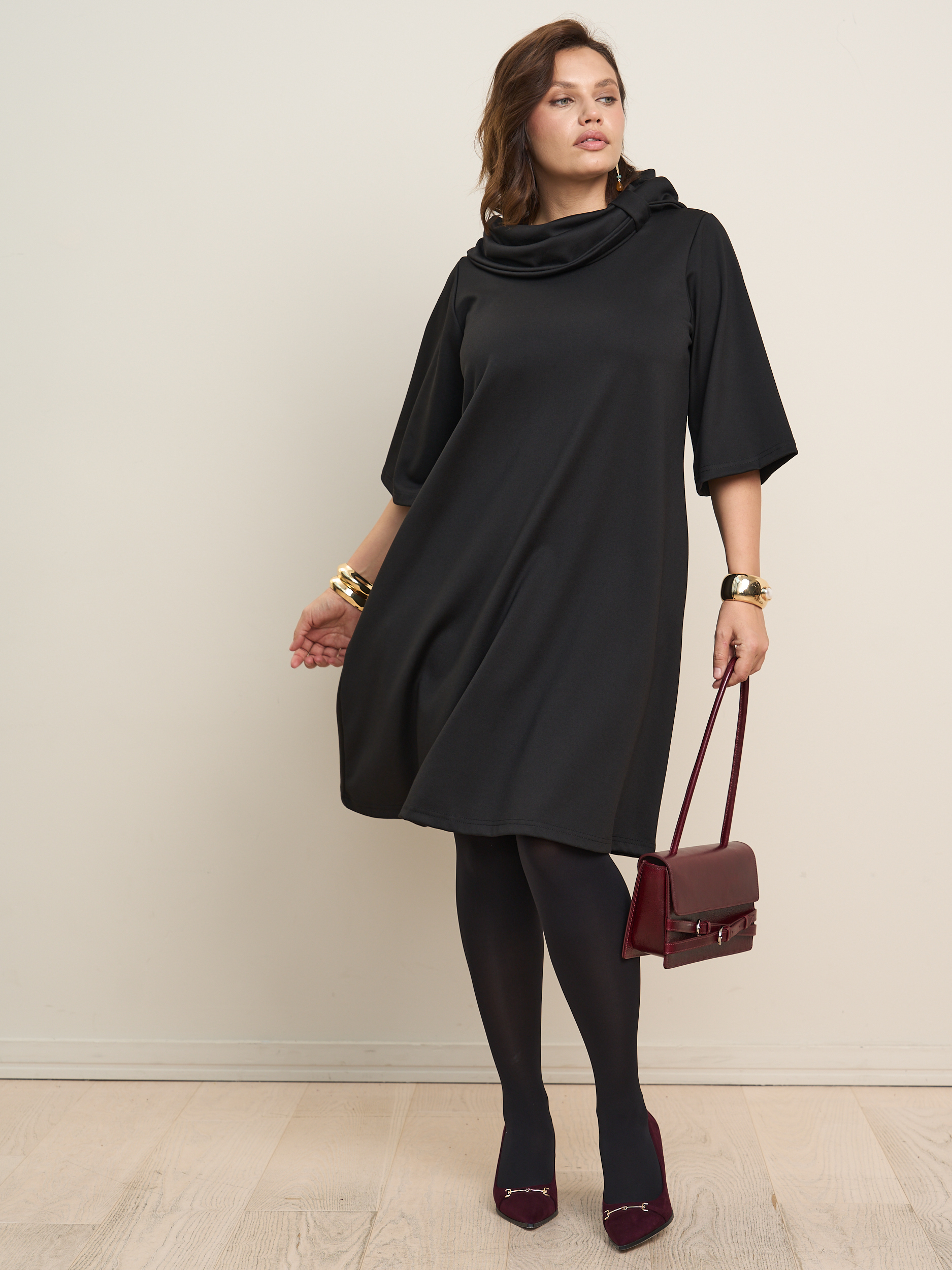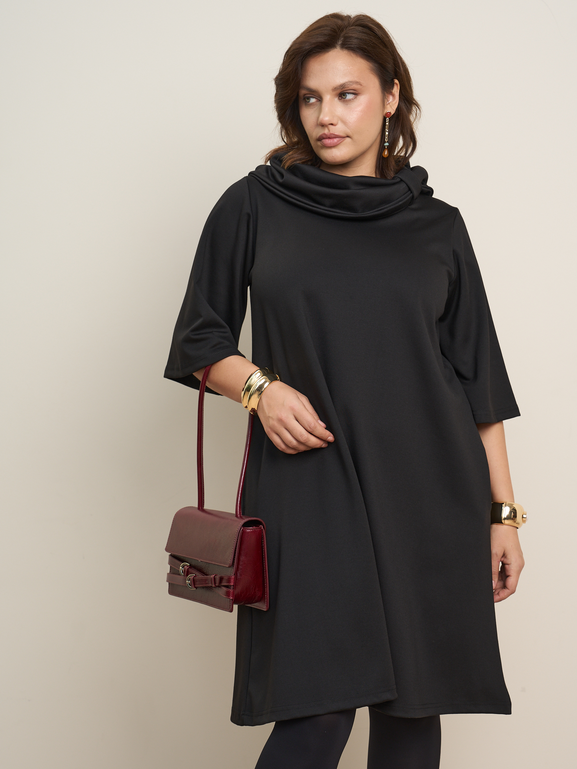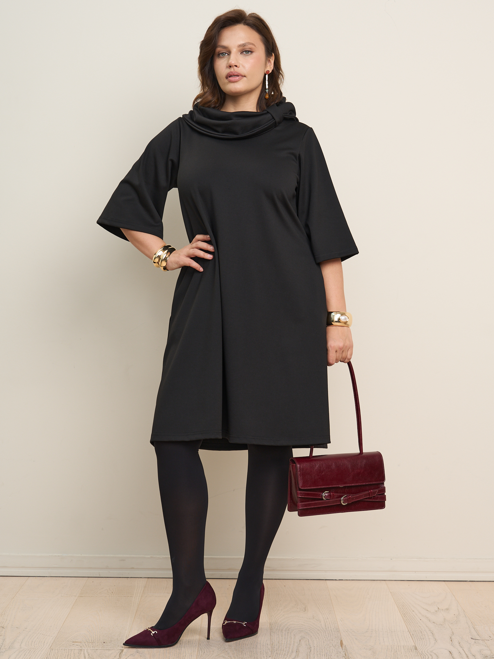 Платье А-силуэта с воротником-хомутом. Длина рукава - до локтя, крой свободный. Втачные карманы для максимального комфорта. Платье изготовлено из мягкого трикотажа джерси. Удобное и и комфортное изделие для прохладного времени года.
