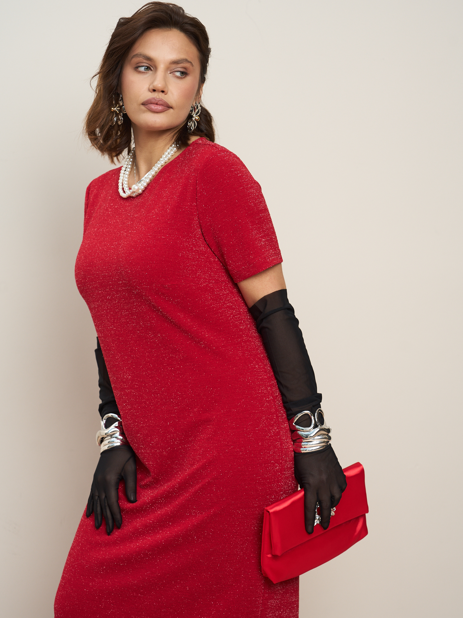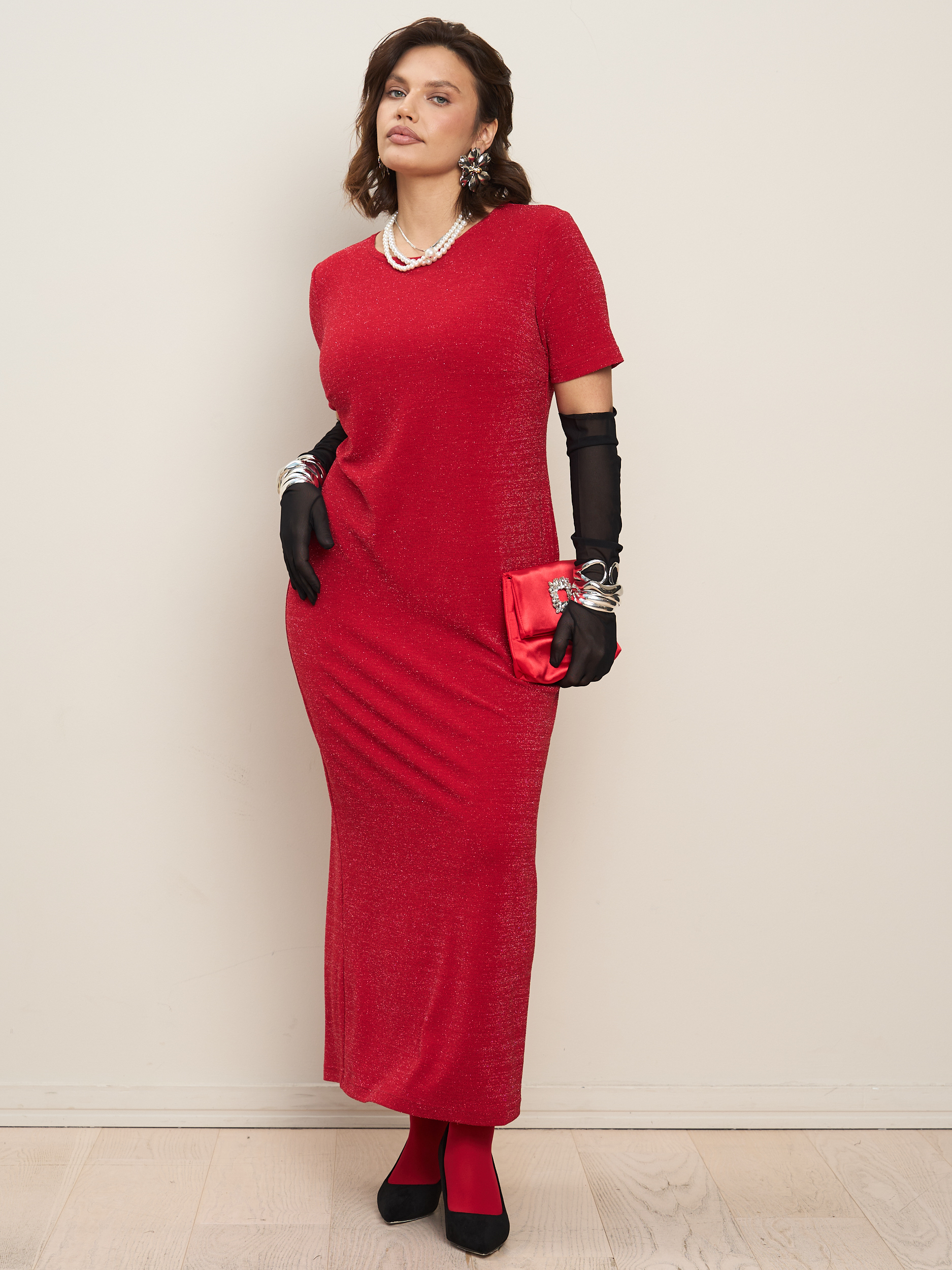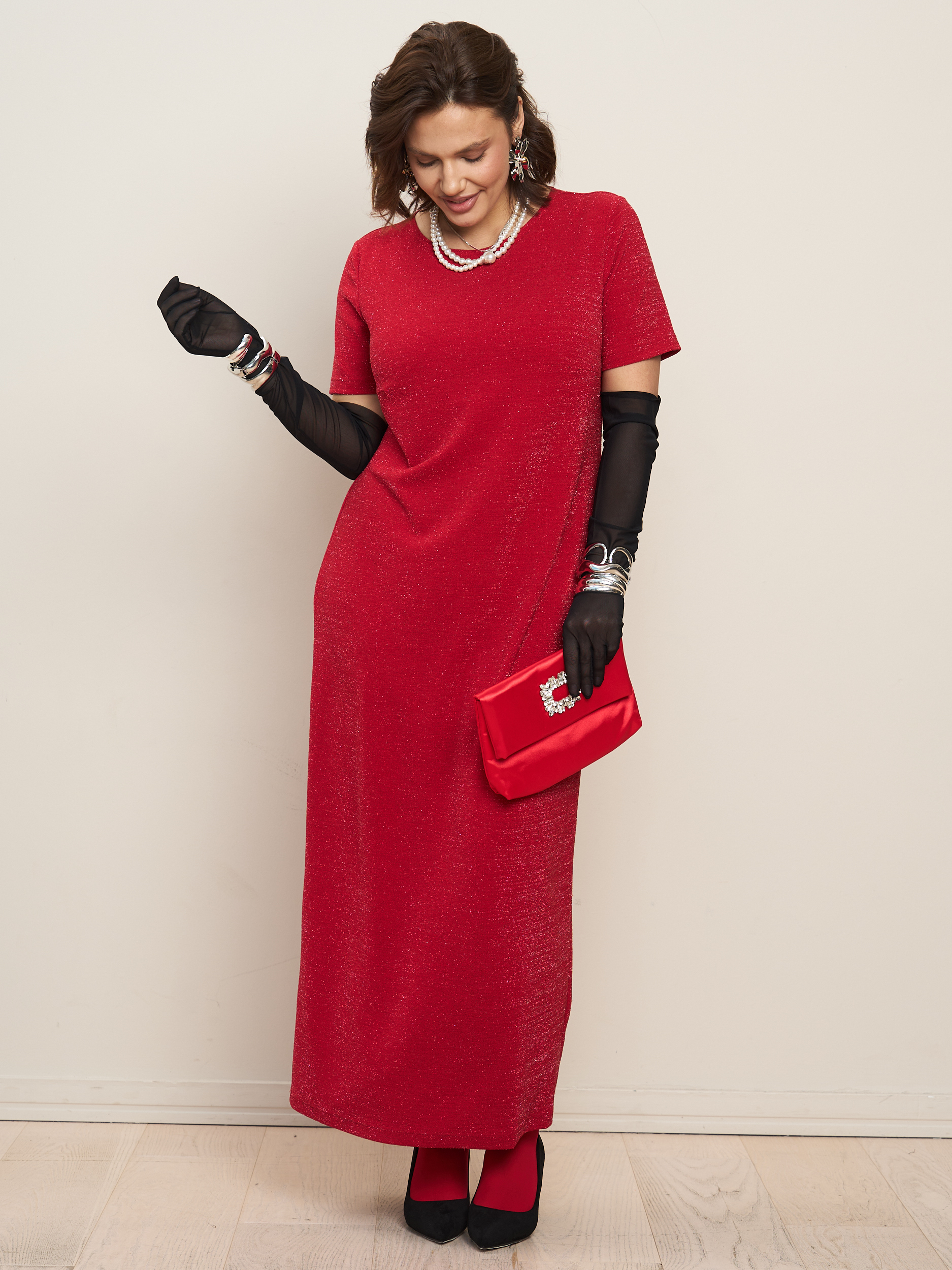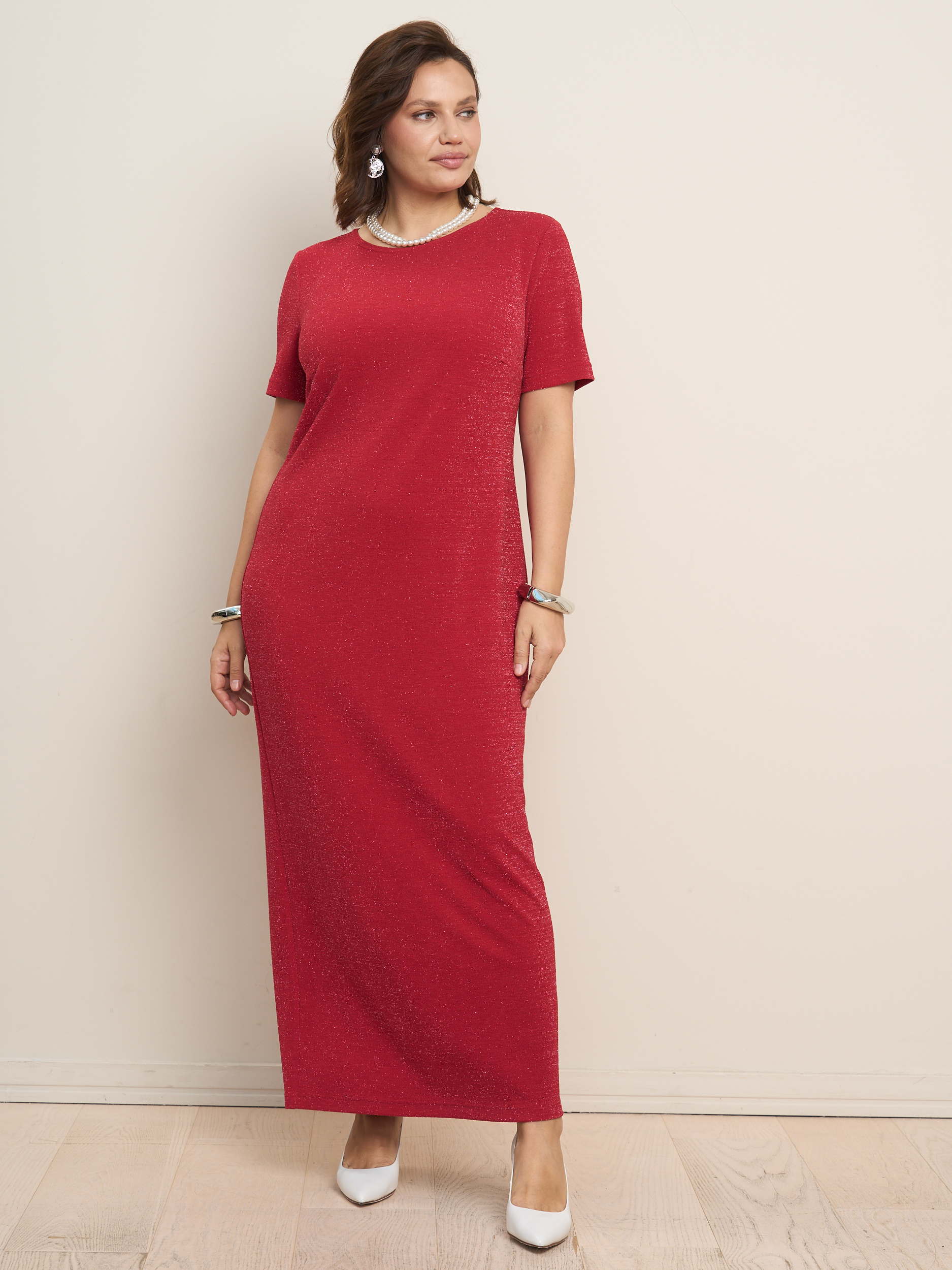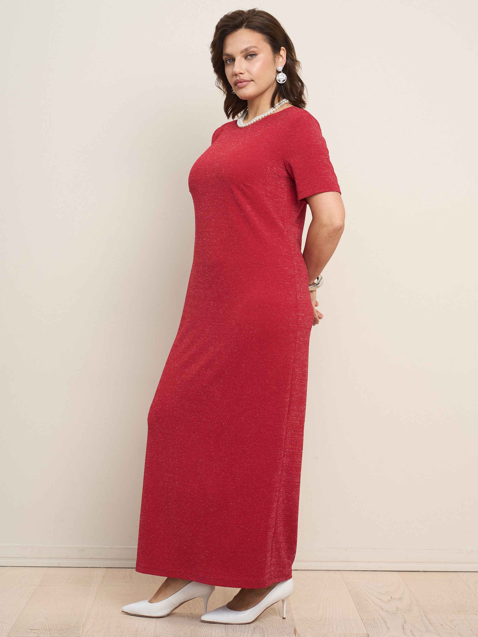 Роскошное вечернее макси-платье Plus size. Лаконичный строгий крой и сияющая ткань (люрексная нить), из которой изготовлено платье, вместе создают ошеломительный эффект. Прямой силуэт, короткий рукав, материал изделия плотный высококачественный трикотаж. Платье безукоризненно садится по фигуре благодаря оригинальному крою.