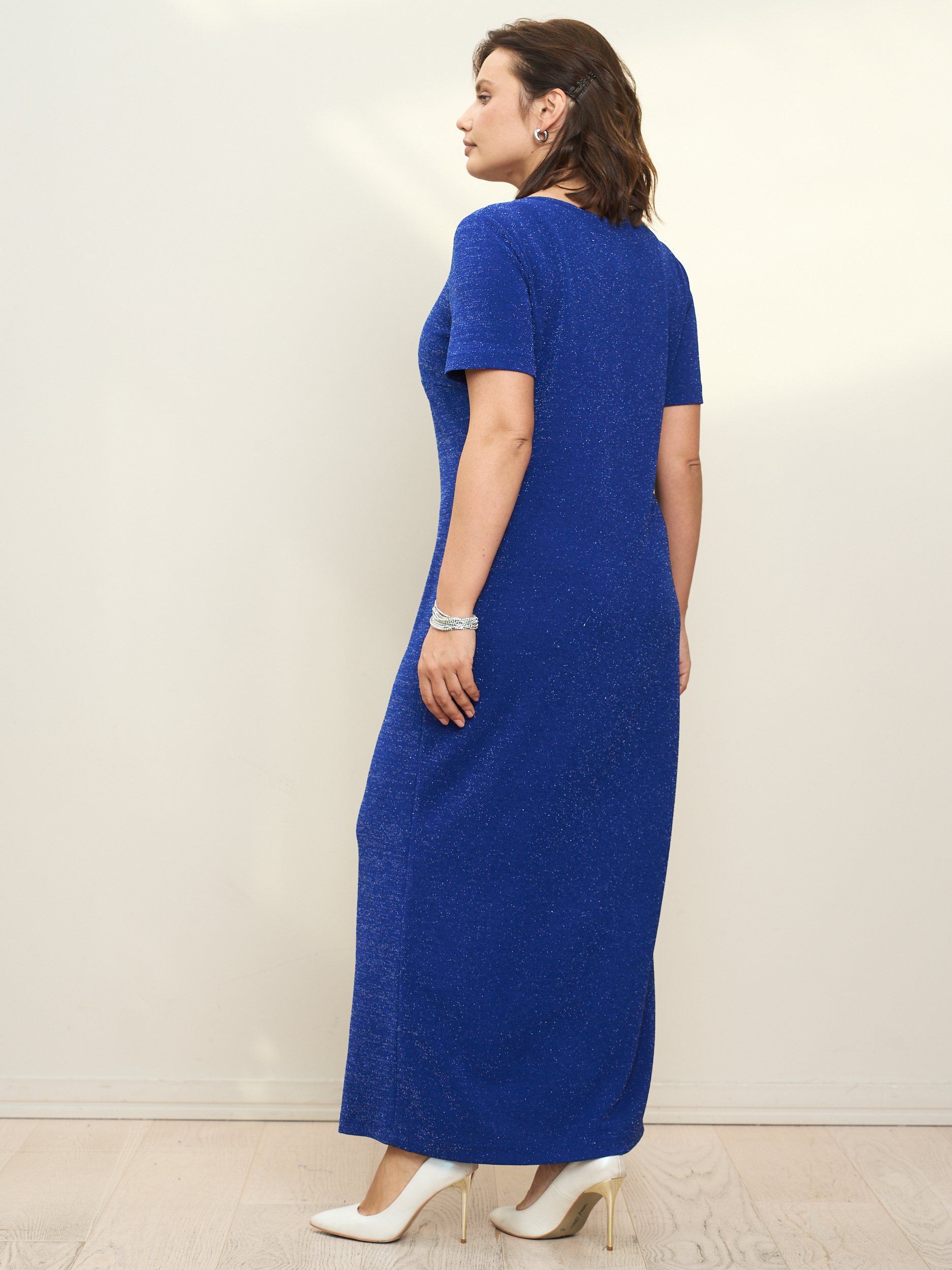 Роскошное вечернее макси-платье Plus size. Лаконичный строгий крой и сияющая ткань (люрексная нить), из которой изготовлено платье, вместе создают ошеломительный эффект. Прямой силуэт, короткий рукав, материал изделия плотный высококачественный трикотаж. Платье безукоризненно садится по фигуре благодаря оригинальному крою.