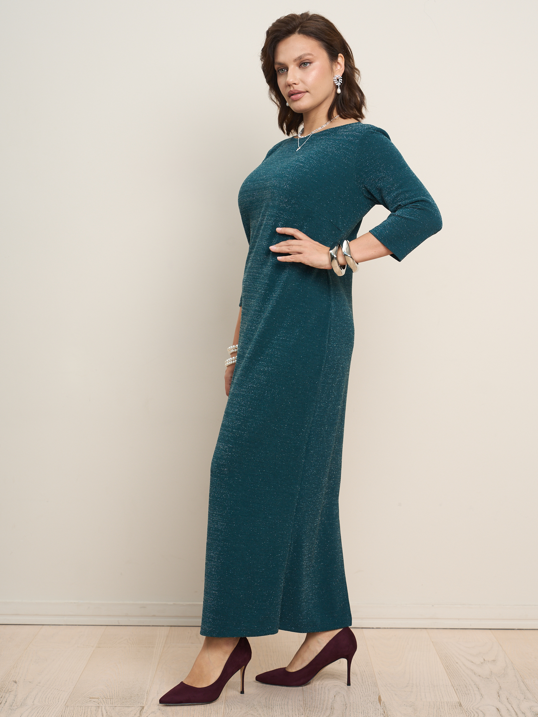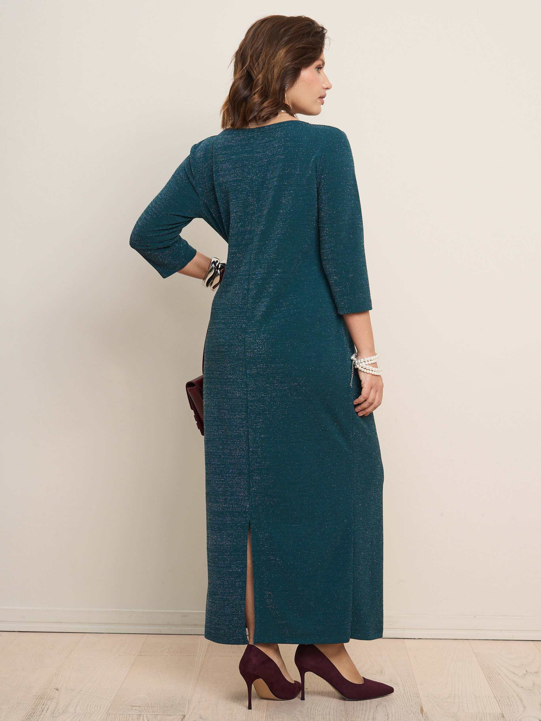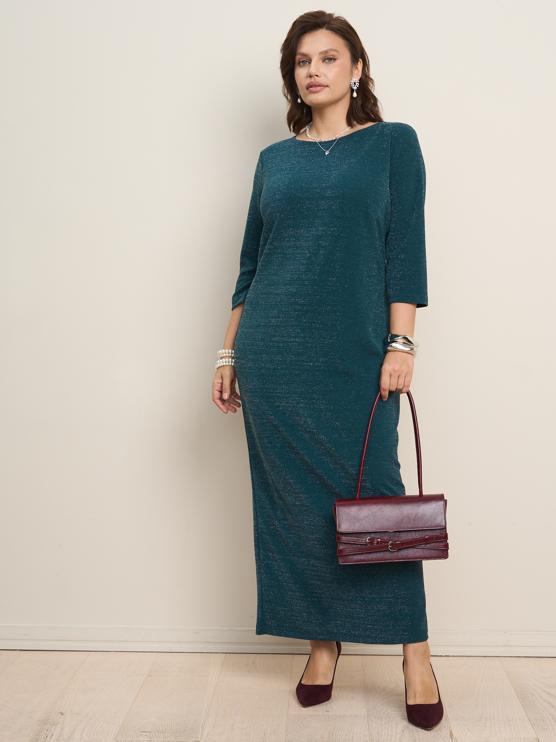 Лаконичный строгий крой, прямой силуэт, рукав 3/4 материал изделия плотный высококачественный трикотаж. Платье женское безукоризненно садится по фигуре благодаря оригинальному крою, и будет уместным в торжественном гардеробе. Платье с люрексовой нитью, блестит и переливается на свету. Не сковывает движения юбка дополнена разрезом который дополняет изысканность, не вытягивается в процессе носки, не деформируется и не линяет после стирки.