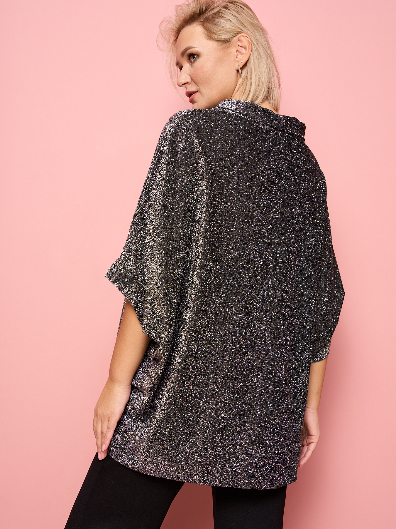 Новинка нашего бренда – трикотажная туника с напылением. Удобный комфортный дизайн и праздничный вид позволят вам выделиться на любом празднике или в офисе. Округлый свободный вырез, рукава-«летучая мышь» 3/4, плюс удлинённый силуэт обеспечивают удобство и возможность сочетать её с практически любым низом. Туника идеально сочетается с леггинсамии любым видом брюк. Непринужденная свободная посадка подчеркивает достоинства вашей фигуры, скрывая любые недостатки. Замечательное блестящее напыление позволяет тунике выглядеть не только нарядно, но и заметно среди прочей обыденной одежды.