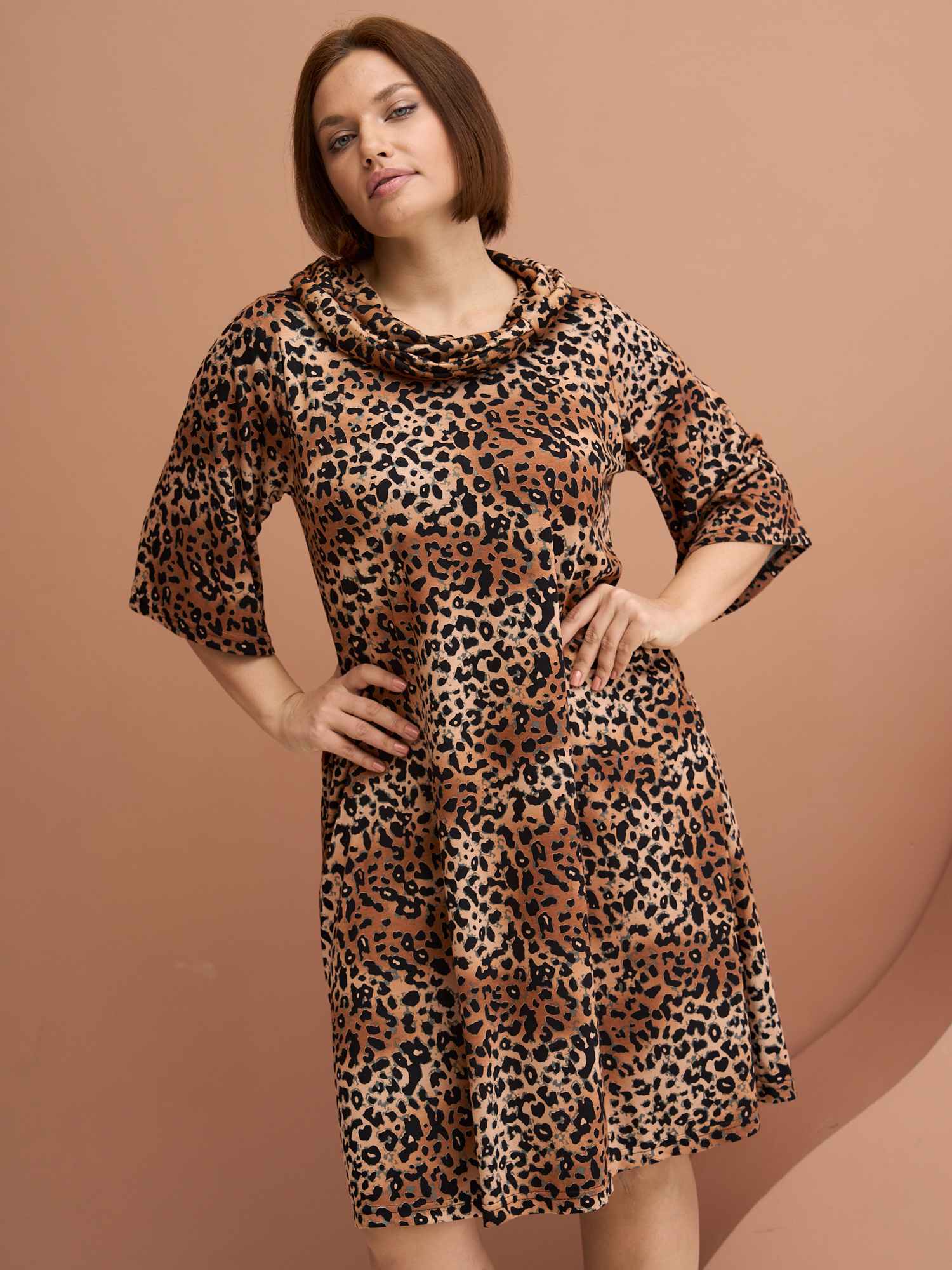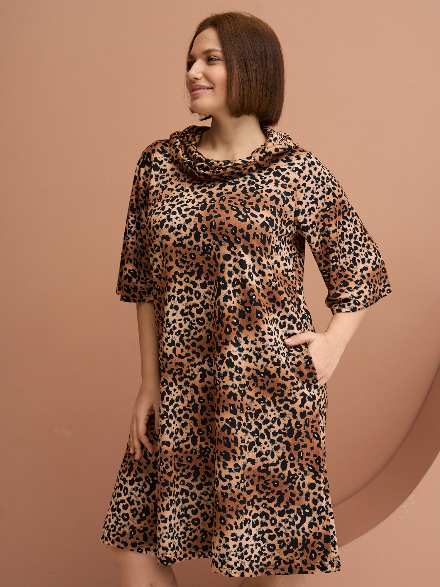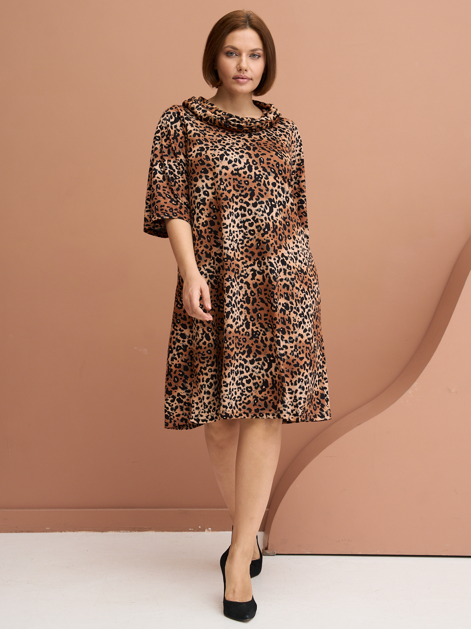Платье женское трапеция с широкими рукавами, воротник хомут. Длина до колена. Ткань - трикотаж мягкий плательный с принтом.