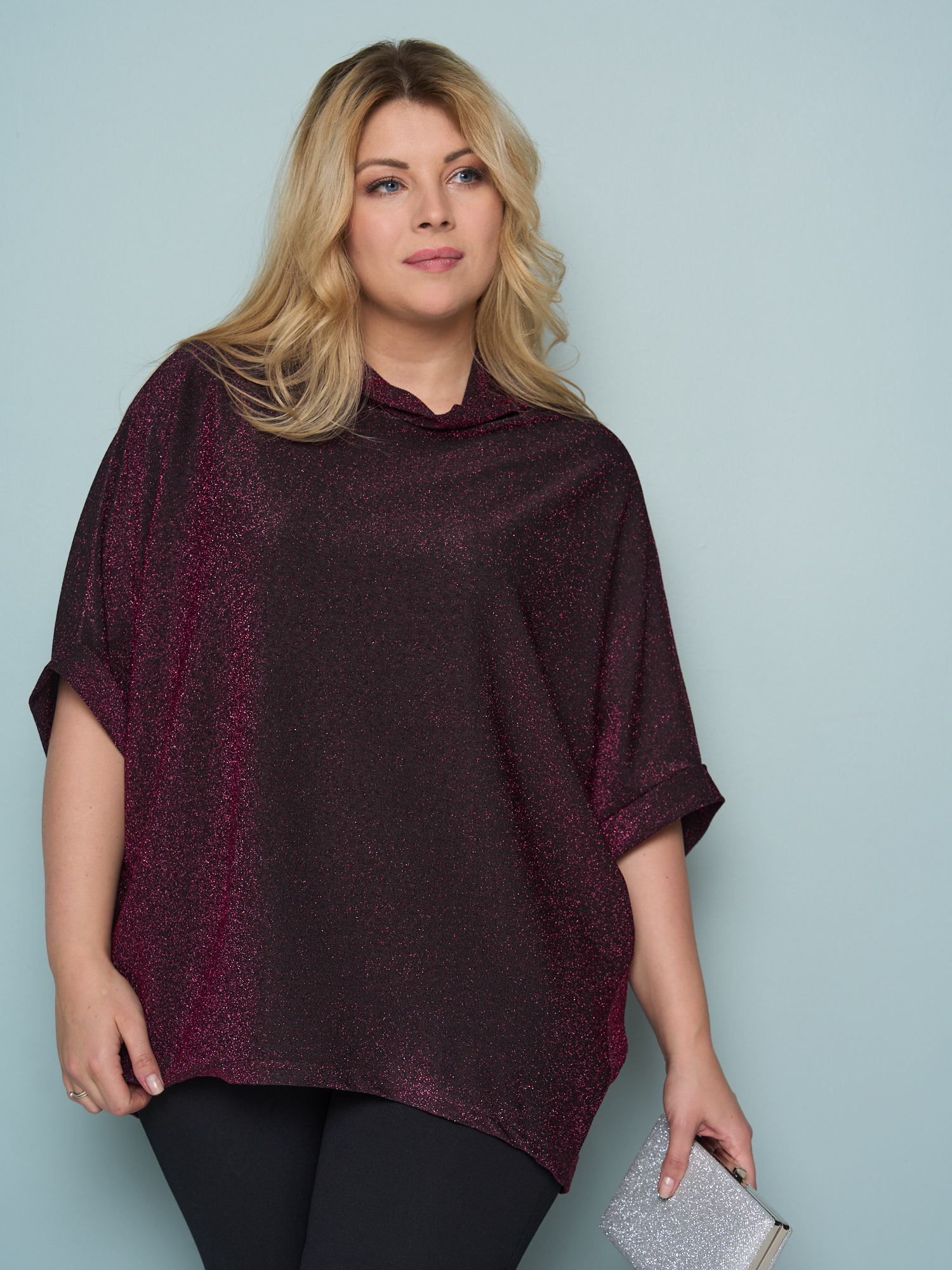 Новинка нашего бренда – трикотажная туника с напылением. Удобный комфортный дизайн и праздничный вид позволят вам выделиться на любом празднике или в офисе. Округлый свободный вырез, рукава-«летучая мышь» 3/4, плюс удлинённый силуэт обеспечивают удобство и возможность сочетать её с практически любым низом. Туника идеально сочетается с леггинсамии любым видом брюк. Непринужденная свободная посадка подчеркивает достоинства вашей фигуры, скрывая любые недостатки. Замечательное блестящее напыление позволяет тунике выглядеть не только нарядно, но и заметно среди прочей обыденной одежды.