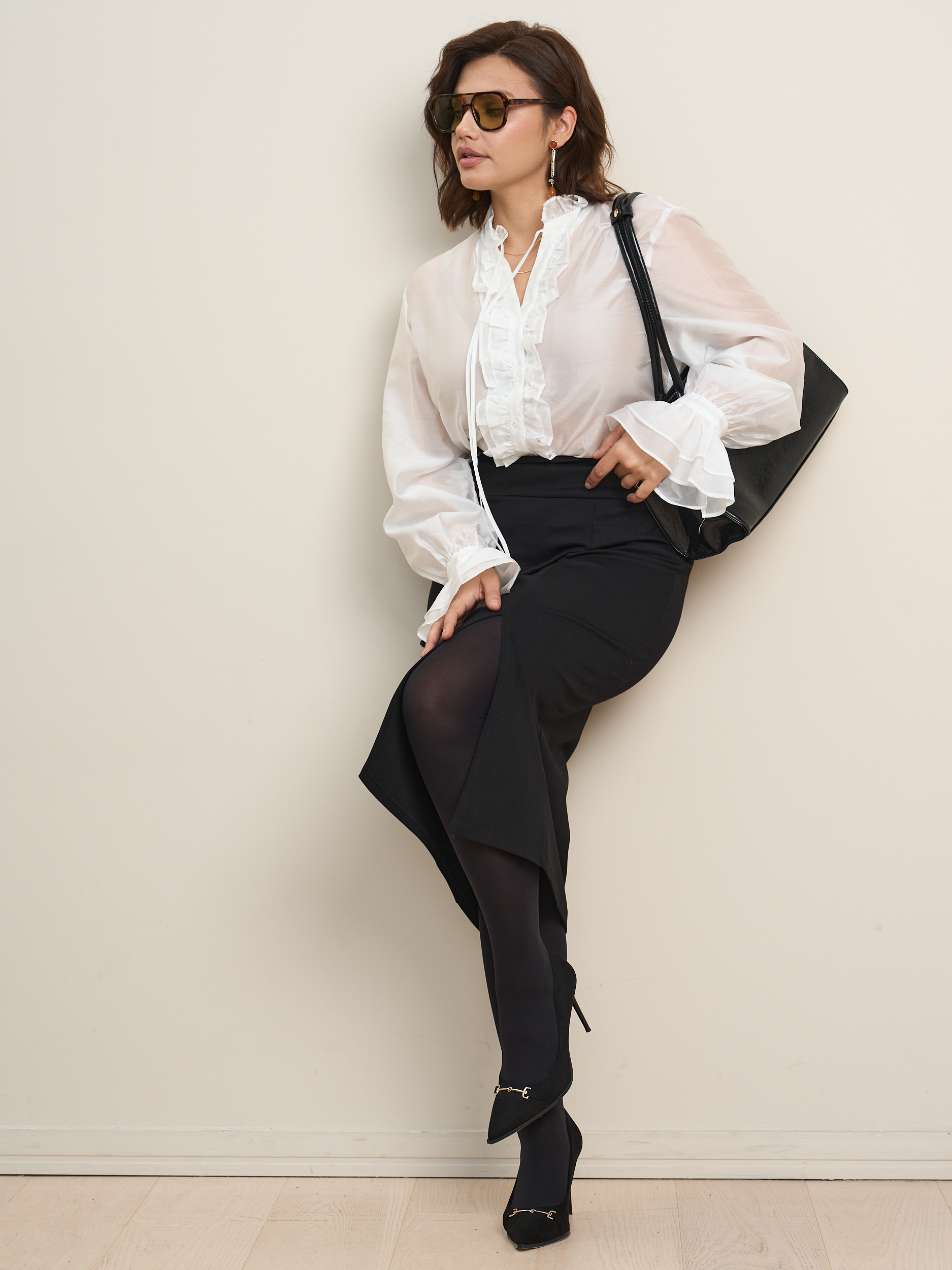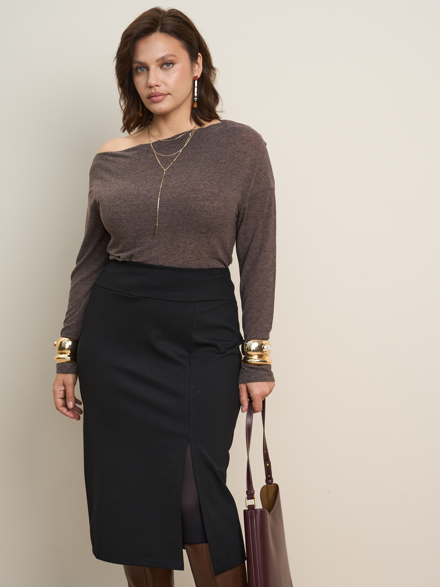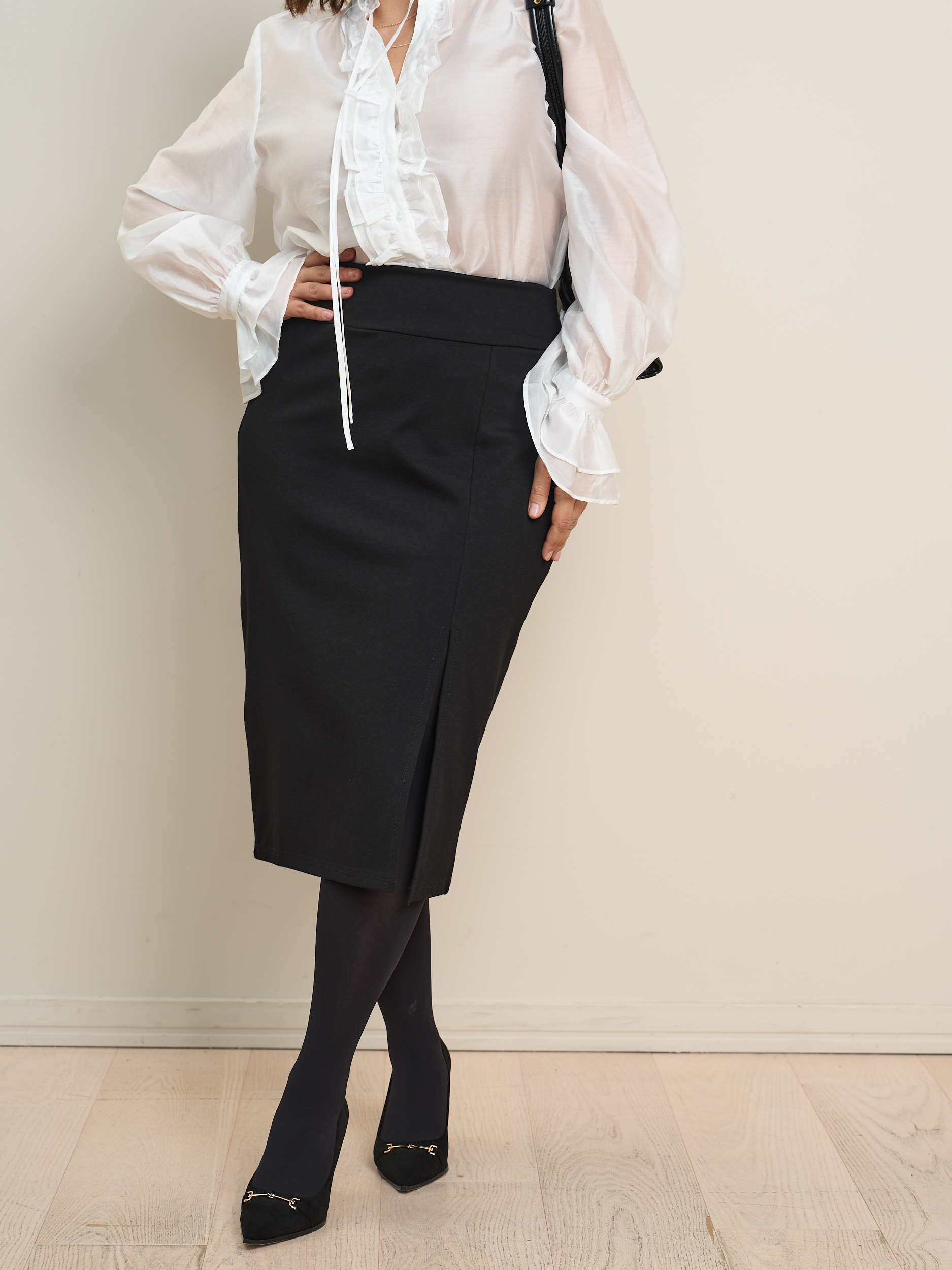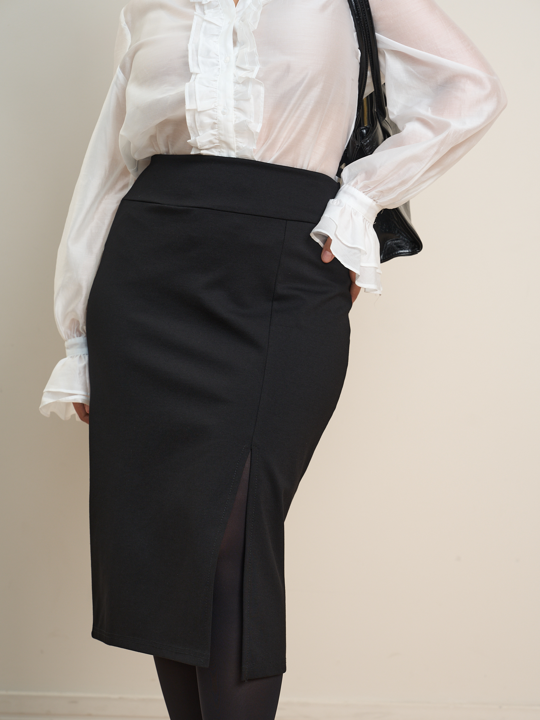 Эффектная юбка-карандаш с разрезом спереди для делового и повседневного гардероба, имеет матовую фактуру материала приятную к телу. Вытягивает силуэт за счет правильного по пропорциям лекала и высокой посадке - эффект удлинения ног и стройной фигуры. Лаконичный крой, высокая посадка на широком поясе, длина мини, разрез спереди. Элегантная модель, которая подчёркивает достоинства фигуры, создаёт женственный силуэт и отлично сочетается с блузами, водолазками и топами в классическом стиле. Материал изделия - плотный стрейч трикотаж. Юбка карандаш представлена в цветах: черная, синяя, олива, капучино. Элемент капсульного гардероба для офиса, похода на свидание, на деловой ужин, и для создания яркого образ Casual. Однотонная, монохромная облегающая офисная юбка карандаш с разрезом прекрасно садится на разные фигуры за счет особенности кроя и эластичности ткани. Универсальная базовая вещь для стильного офисного гардероба плюс сайз.