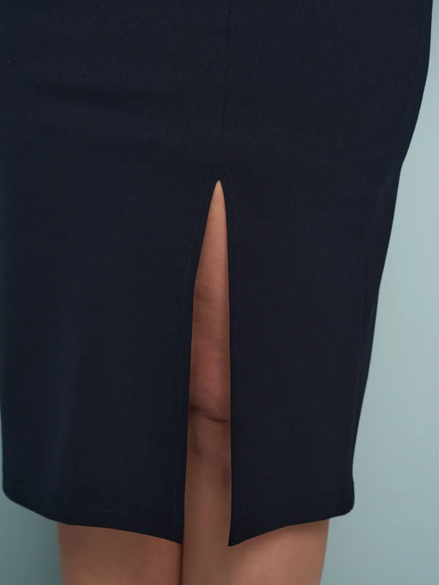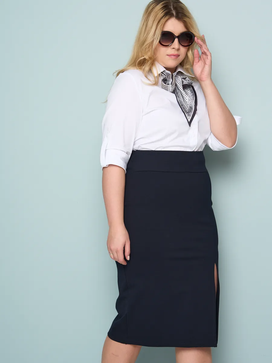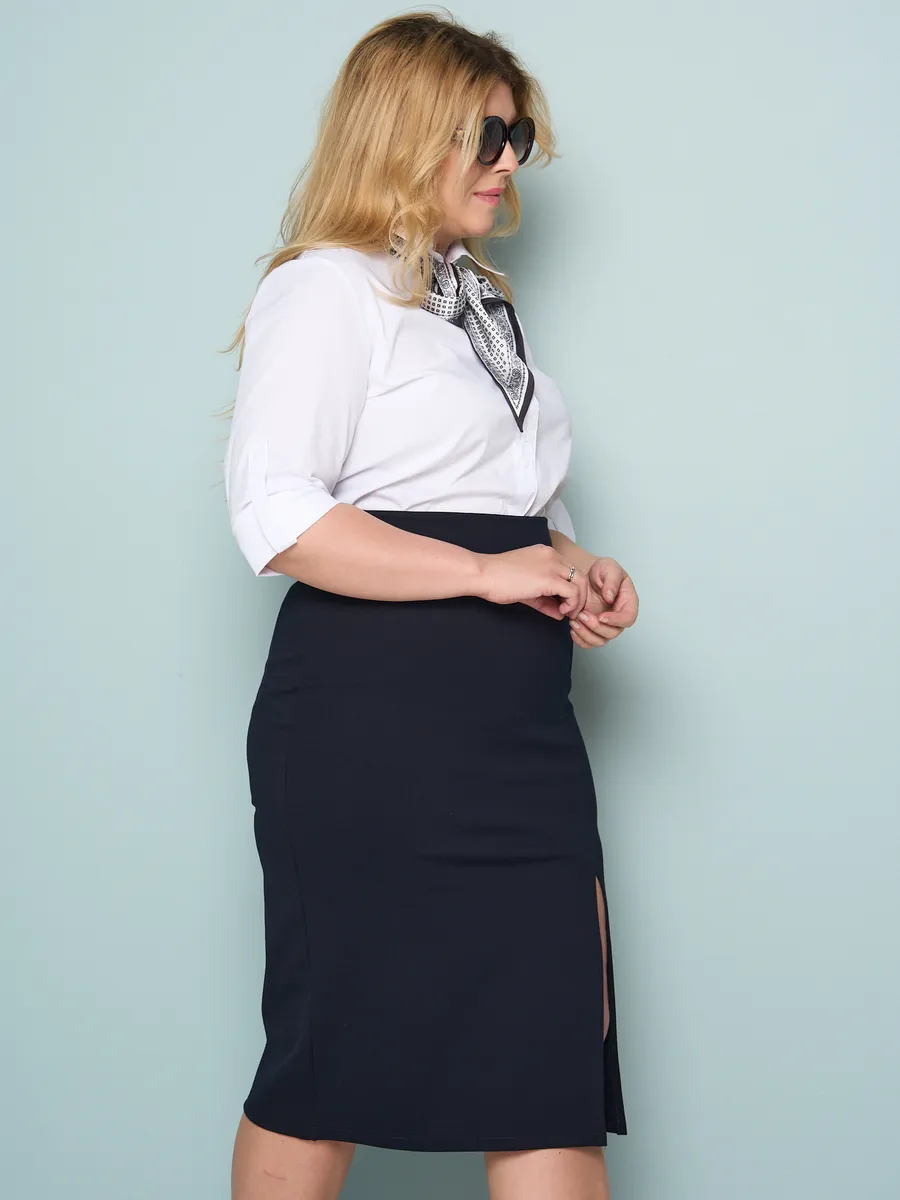 Эффектная юбка-карандаш с разрезом спереди для делового и повседневного гардероба, имеет матовую фактуру материала приятную к телу. Вытягивает силуэт за счет правильного по пропорциям лекала и высокой посадке - эффект удлинения ног и стройной фигуры. Лаконичный крой, высокая посадка на широком поясе, длина мини, разрез спереди. Элегантная модель, которая подчёркивает достоинства фигуры, создаёт женственный силуэт и отлично сочетается с блузами, водолазками и топами в классическом стиле. Материал изделия - плотный стрейч трикотаж. Юбка карандаш представлена в цветах: черная, синяя, олива, капучино. Элемент капсульного гардероба для офиса, похода на свидание, на деловой ужин, и для создания яркого образ Casual. Однотонная, монохромная облегающая офисная юбка карандаш с разрезом прекрасно садится на разные фигуры за счет особенности кроя и эластичности ткани. Универсальная базовая вещь для стильного офисного гардероба плюс сайз.