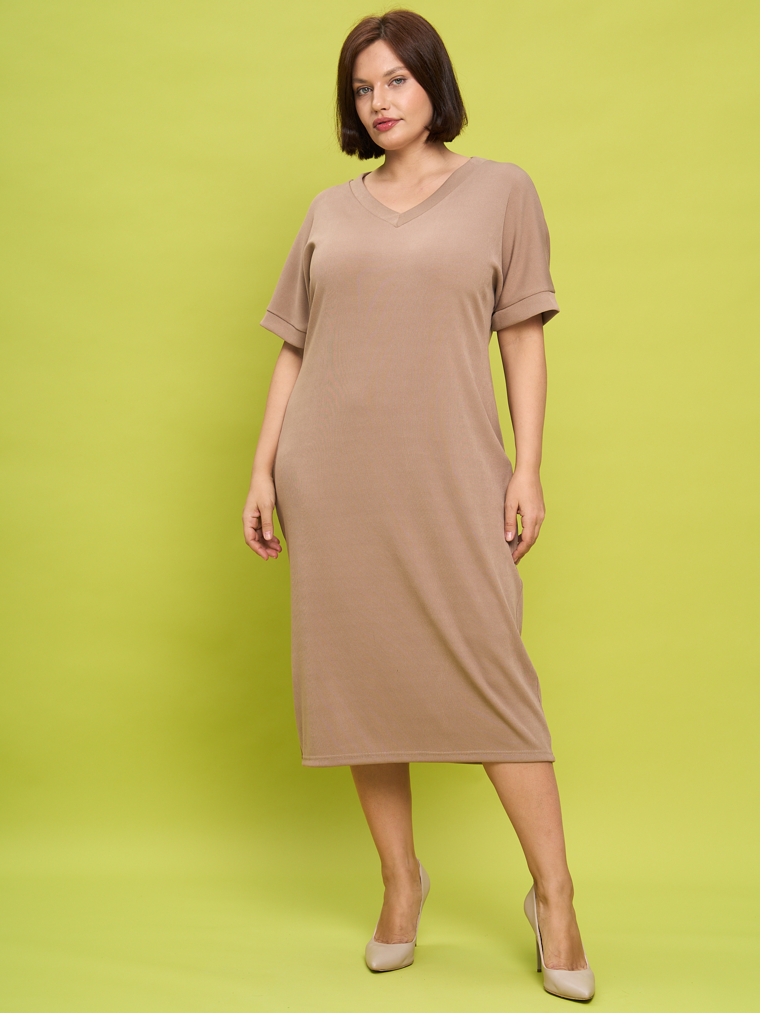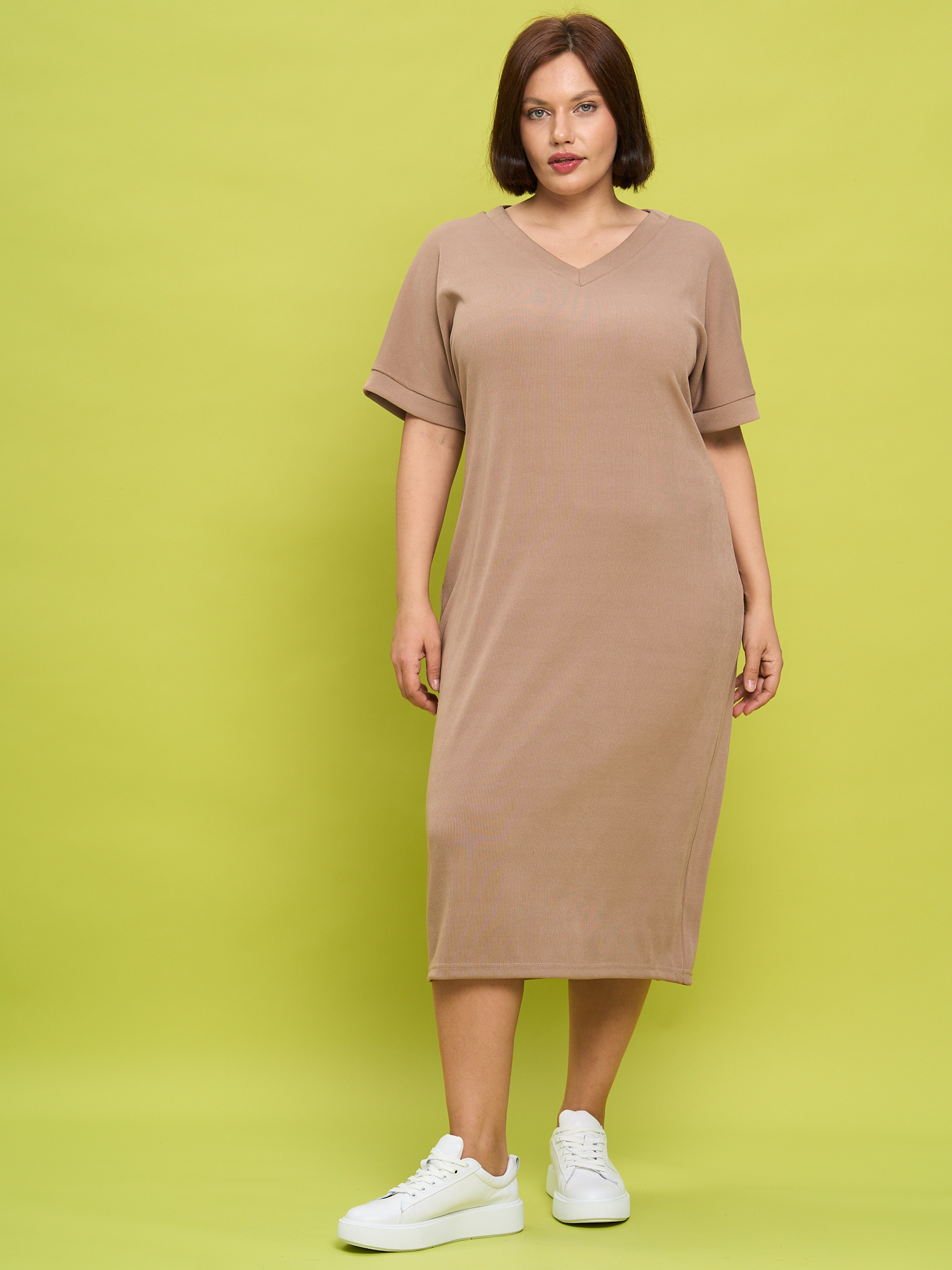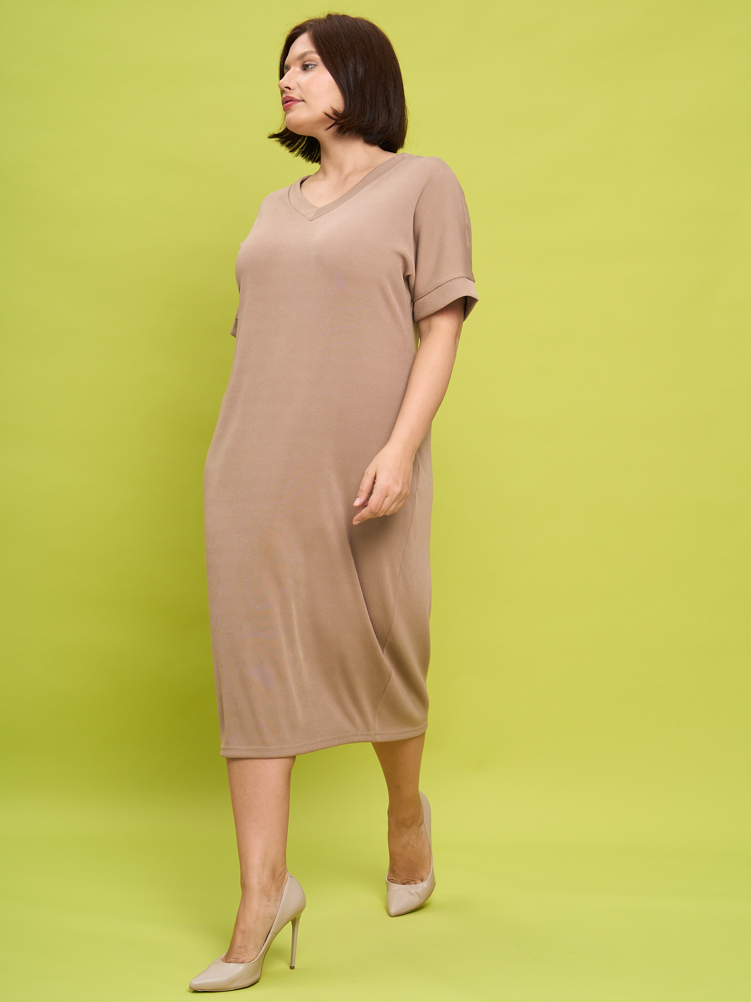 Повседневное платье. Полуприлегающий крой. Воротник - V-образный. Спущенный рукав. Длина миди. Ткань - летний трикотаж лапша.
