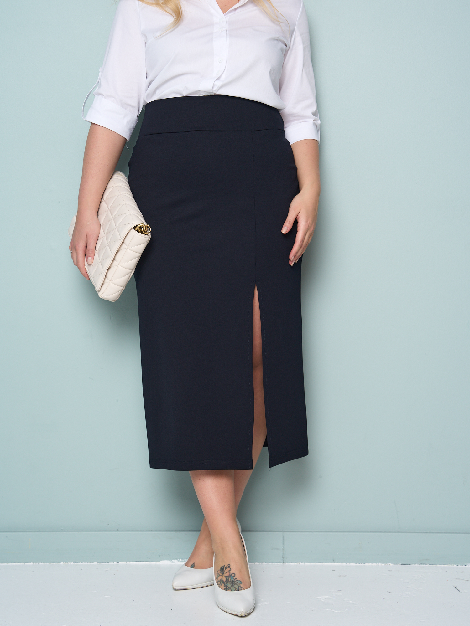 Эффектная юбка-карандаш с разрезом спереди для делового и повседневного гардероба, имеет матовую фактуру материала приятную к телу. Вытягивает силуэт за счет правильного по пропорциям лекала и высокой посадке - эффект удлинения ног и стройной фигуры. Лаконичный крой, высокая посадка на широком поясе, длина мини, разрез спереди. Элегантная модель, которая подчёркивает достоинства фигуры, создаёт женственный силуэт и отлично сочетается с блузами, водолазками и топами в классическом стиле. Материал изделия - плотный стрейч трикотаж. Юбка карандаш представлена в цветах: черная, синяя, олива, капучино. Элемент капсульного гардероба для офиса, похода на свидание, на деловой ужин, и для создания яркого образ Casual. Однотонная, монохромная облегающая офисная юбка карандаш с разрезом прекрасно садится на разные фигуры за счет особенности кроя и эластичности ткани. Универсальная базовая вещь для стильного офисного гардероба плюс сайз.