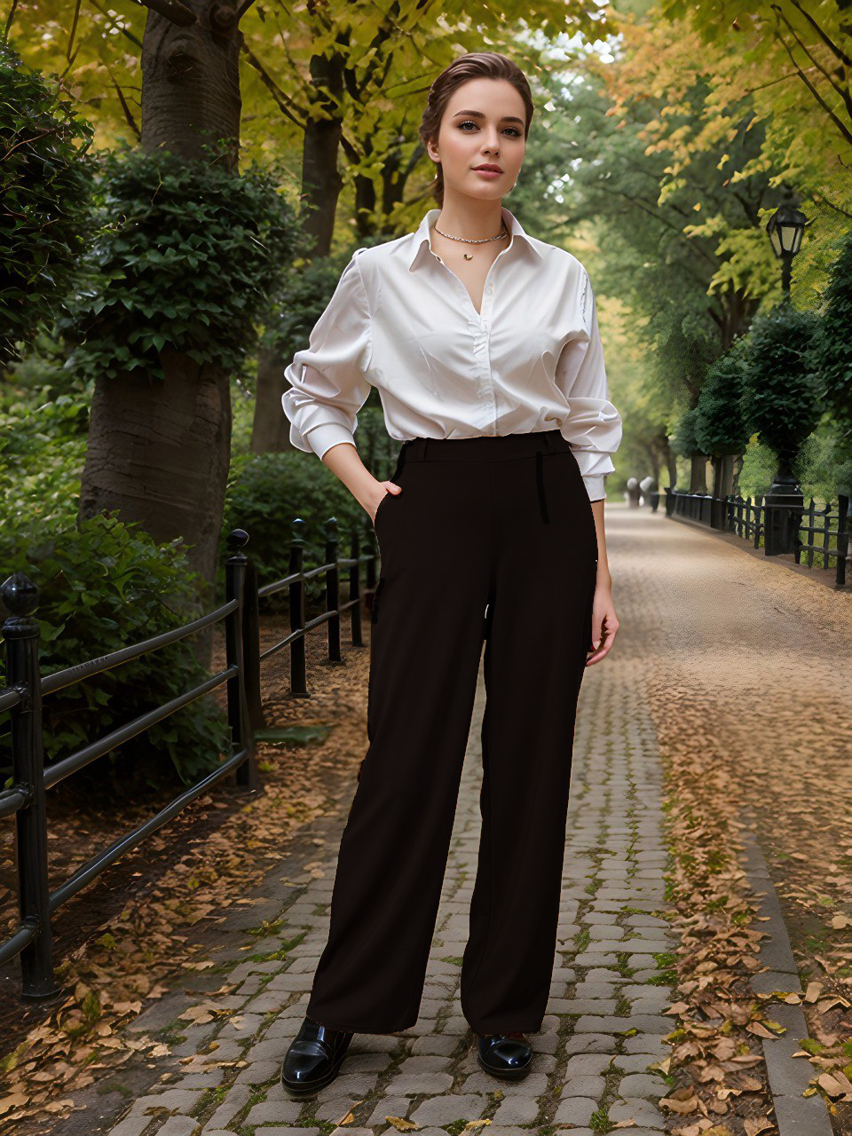 Классические брюки офисные в современной обработке в стиле палаццо. Высокая посадка, пояс на резинке, брючина прямая широкая, модель "трубы". Карманы с отрезным бочком. Ткань - костюмный трикотаж с гладкой фактурой. Без звтсежек и молний.