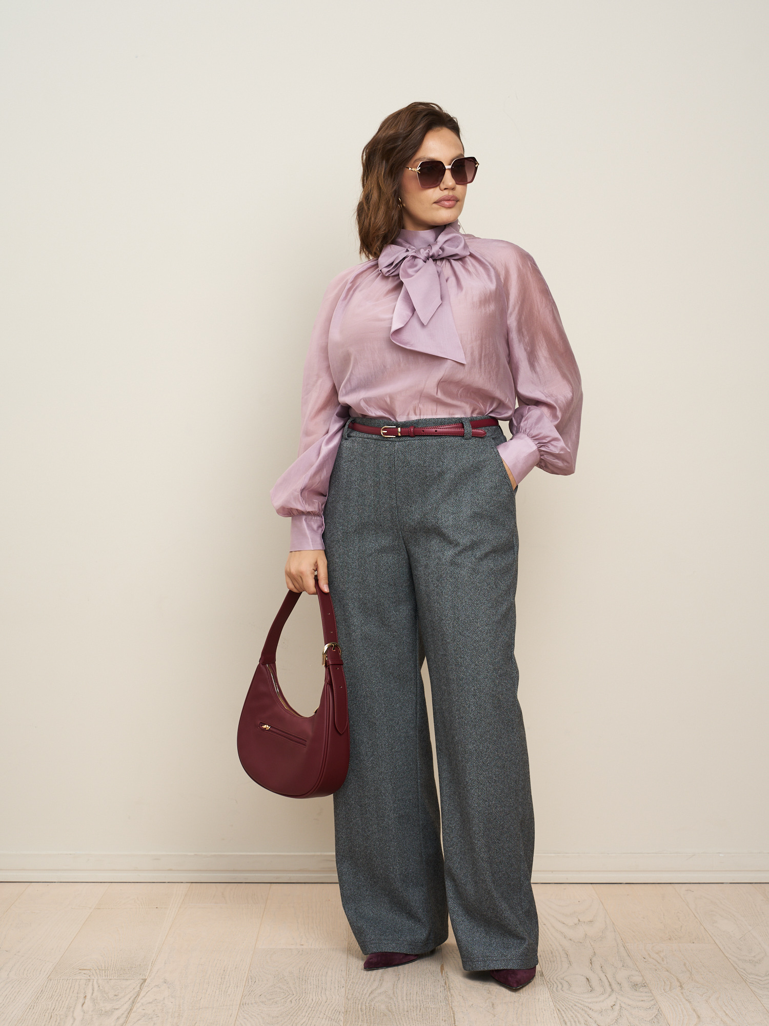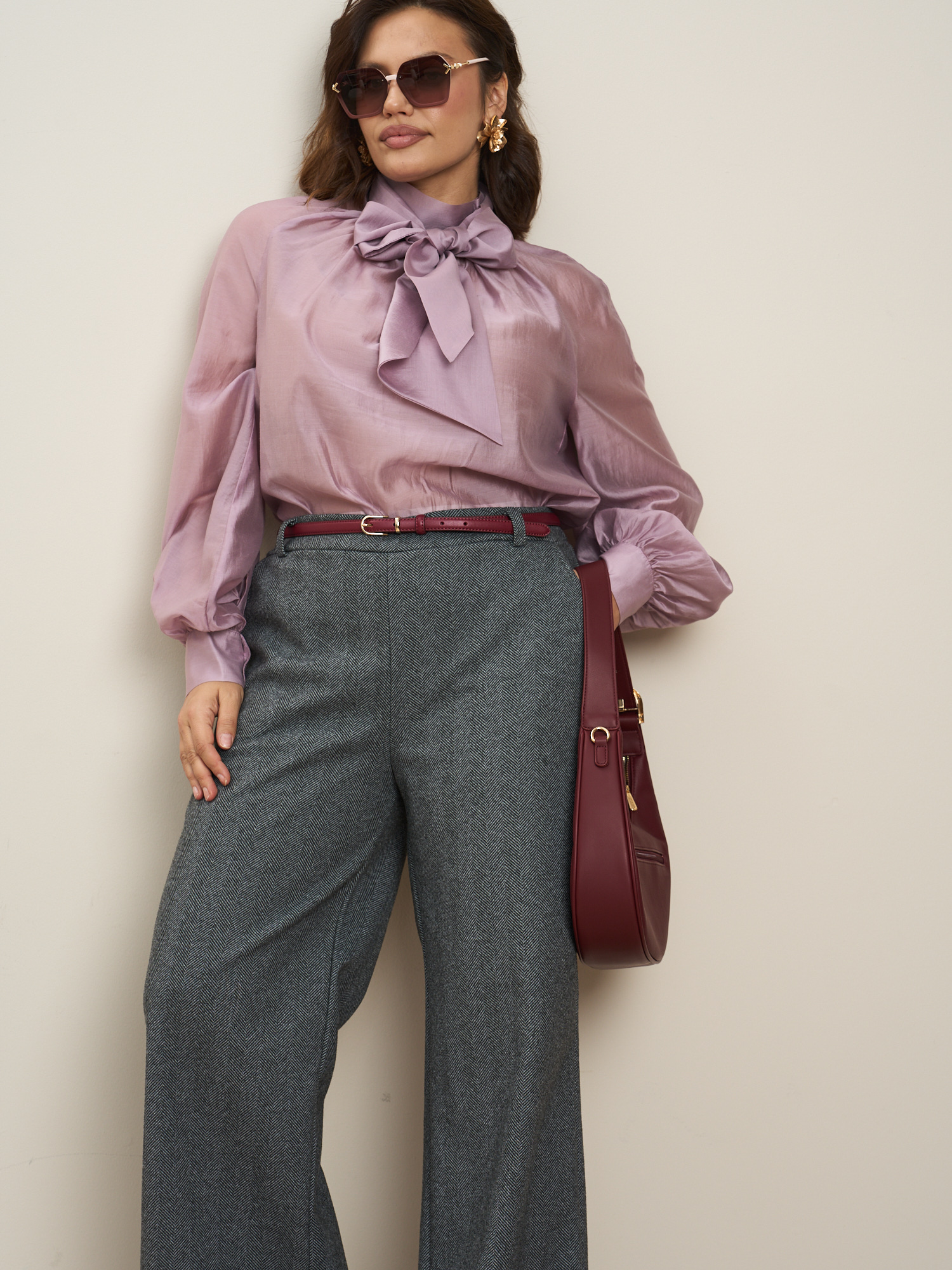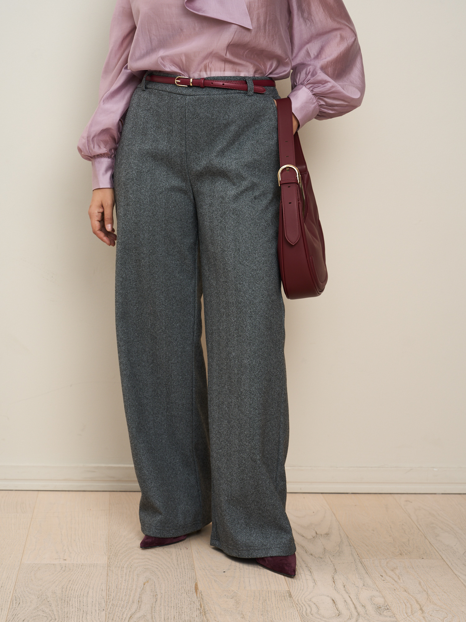 Классические брюки офисные в современной обработке в стиле палаццо. Ткань - плотный трикотаж с жаккардовой текстурой Ёлочка. Брюки теплые на очень-зиму. Без звтсежек и молний. Высокая посадка, пояс на резинке, брючина прямая широкая, модель "трубы". Карманы с отрезным бочком.
