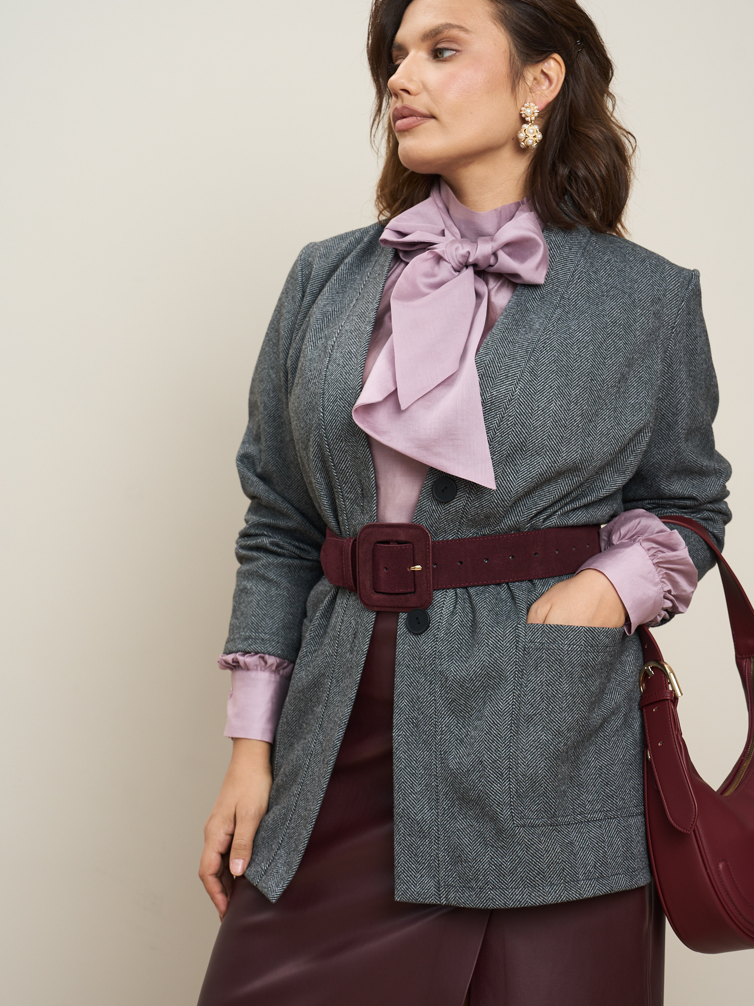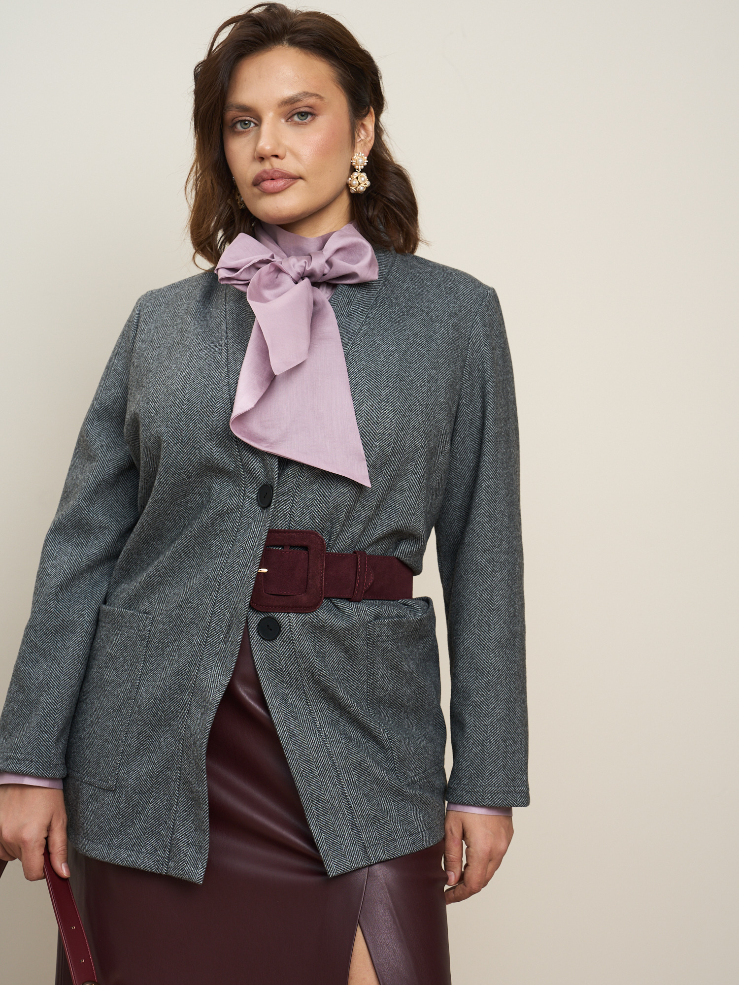 Жакет кардиган из костюмного трикотажного полотна.Ткань - плотный трикотаж с жаккардовой текстурой Ёлочка, теплая - на очень-зиму. Посадка легкий оверсайз. Накладные карманы. Без подклада.