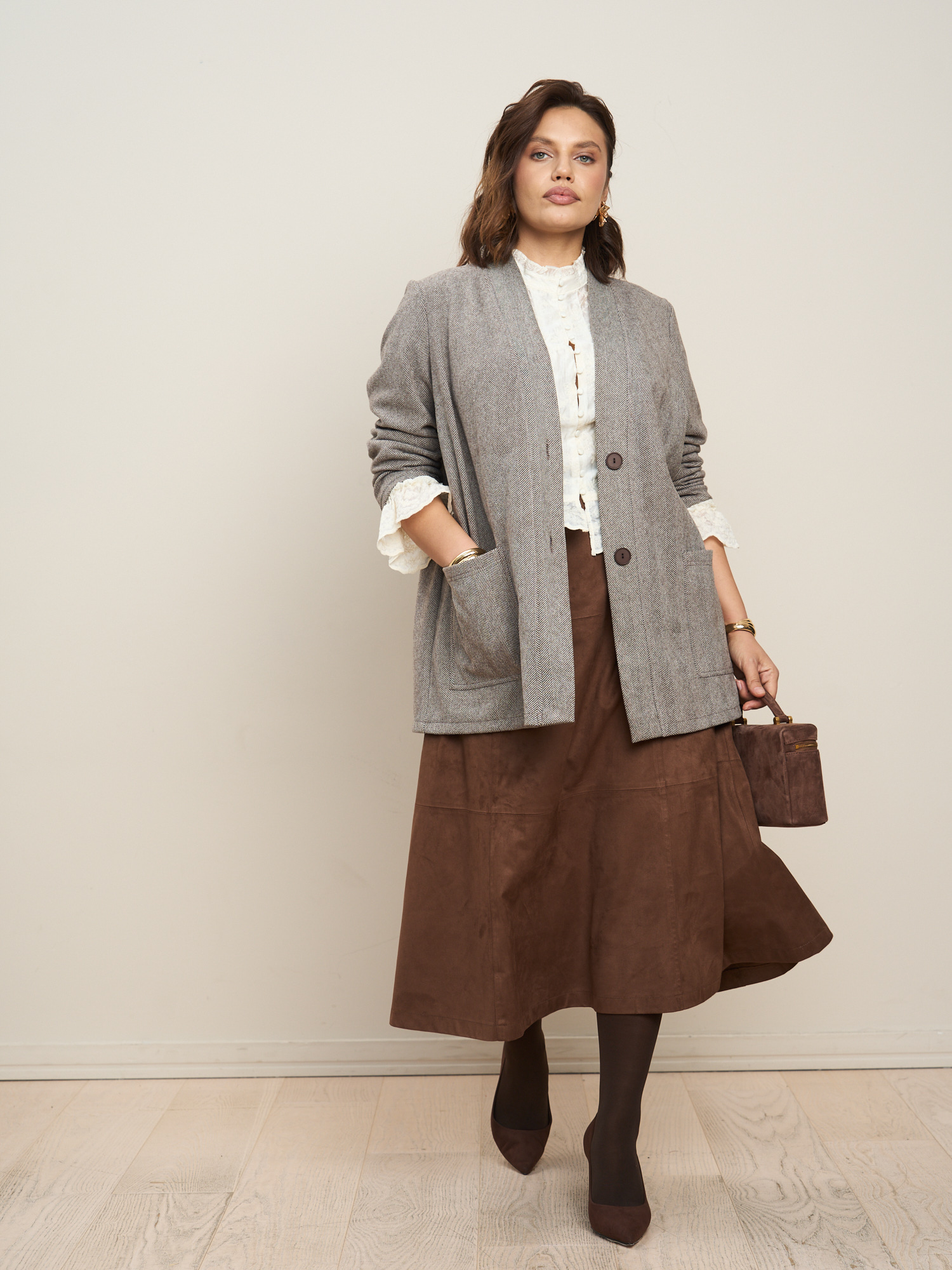 Жакет кардиган из костюмного трикотажного полотна.Ткань - плотный трикотаж с жаккардовой текстурой Ёлочка, теплая - на очень-зиму. Посадка легкий оверсайз. Накладные карманы. Без подклада.