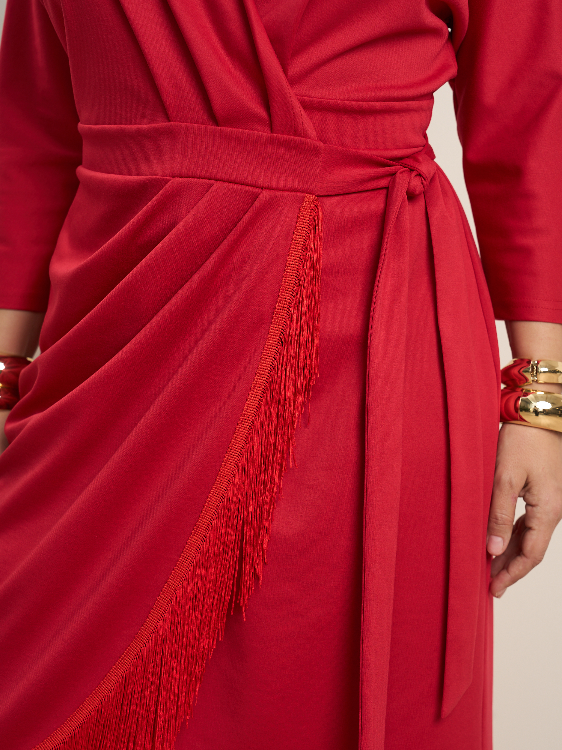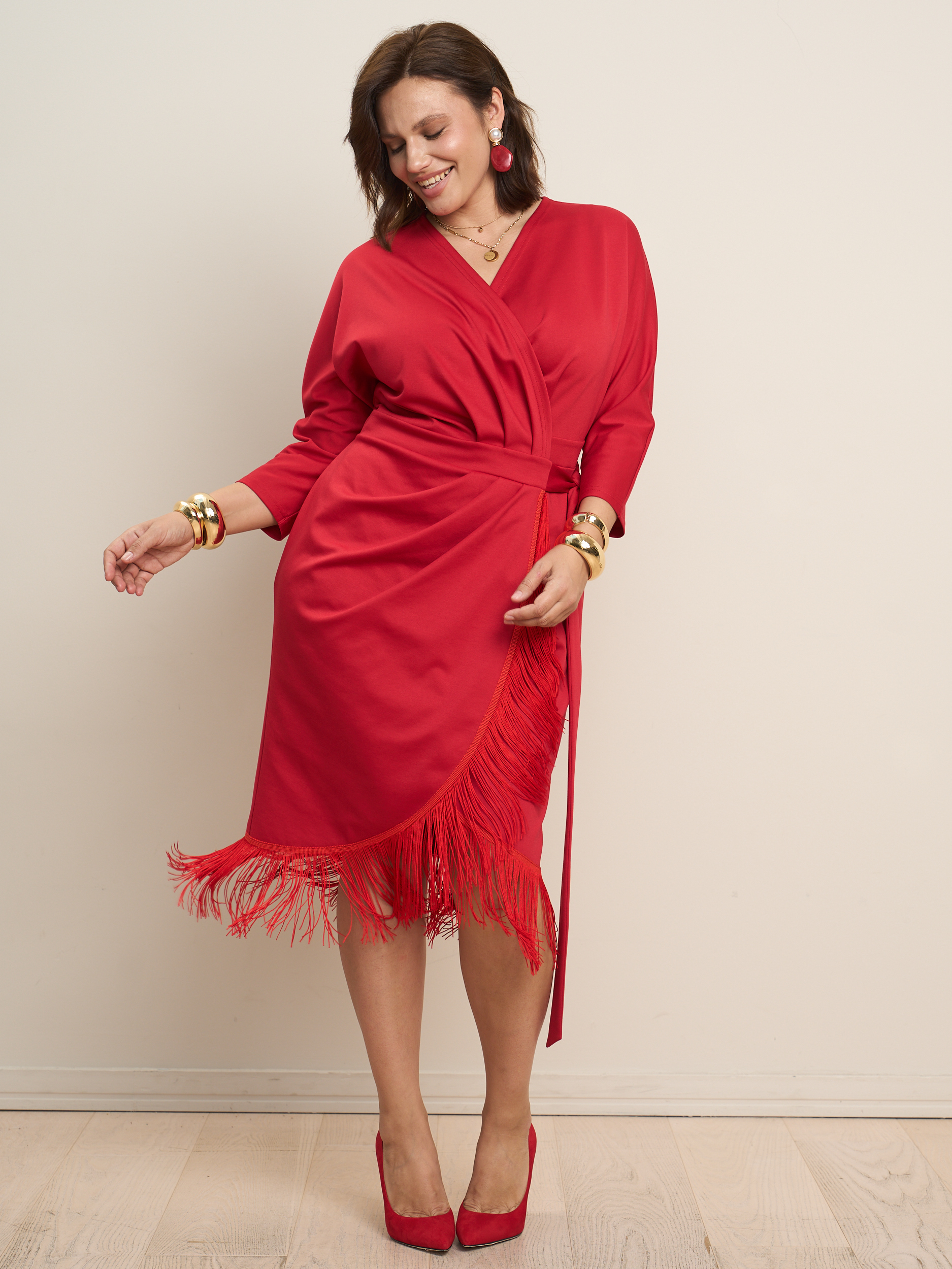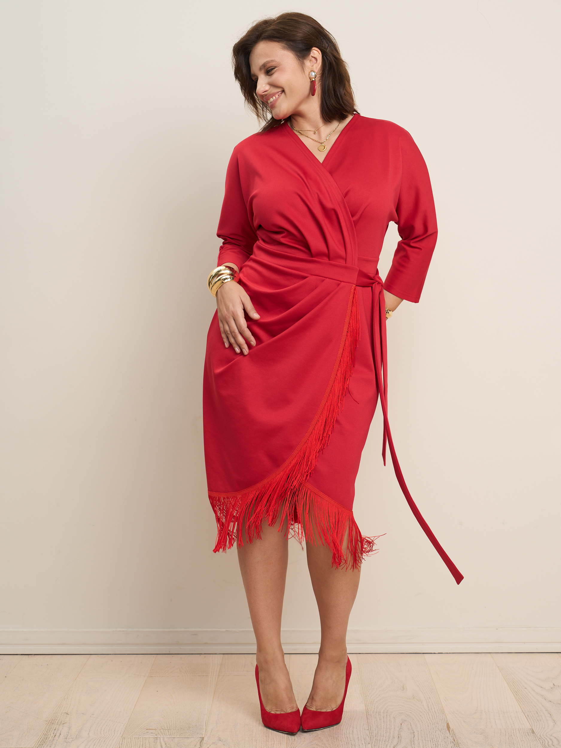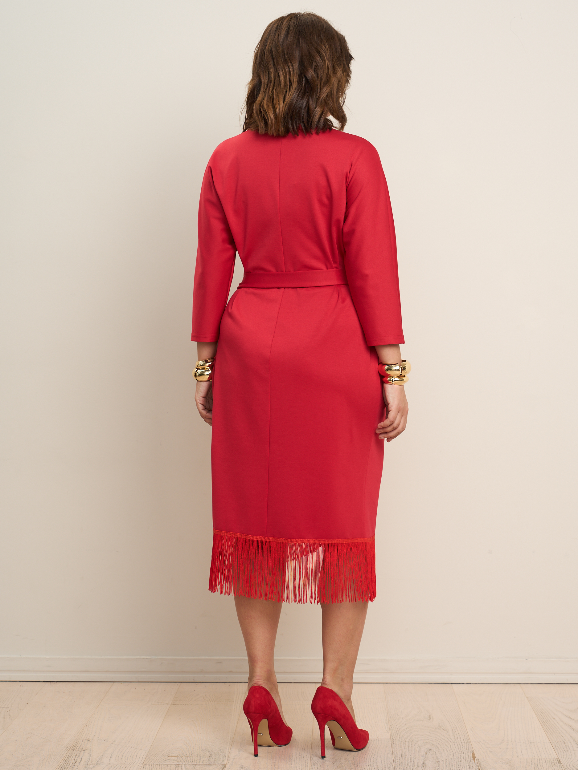Платье на запах миди с бахромой. V - образеый врез горловины. Прилегающий силуэт с подчеркнутой талией. Низ платья декорирован бахрамой. Ткань - джерси с эластичными свойствами.