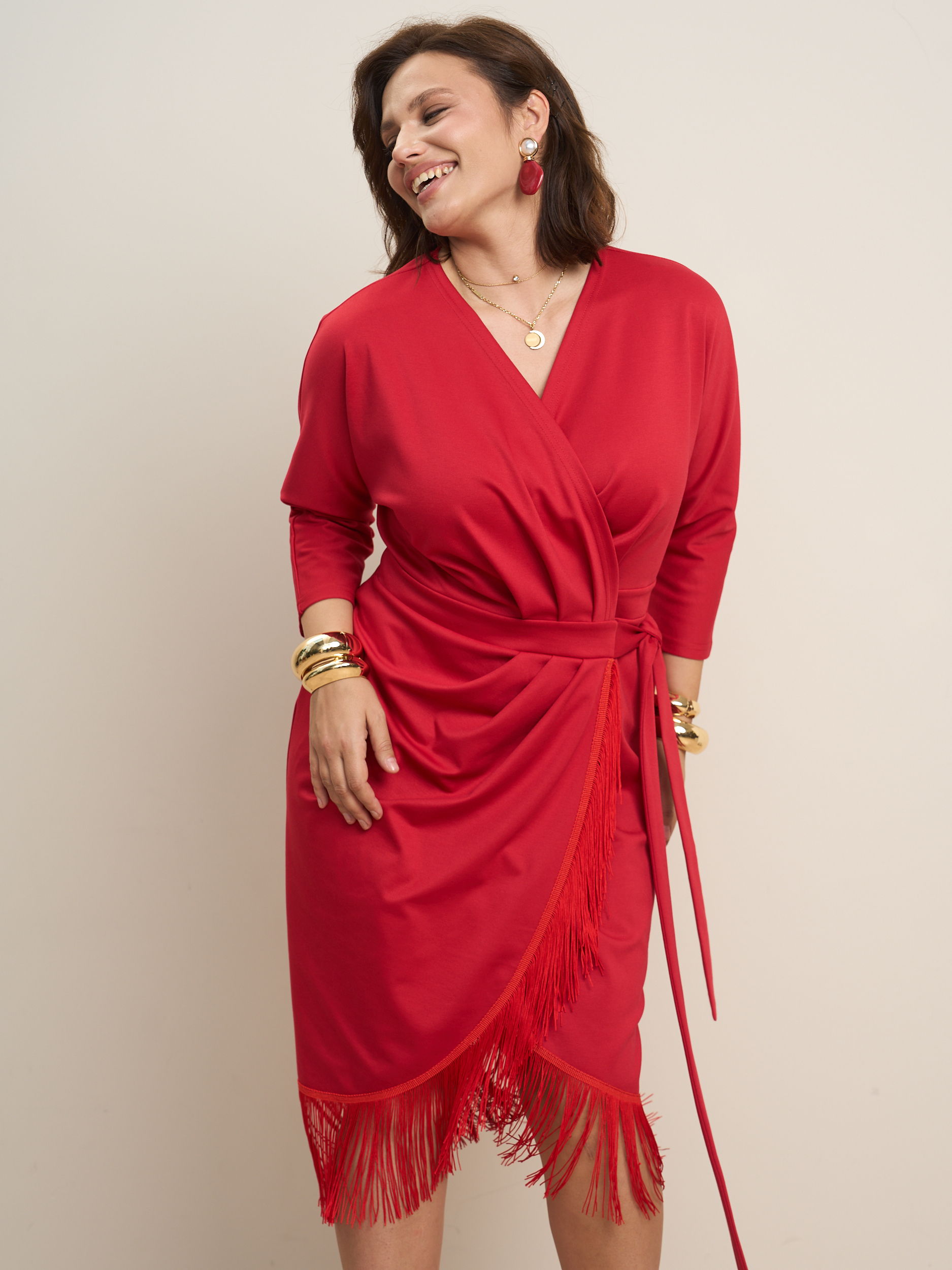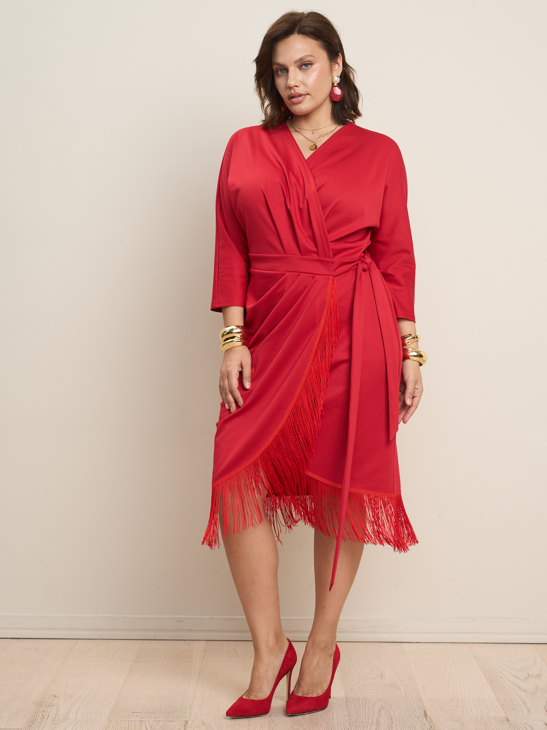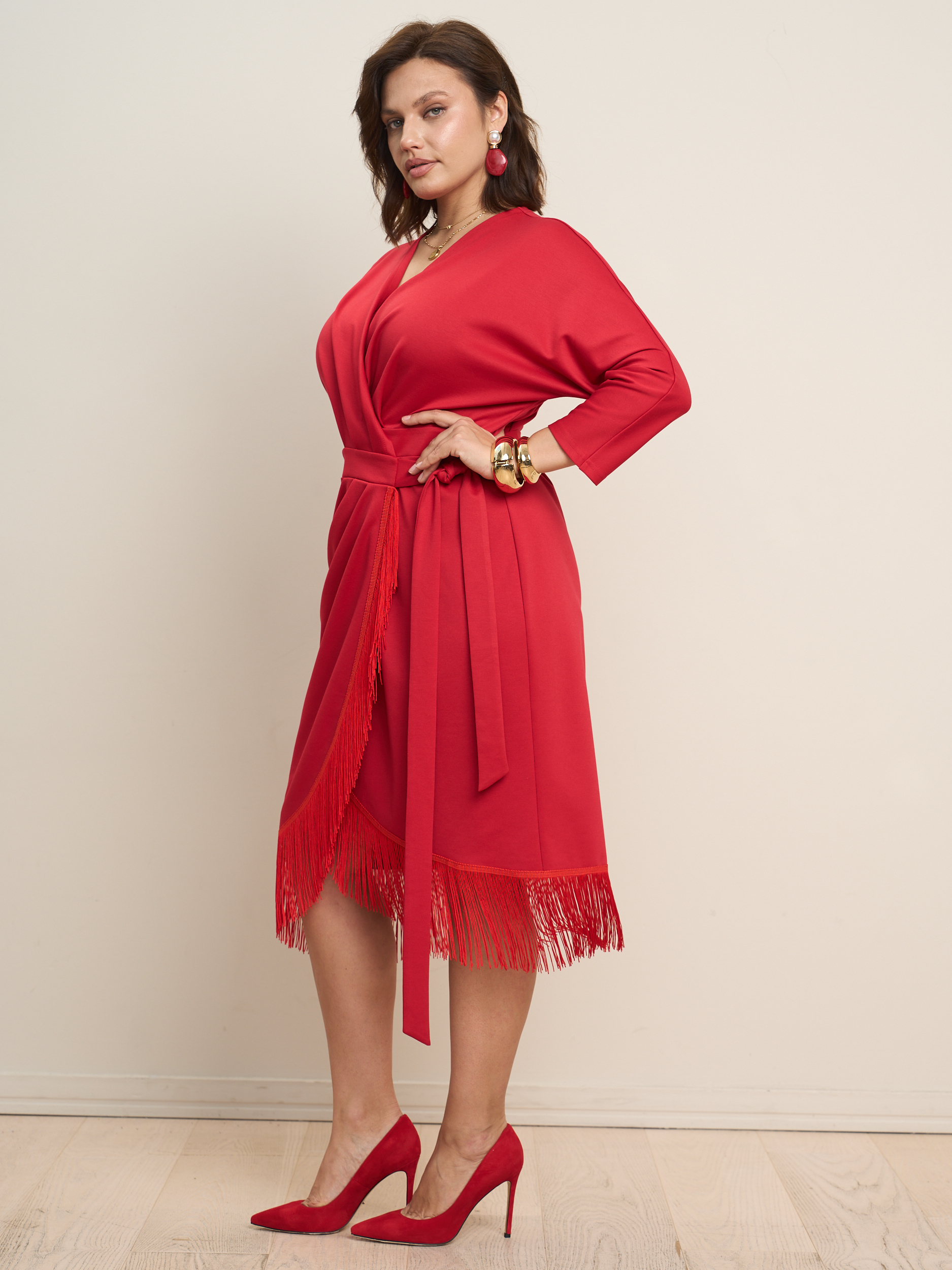 Платье на запах миди с бахромой. V - образеый врез горловины. Прилегающий силуэт с подчеркнутой талией. Низ платья декорирован бахрамой. Ткань - джерси с эластичными свойствами.
