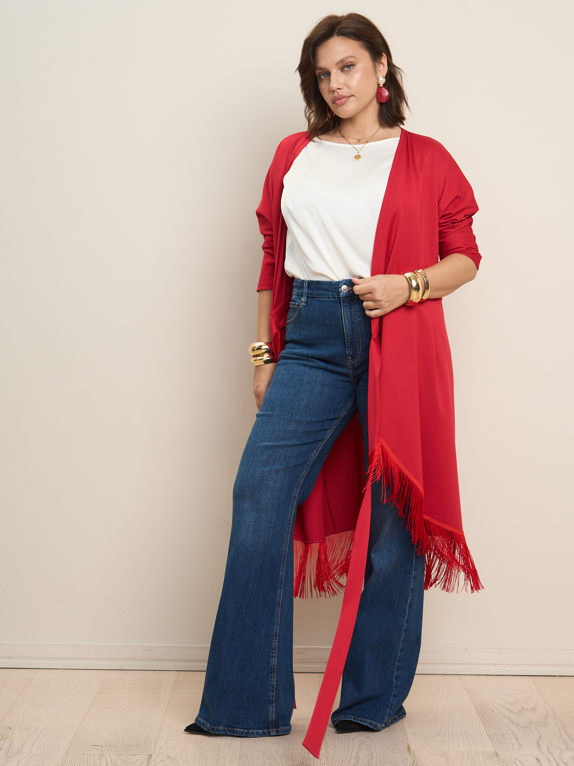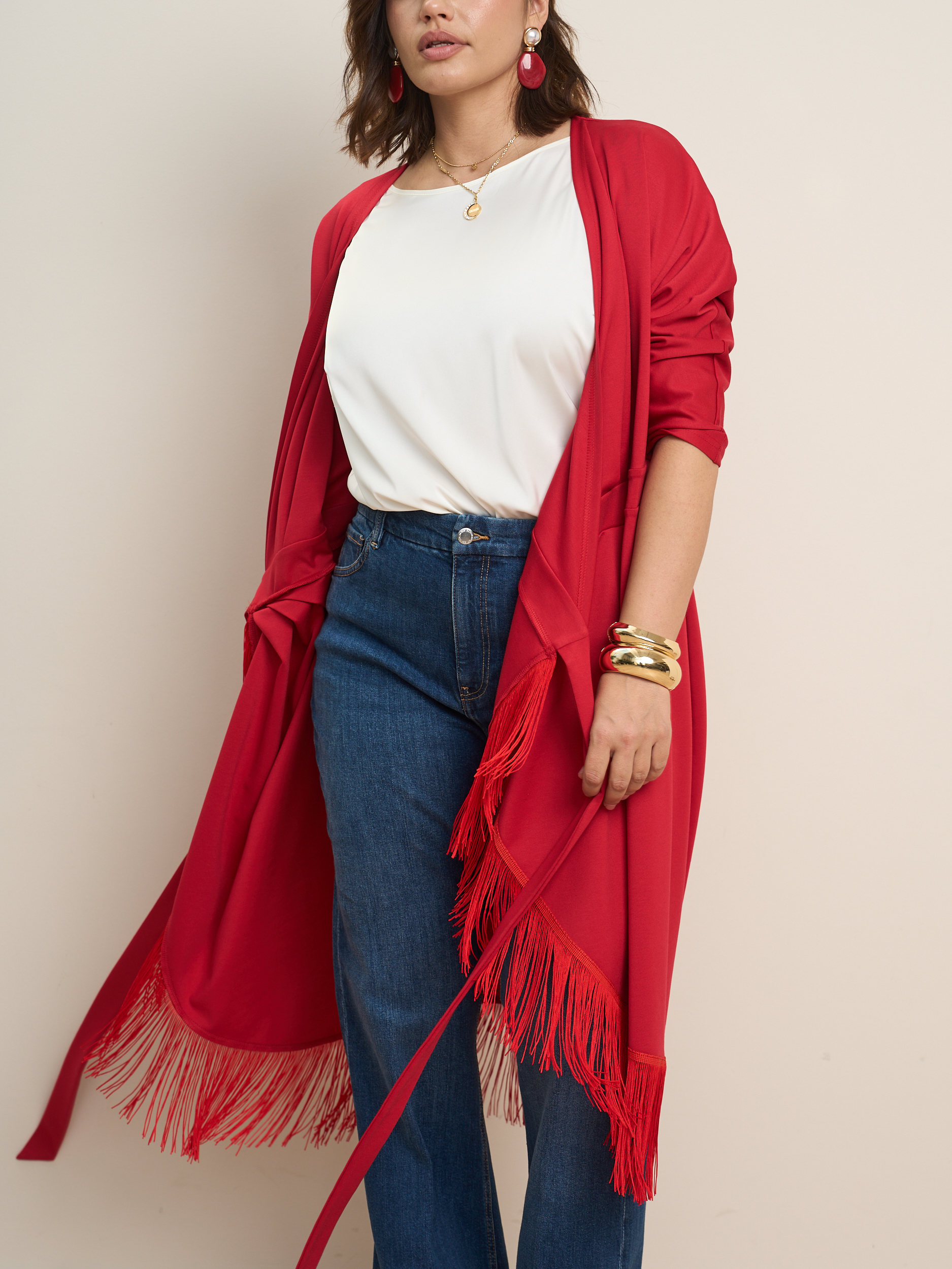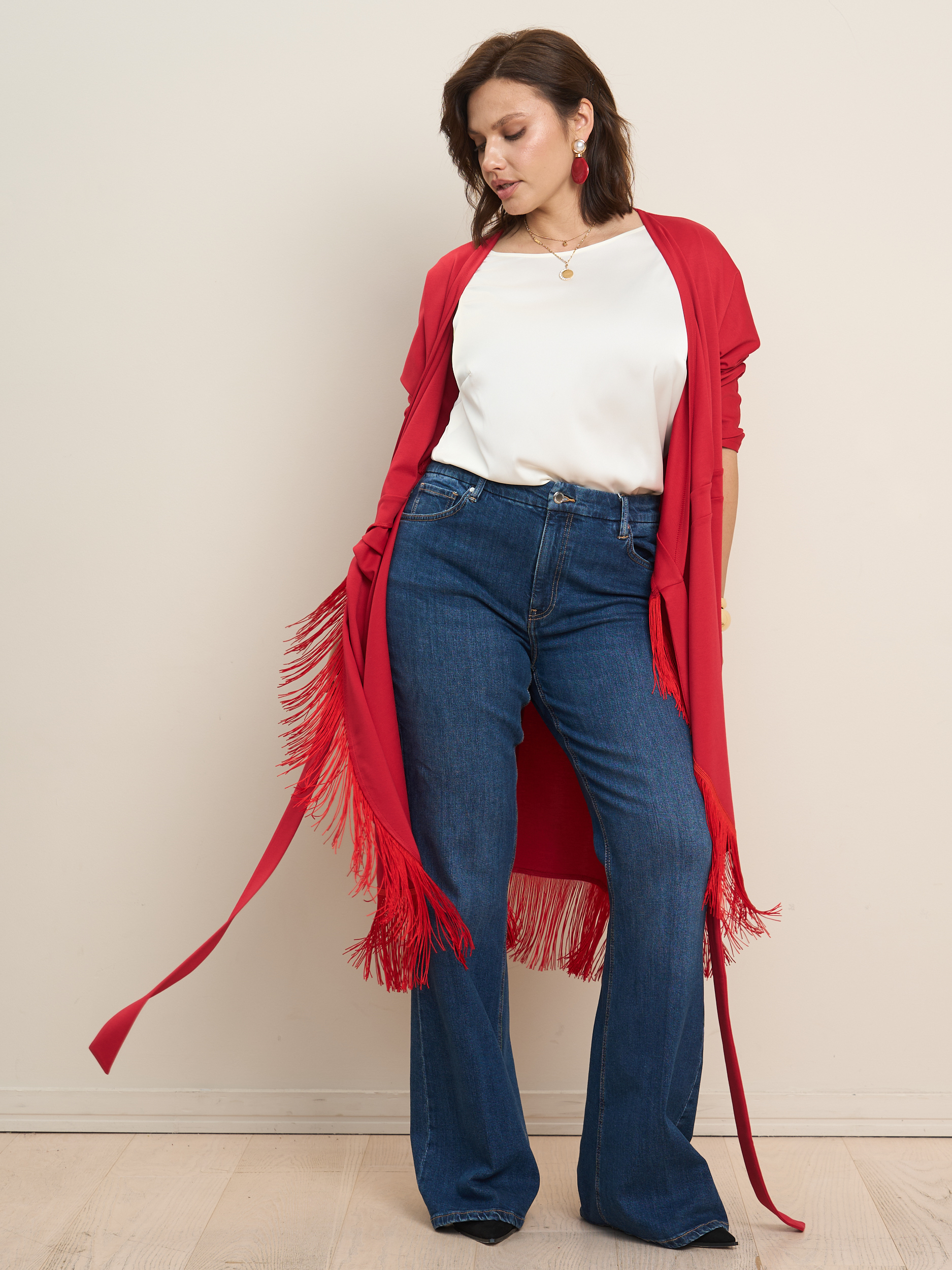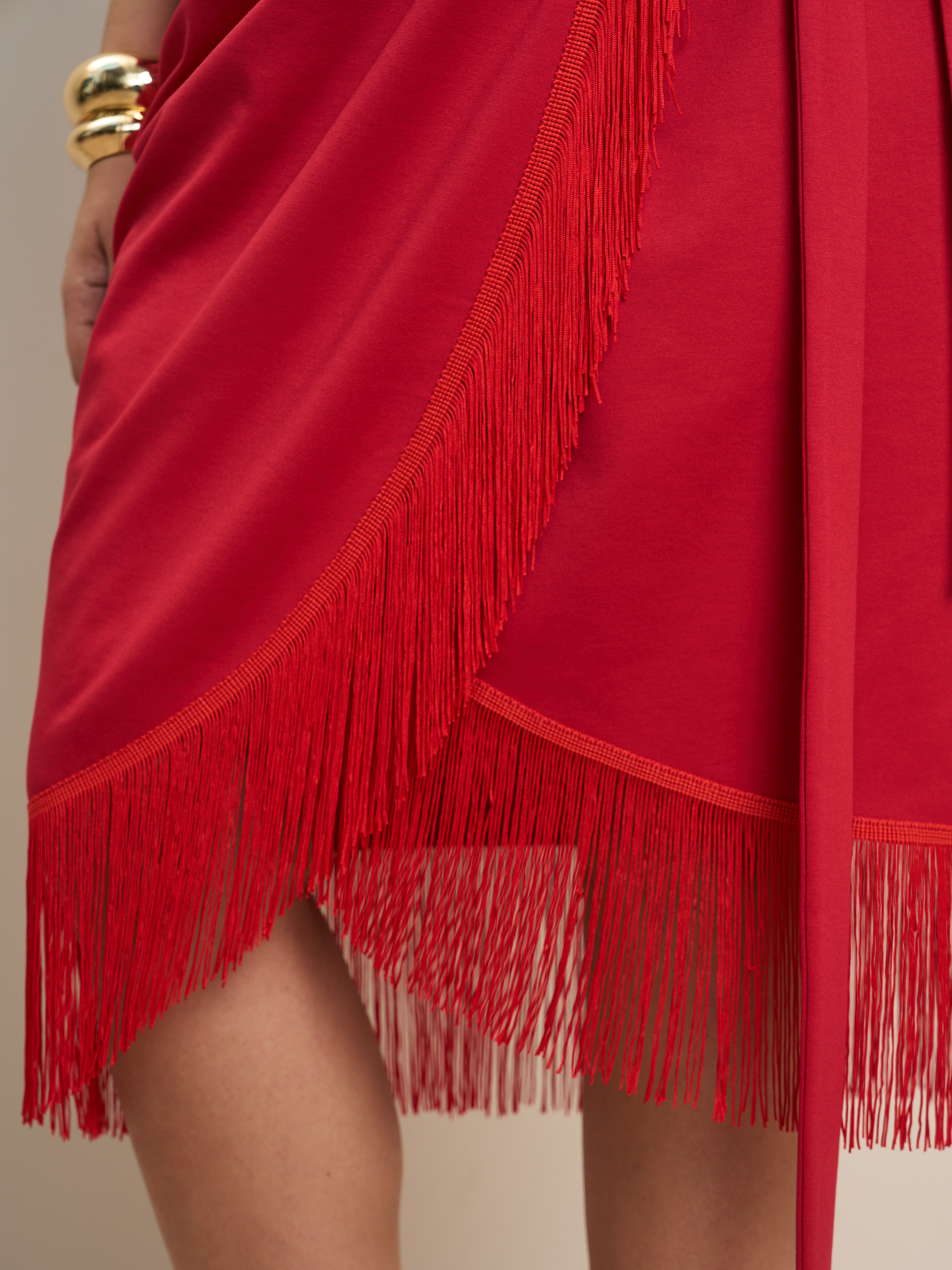 Платье на запах миди с бахромой. V - образеый врез горловины. Прилегающий силуэт с подчеркнутой талией. Низ платья декорирован бахрамой. Ткань - джерси с эластичными свойствами.