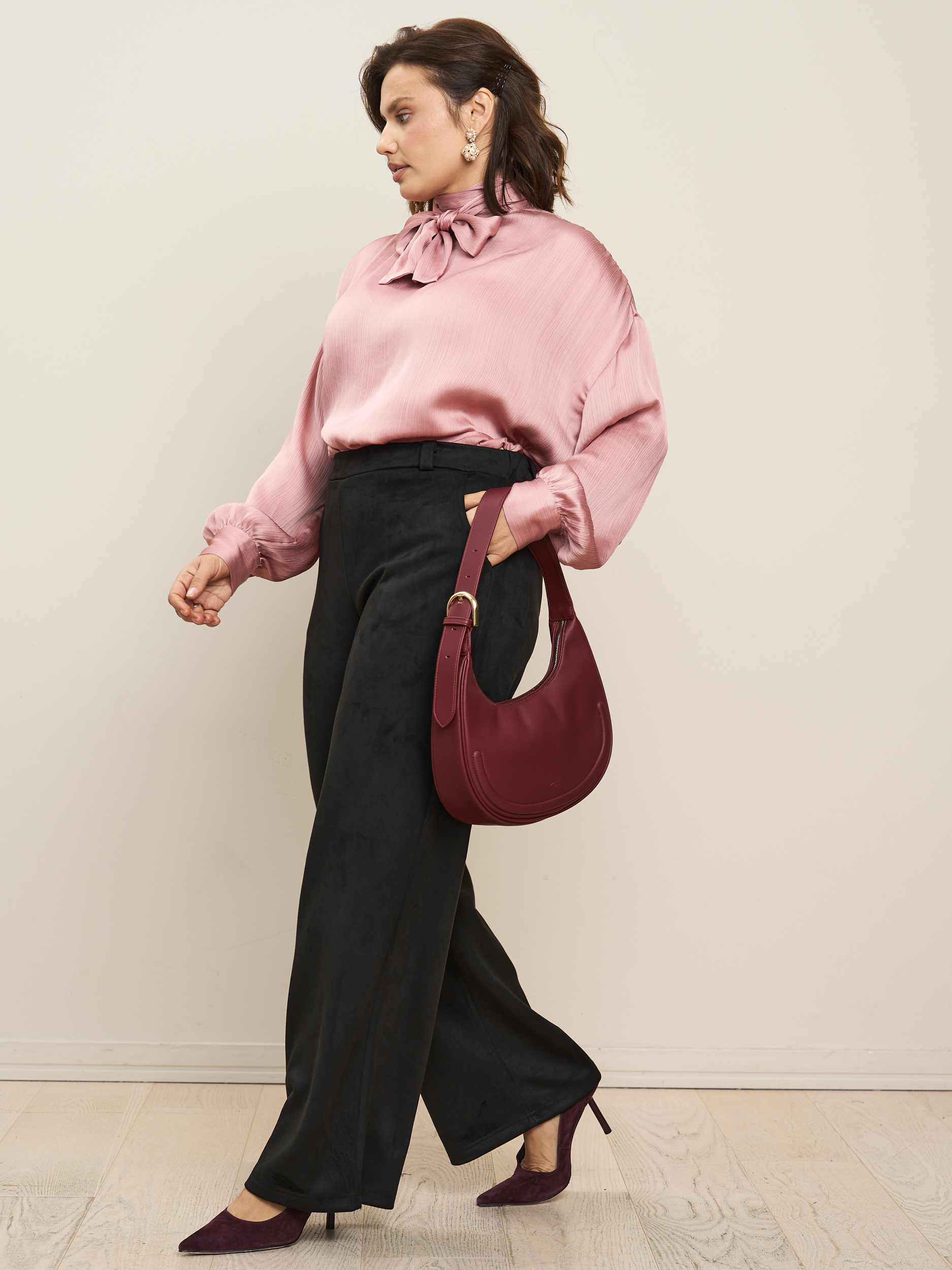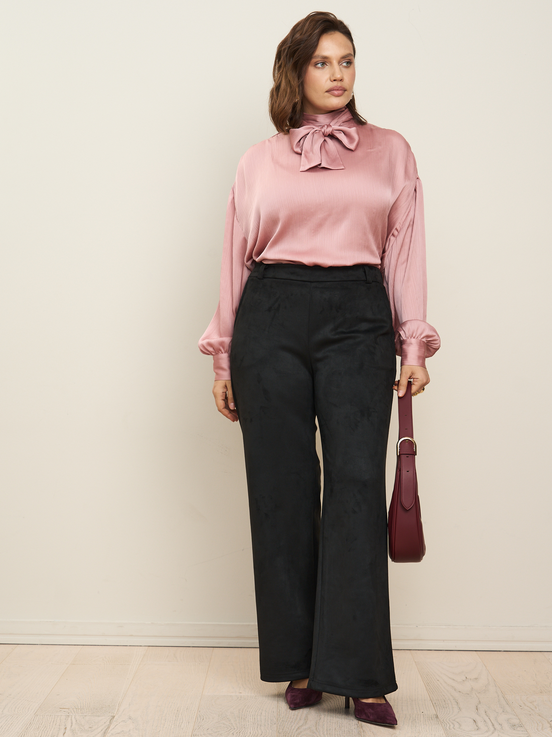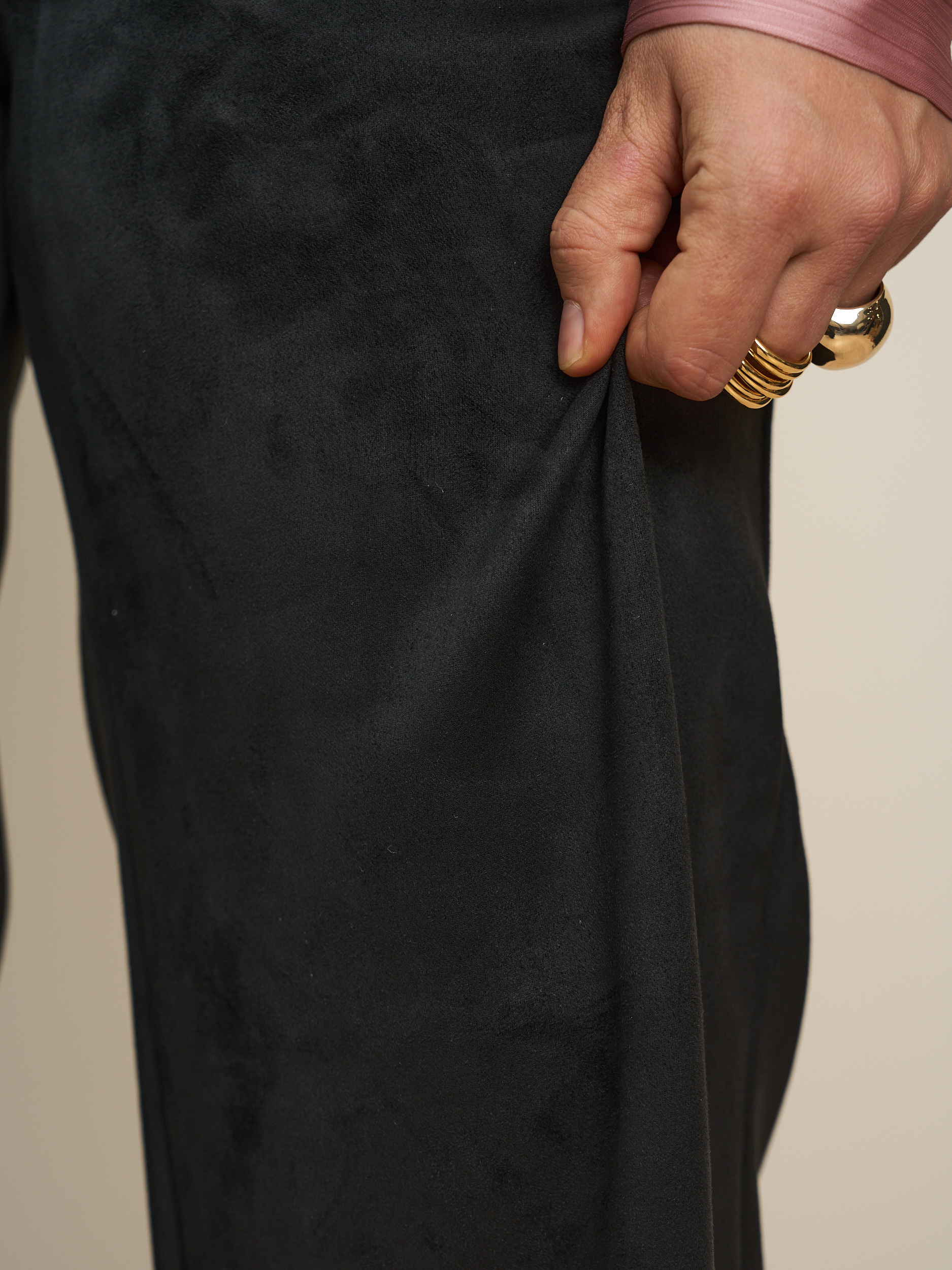 Классические замшевые брюки офисные в современной обработке в стиле палаццо. Высокая посадка, пояс на резинке, брючина прямая широкая, модель "трубы". Карманы с отрезным бочком. Ткань - экозамша на трикотажной основе. Без затсежек и молний.