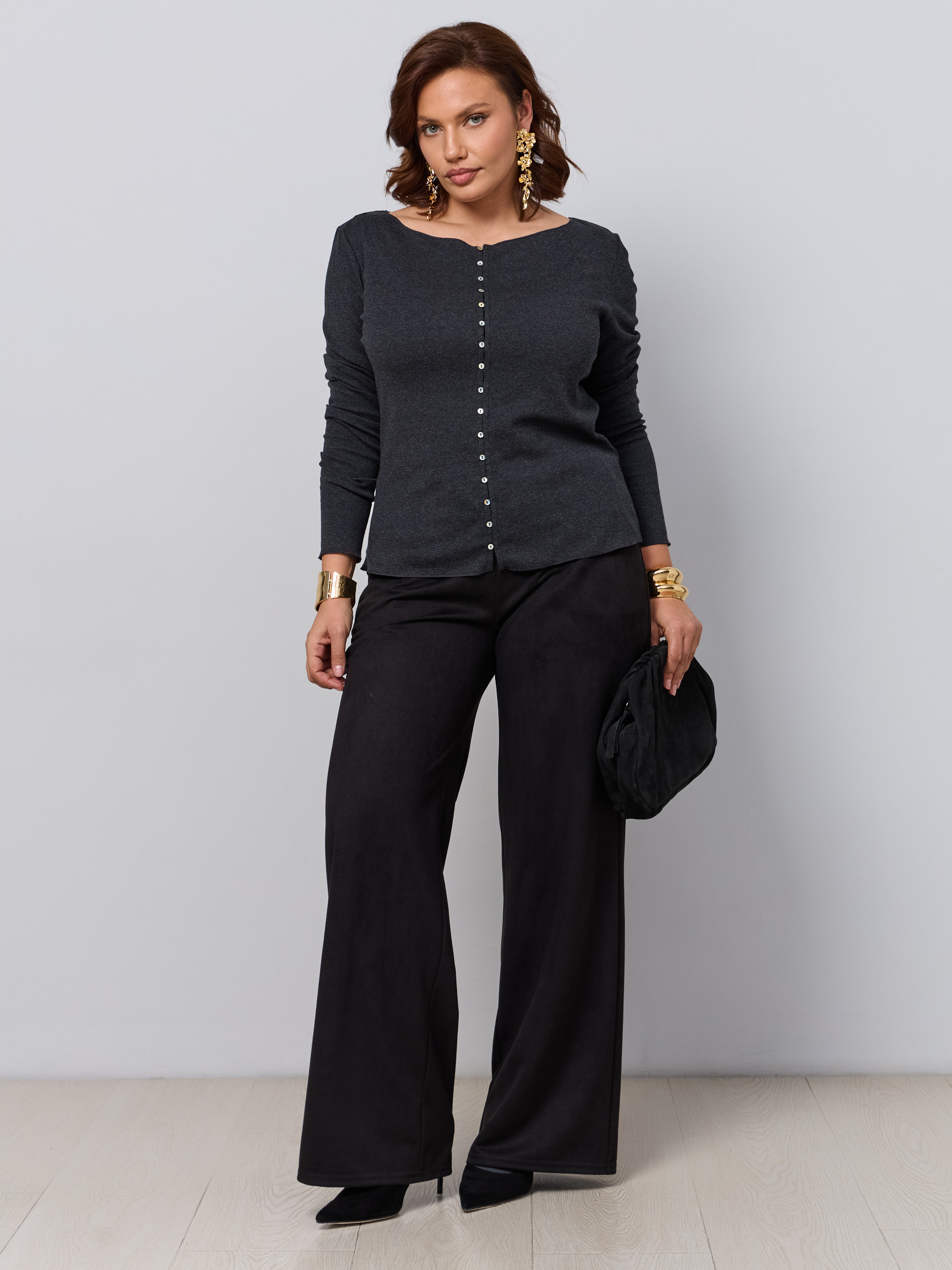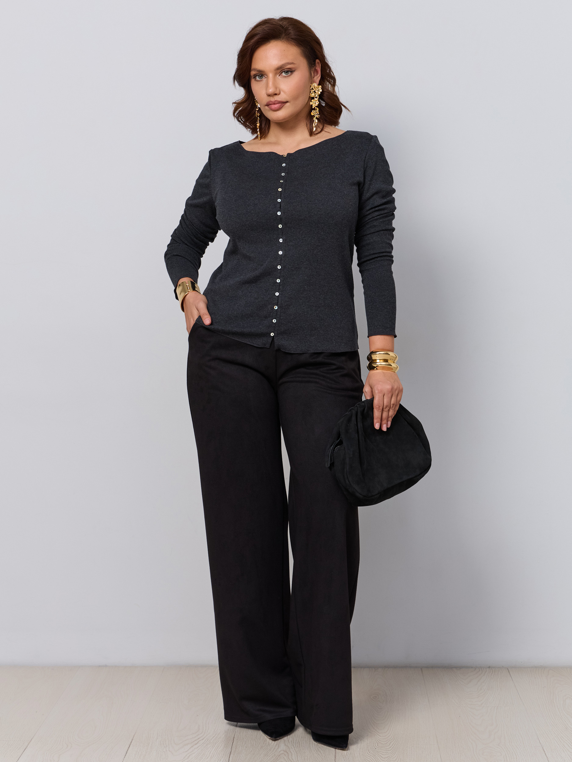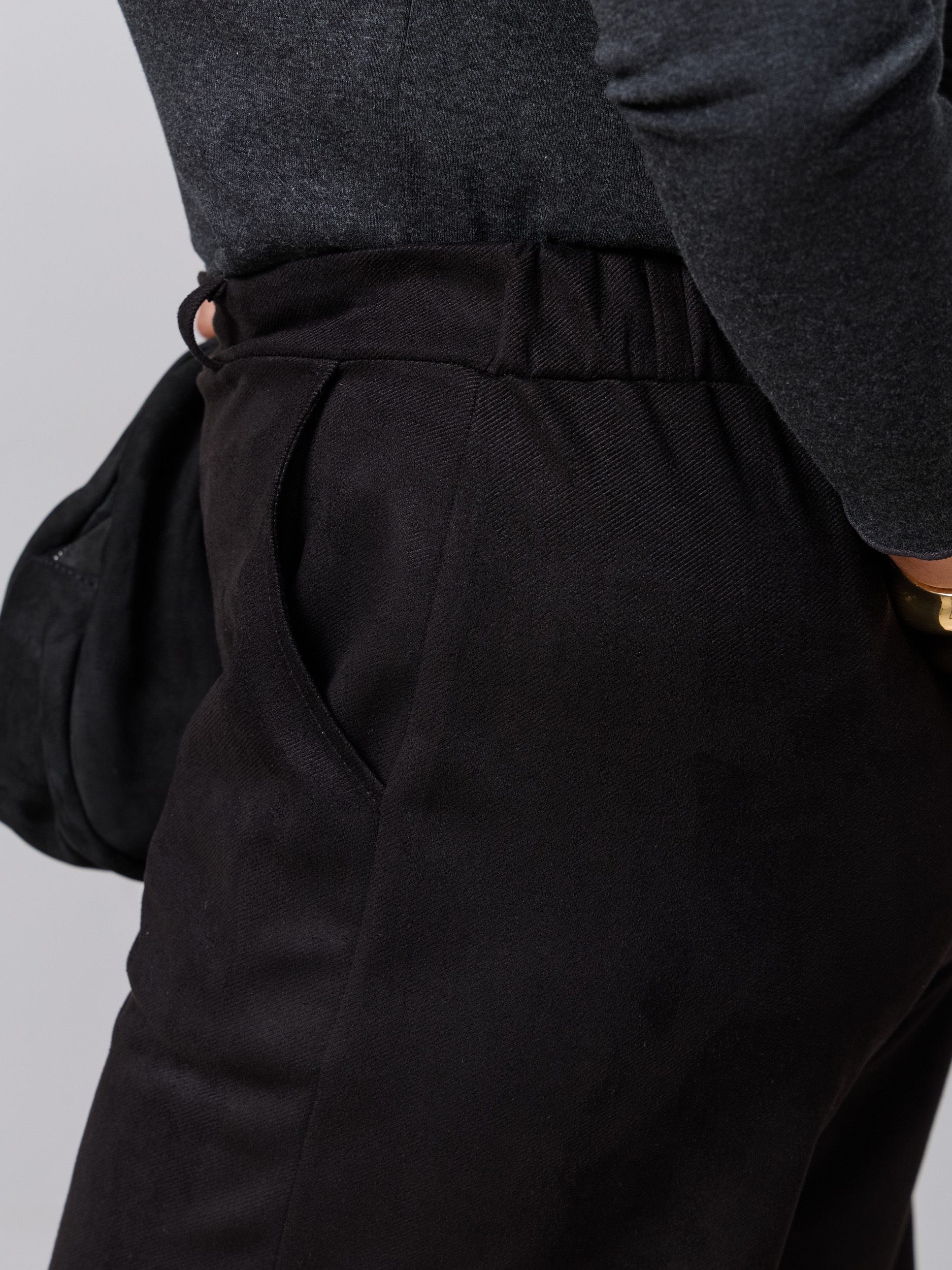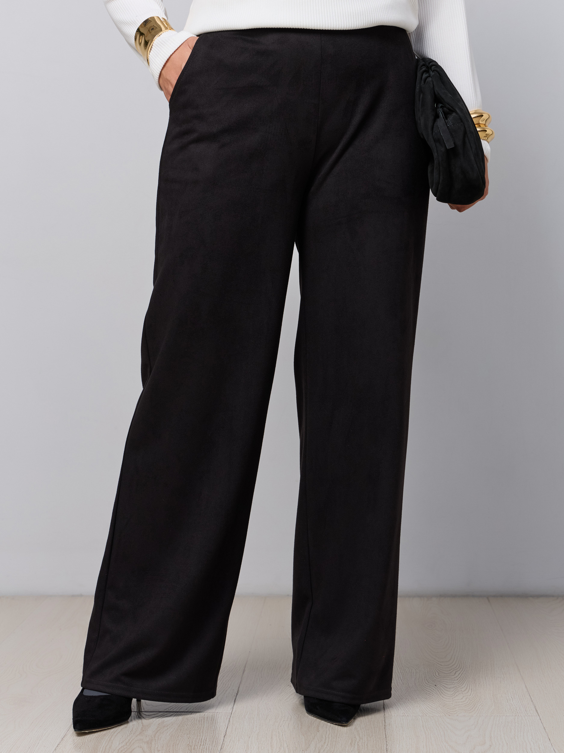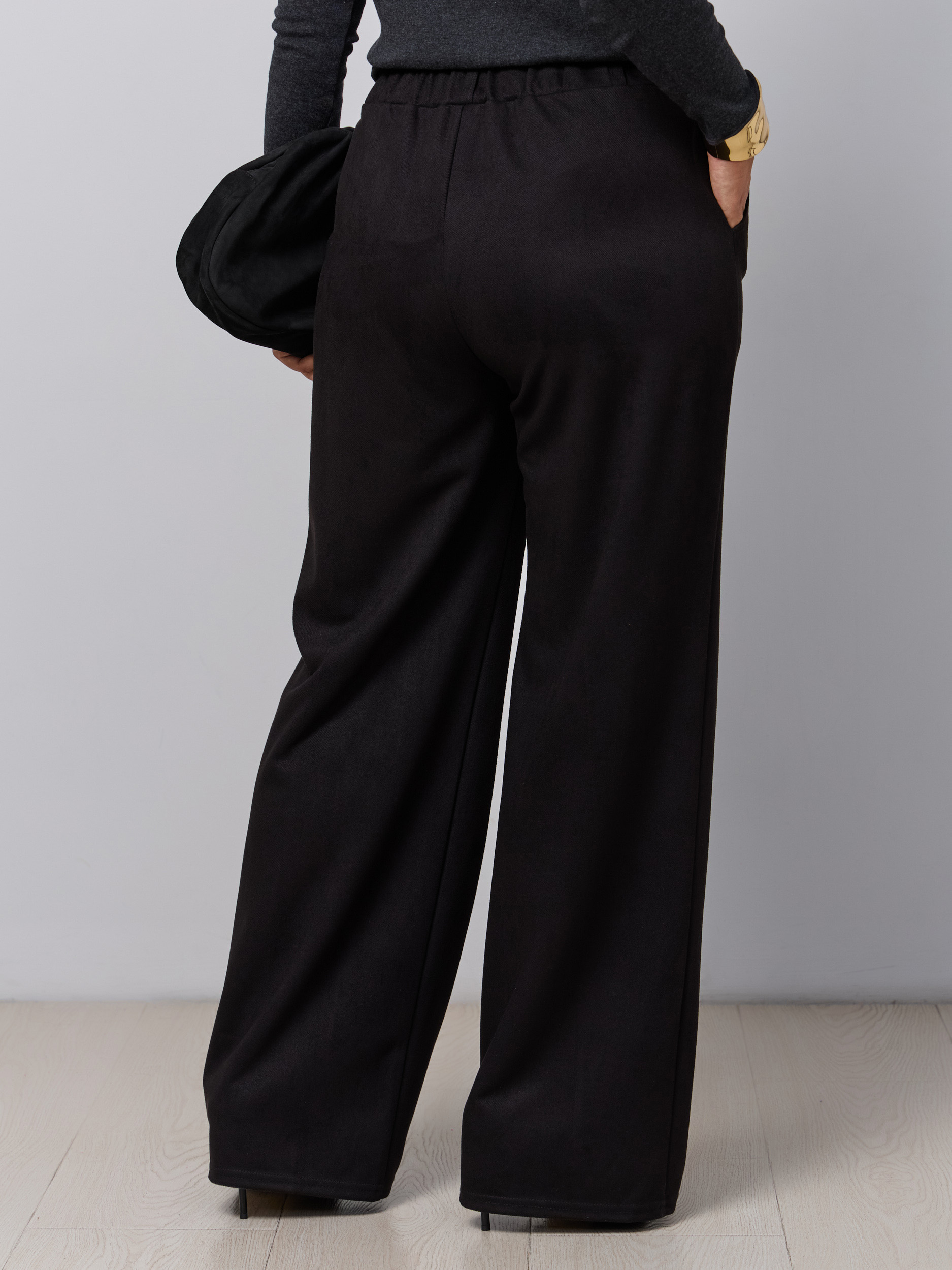 Классические брюки офисные в современной обработке в стиле палаццо. Ткань - микроыельвет стрейч с замшевой текстурой. Без звтсежек и молний. Высокая посадка, пояс на резинке, брючина прямая широкая, модель "трубы". Карманы с отрезным бочком.