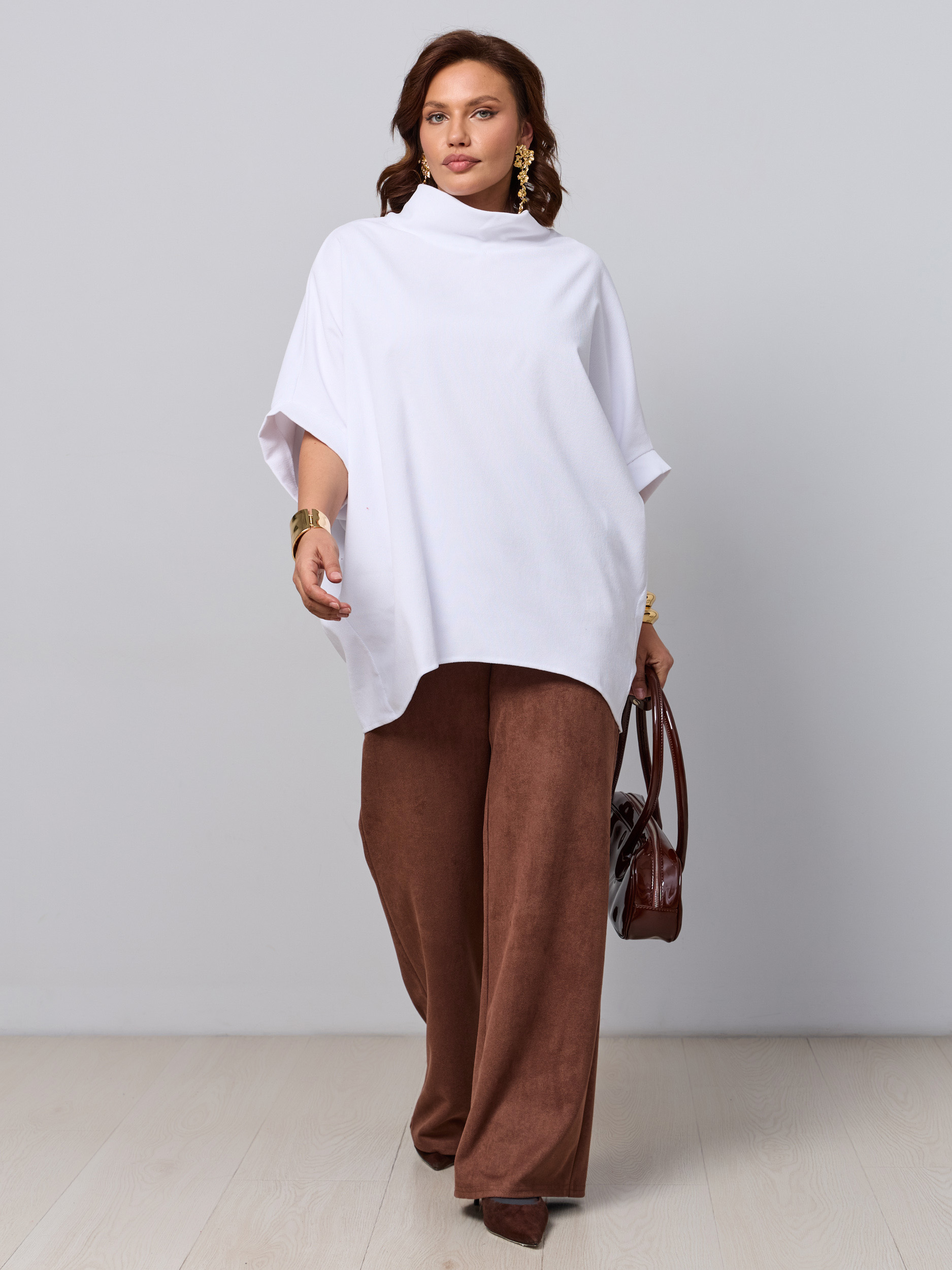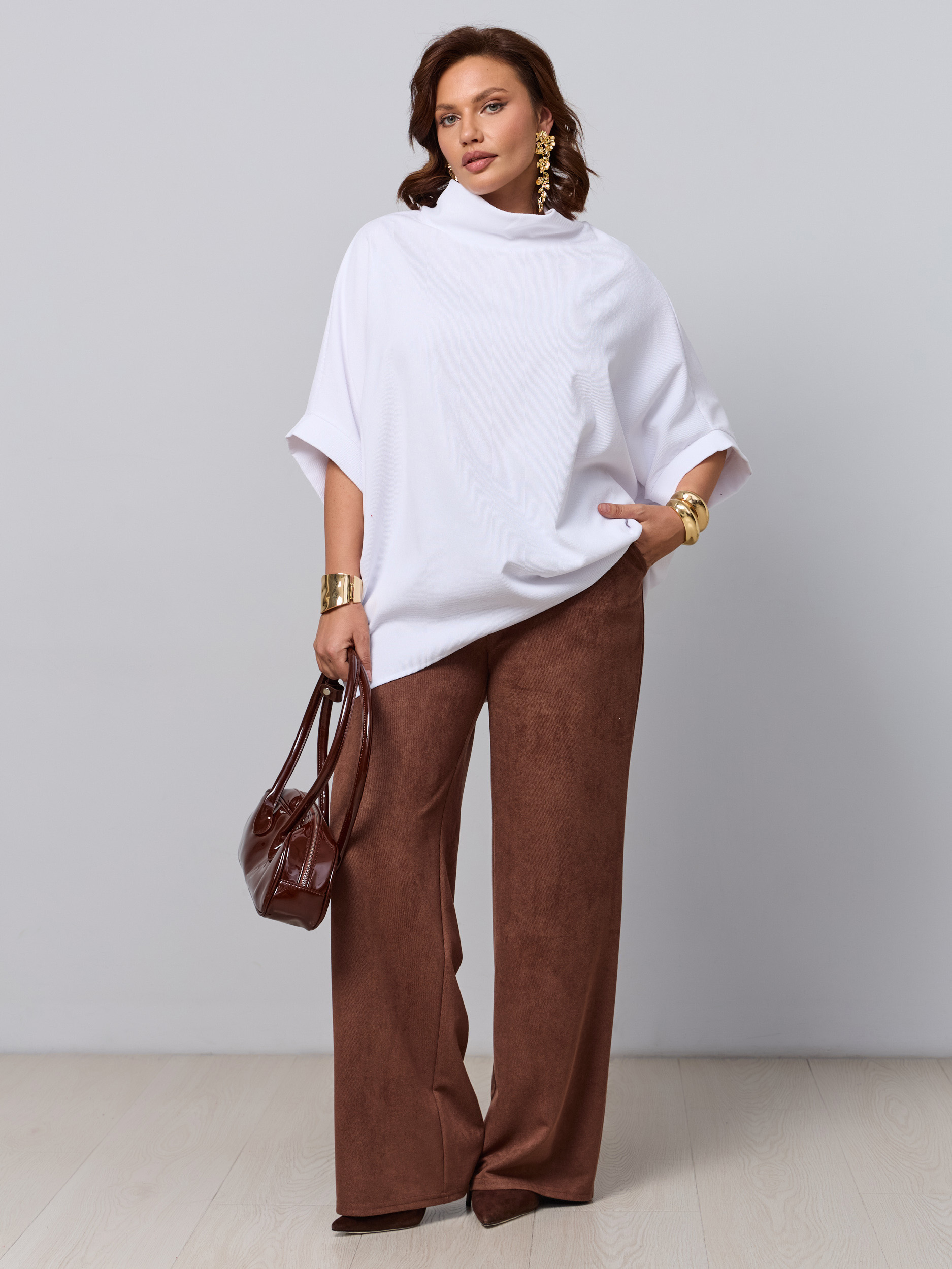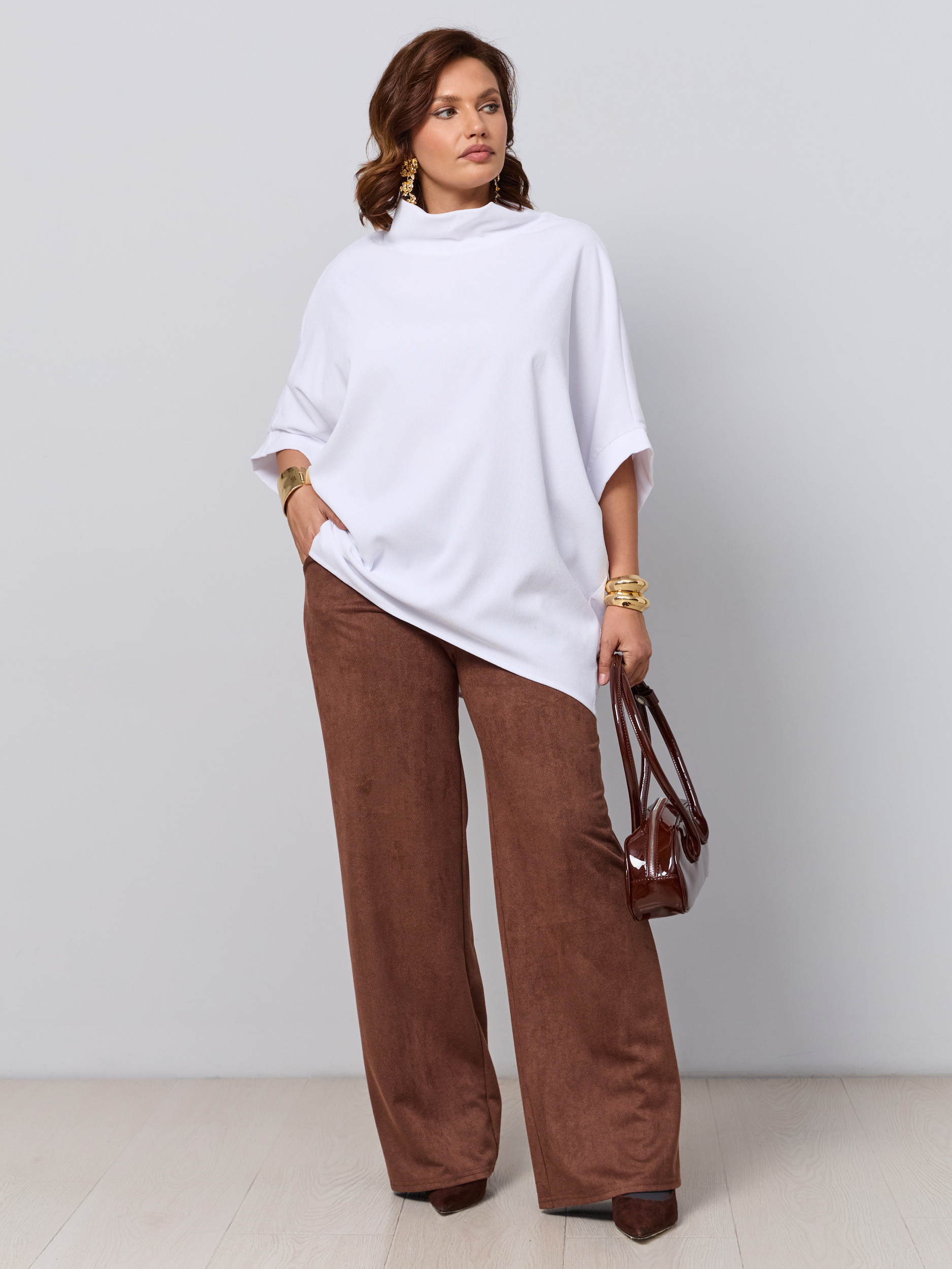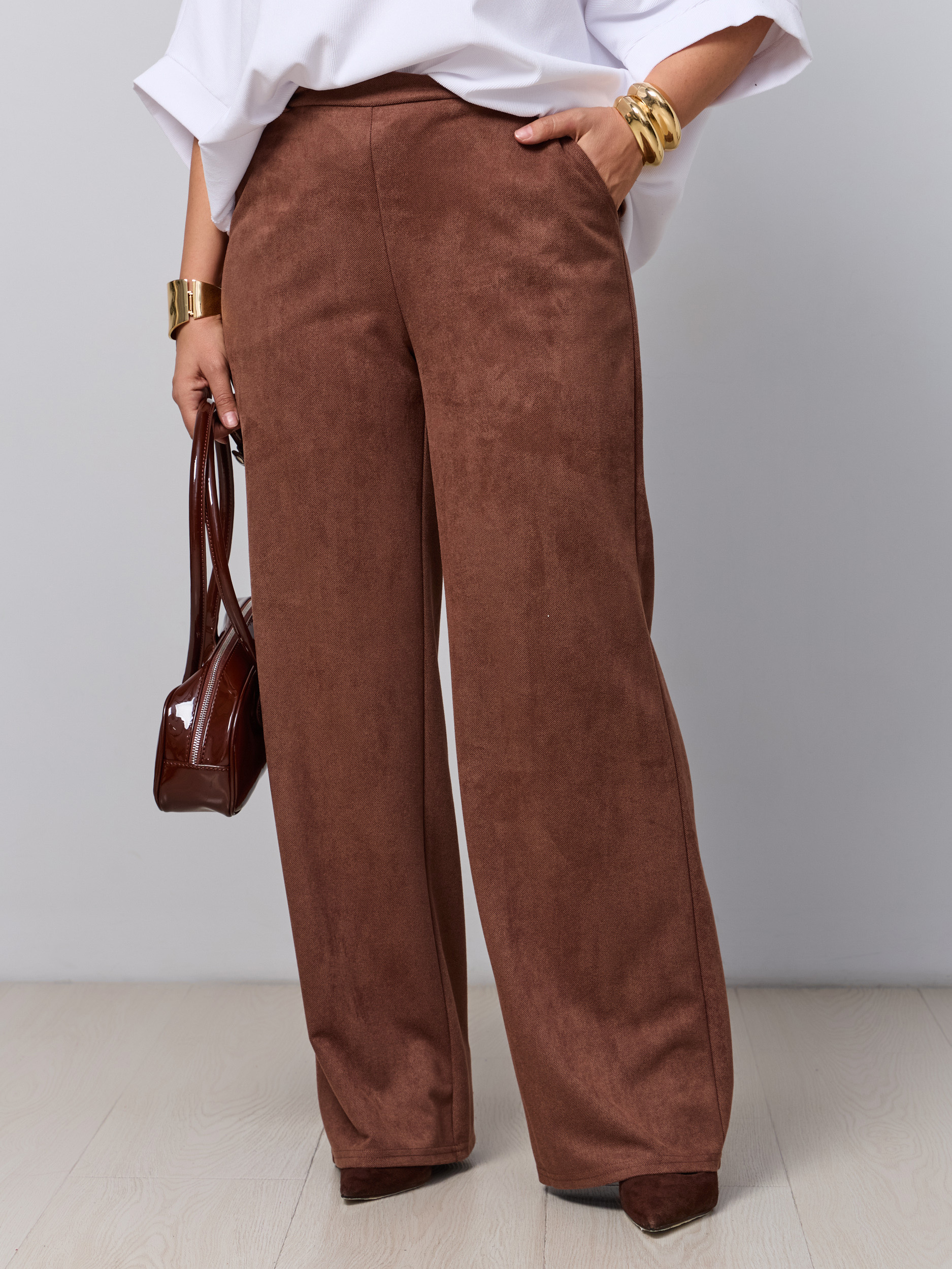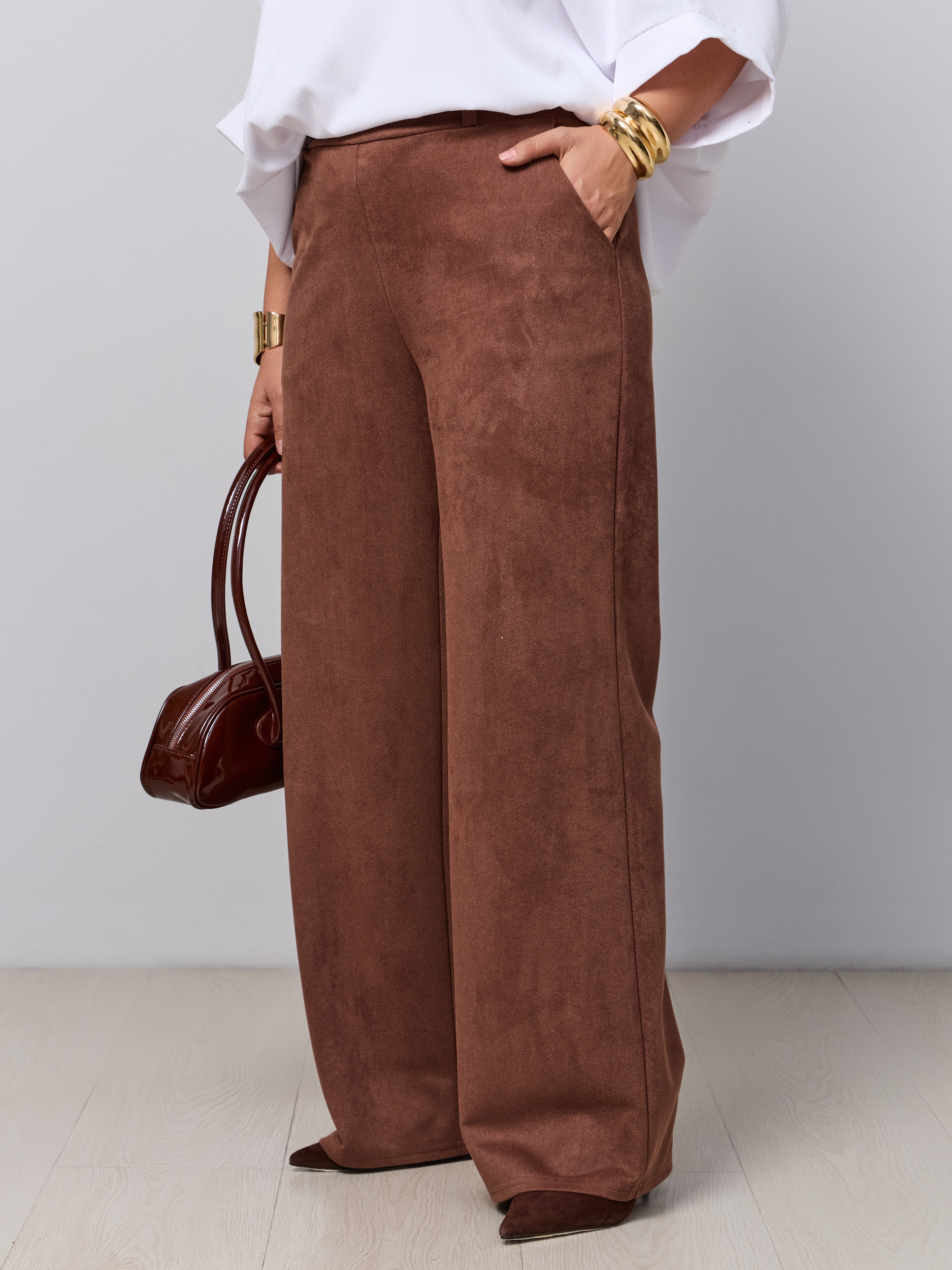 Классические брюки офисные в современной обработке в стиле палаццо. Ткань - микроыельвет стрейч с замшевой текстурой. Без звтсежек и молний. Высокая посадка, пояс на резинке, брючина прямая широкая, модель "трубы". Карманы с отрезным бочком.