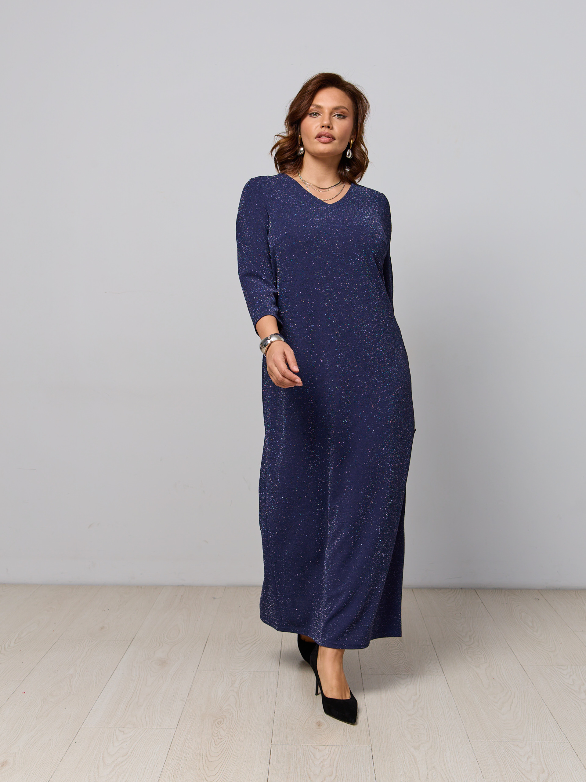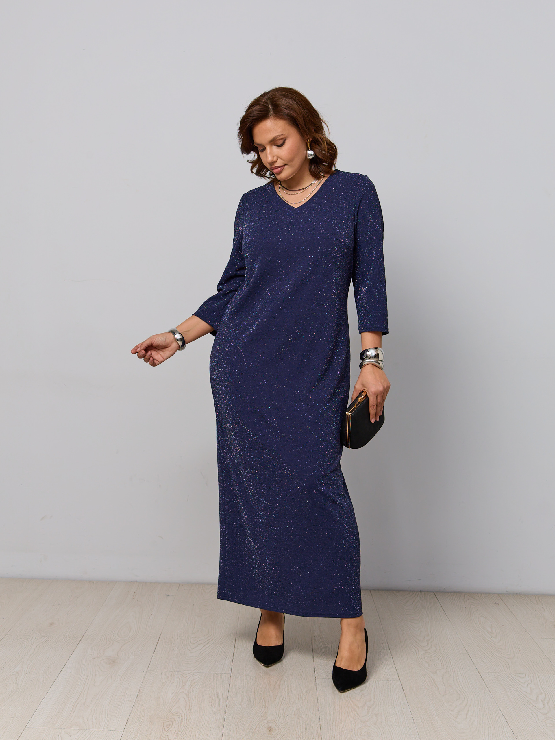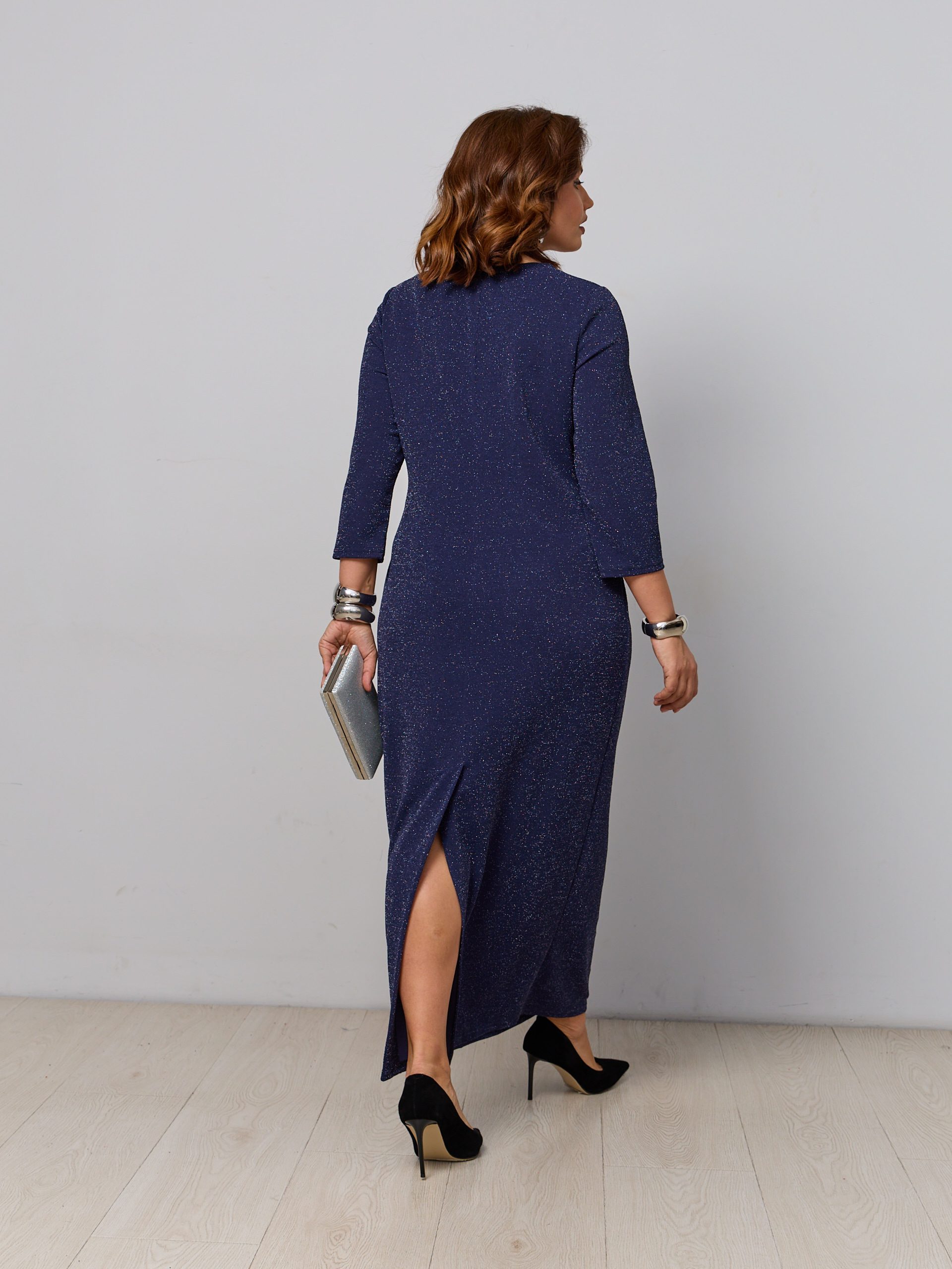 Праздничное платье блестящее. Ткань - трикотаж с люрексовой нитью. Рукав 3/4, V-образный вырез горловины, сзади шлица.