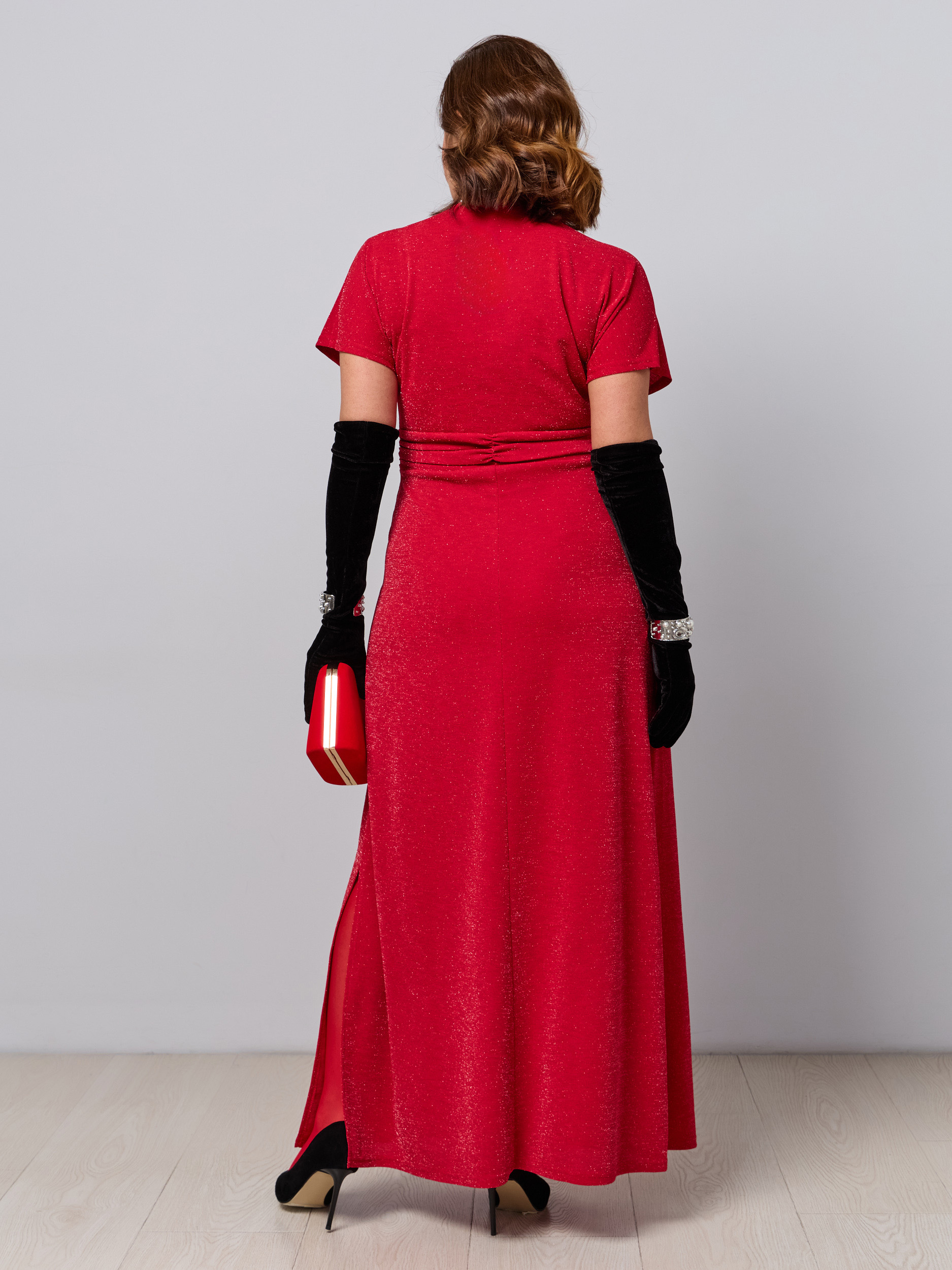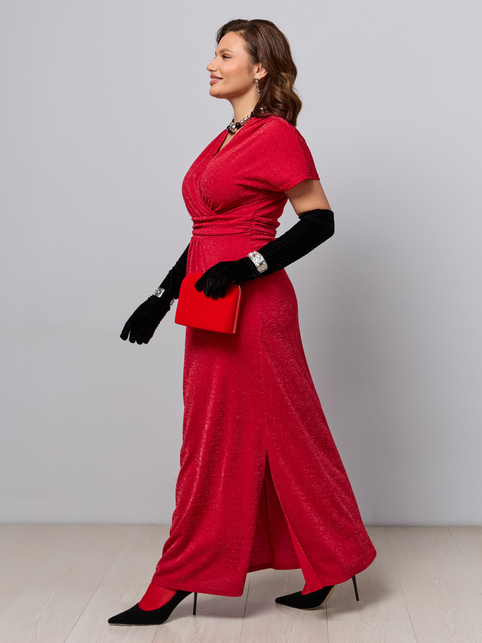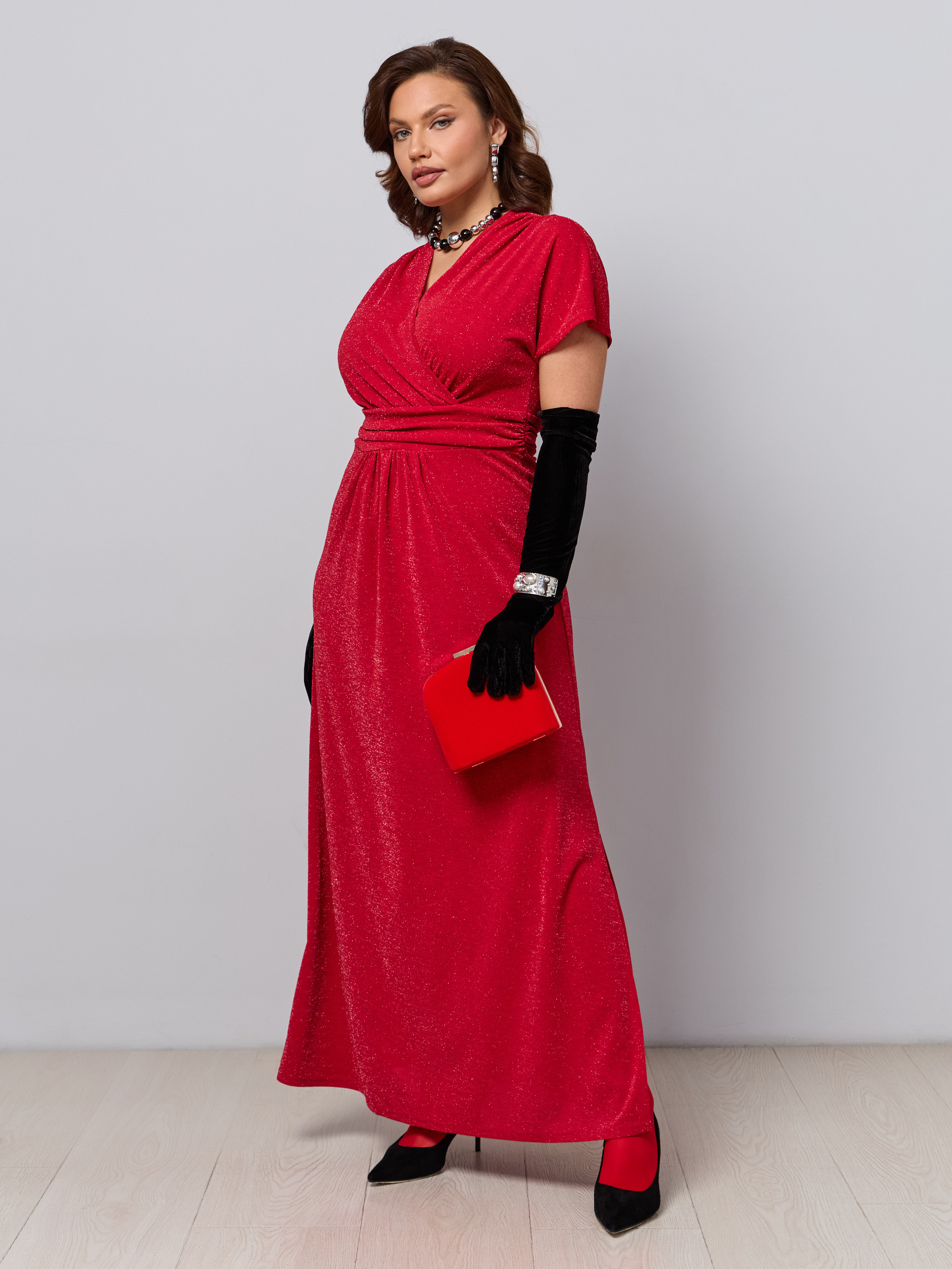 Макси-платье на кокетке. Ткань - трикотаж с люрексовой нитью. Разрез сбоку, рукав прикрывает плечи. Завышенная талия. V - образный вырез на запах.