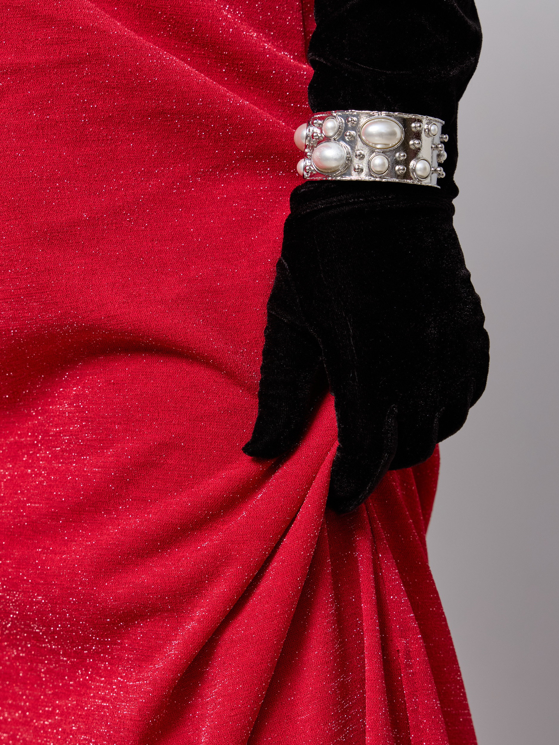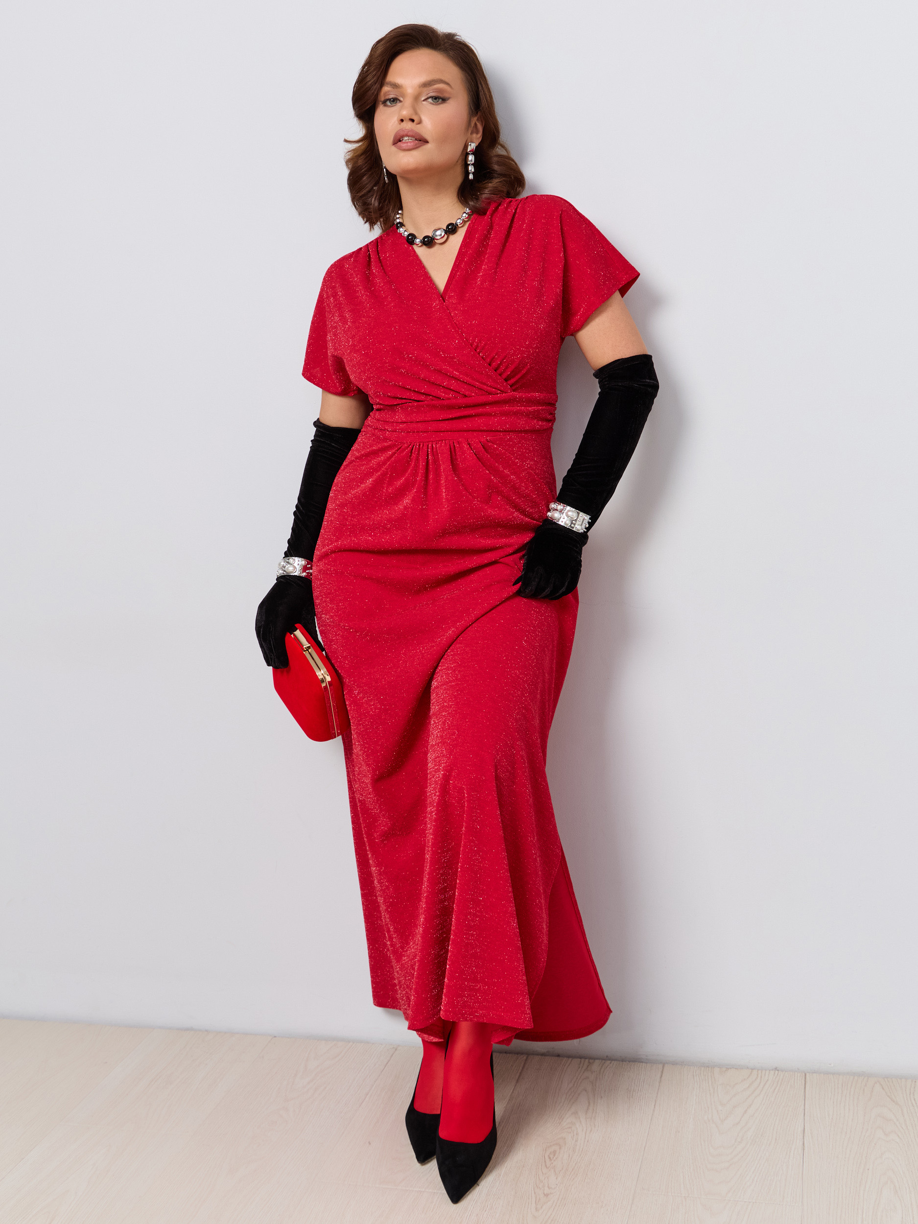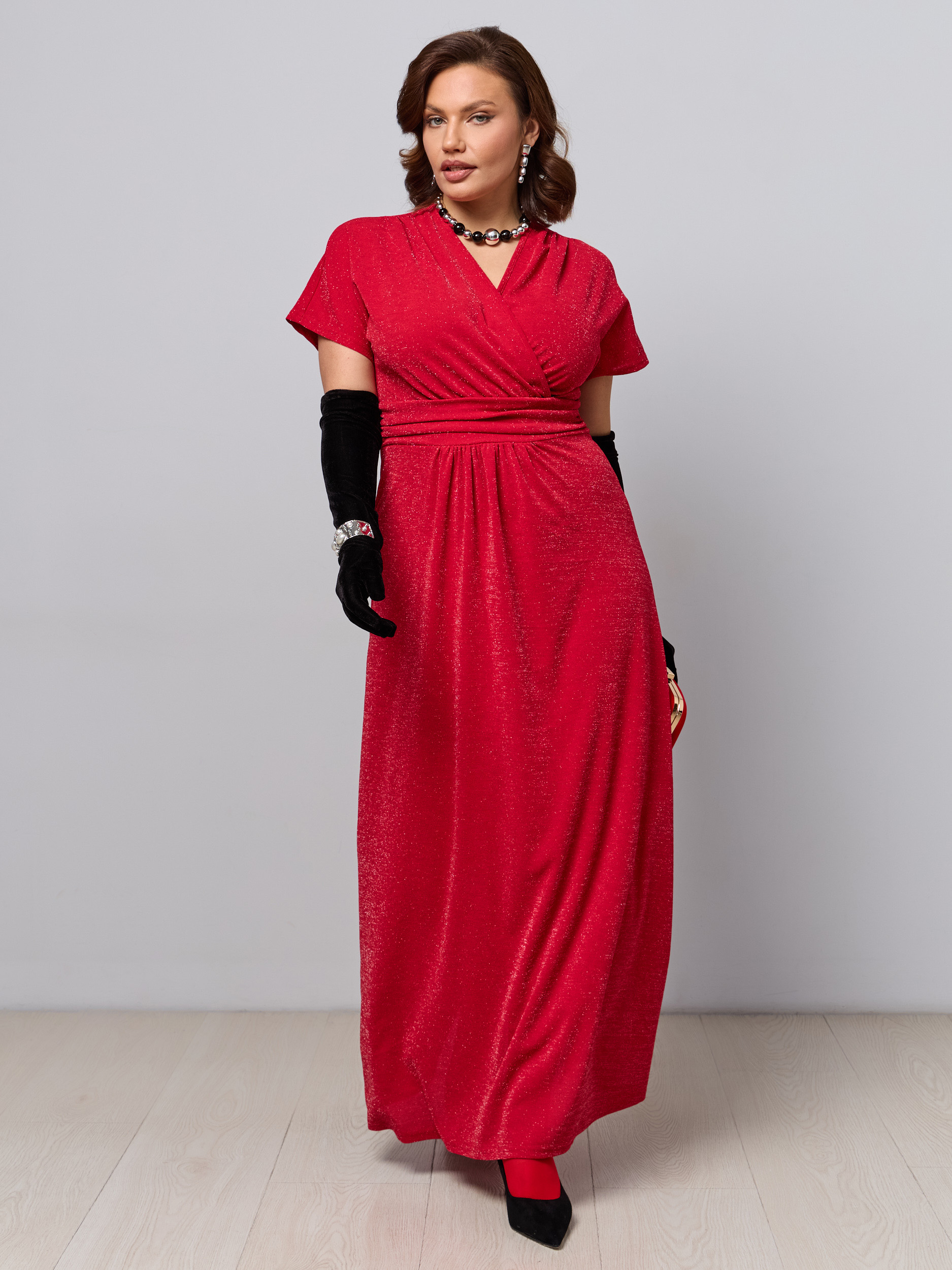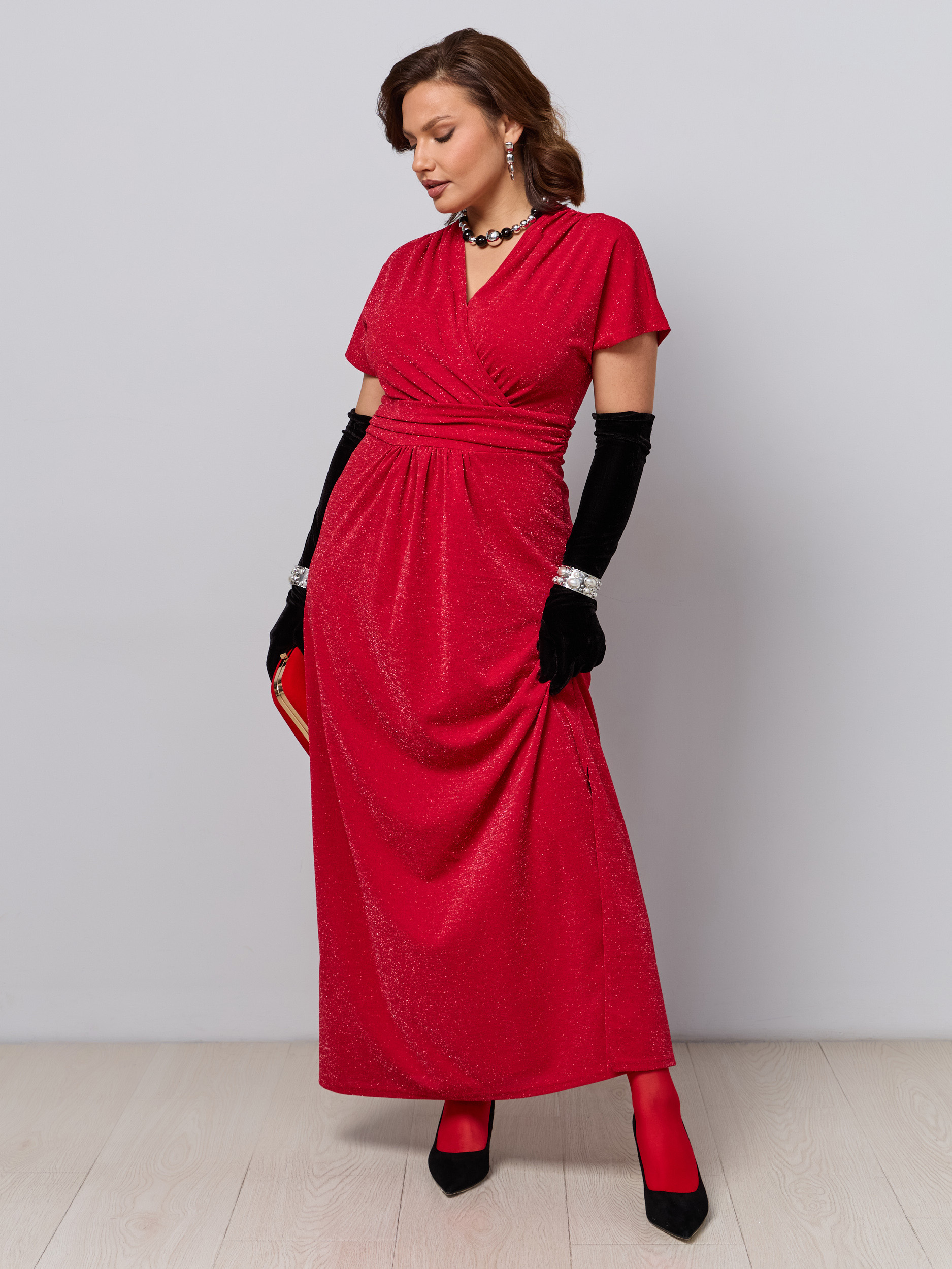Макси-платье на кокетке. Ткань - трикотаж с люрексовой нитью. Разрез сбоку, рукав прикрывает плечи. Завышенная талия. V - образный вырез на запах.