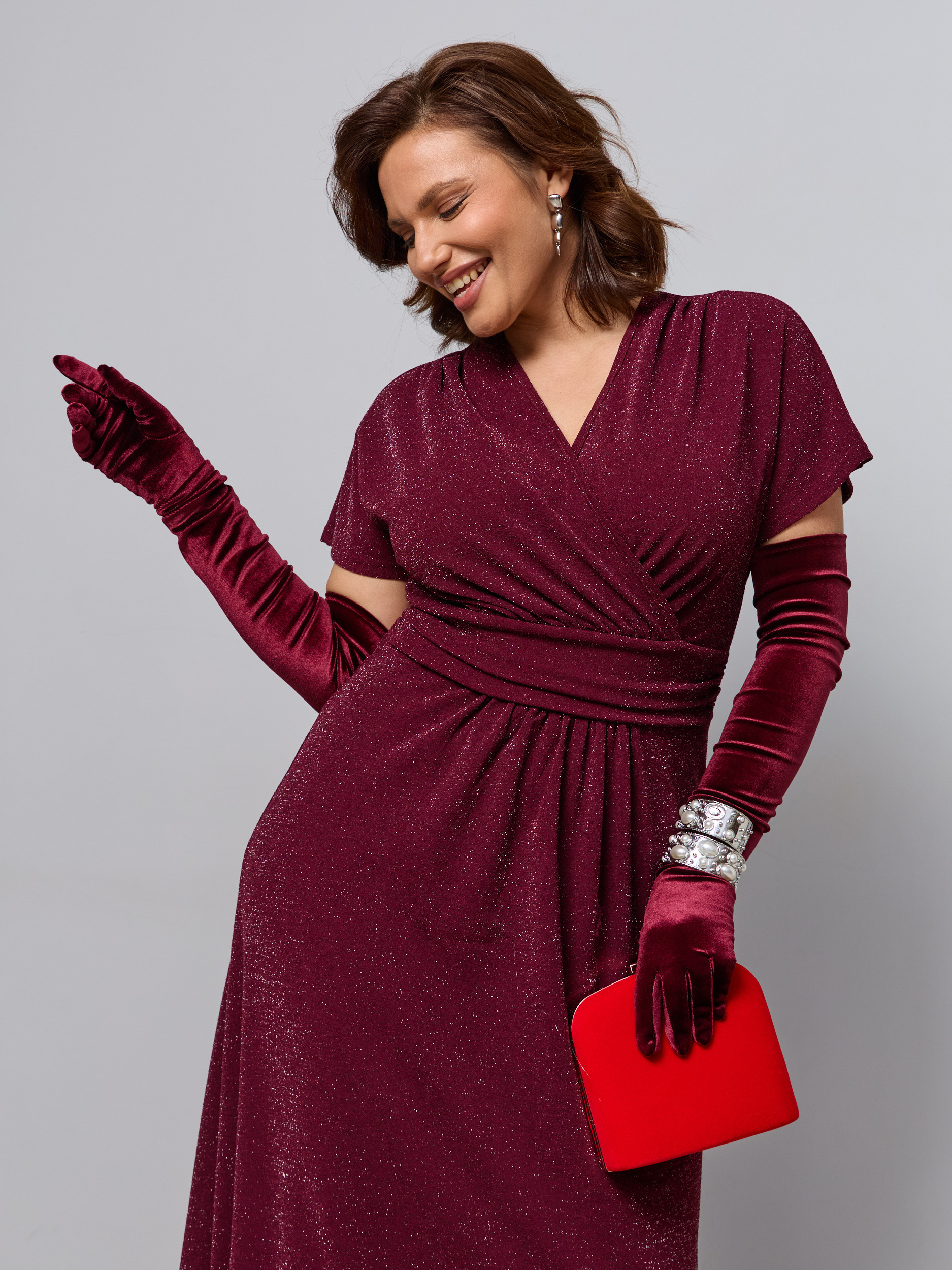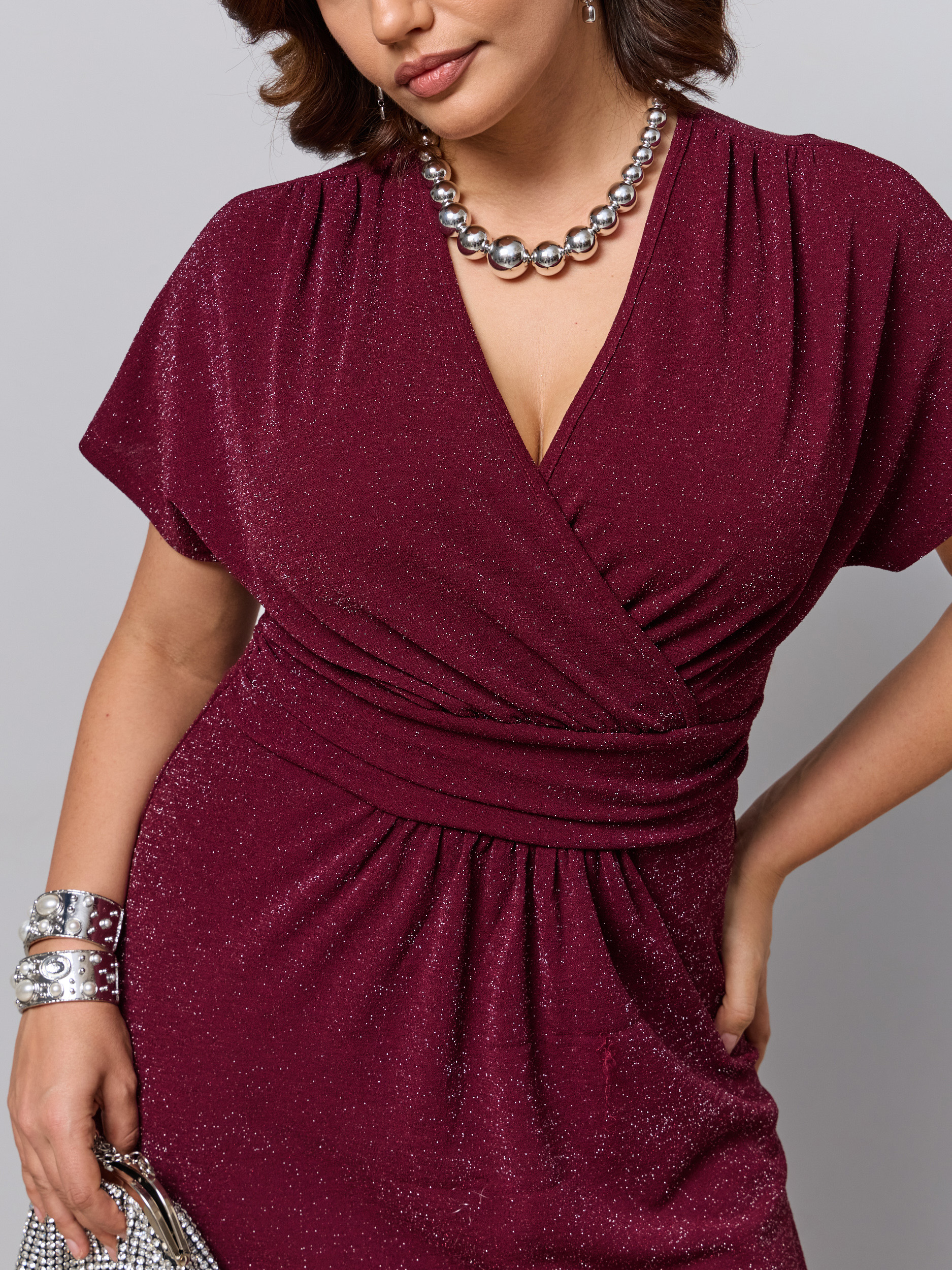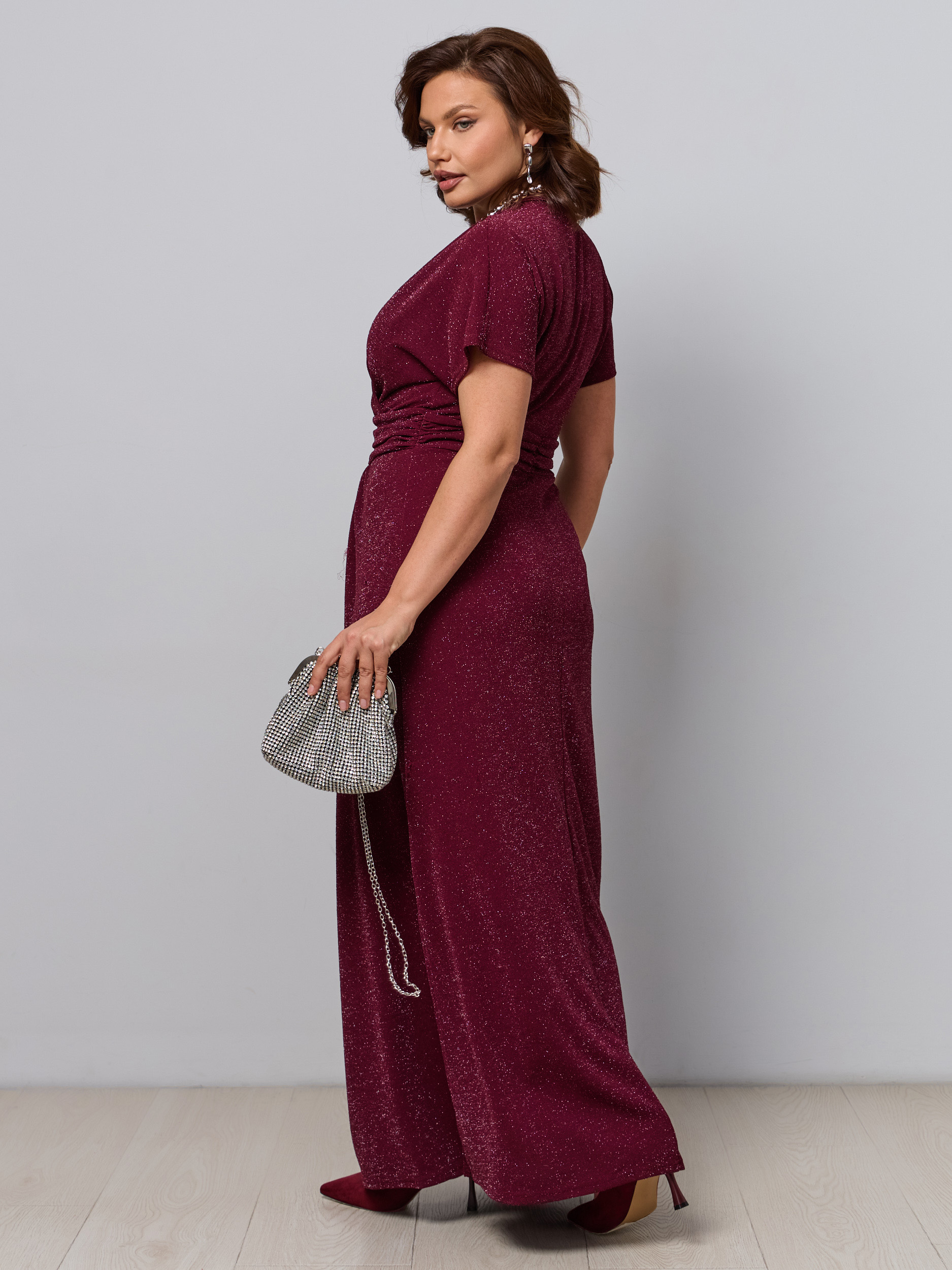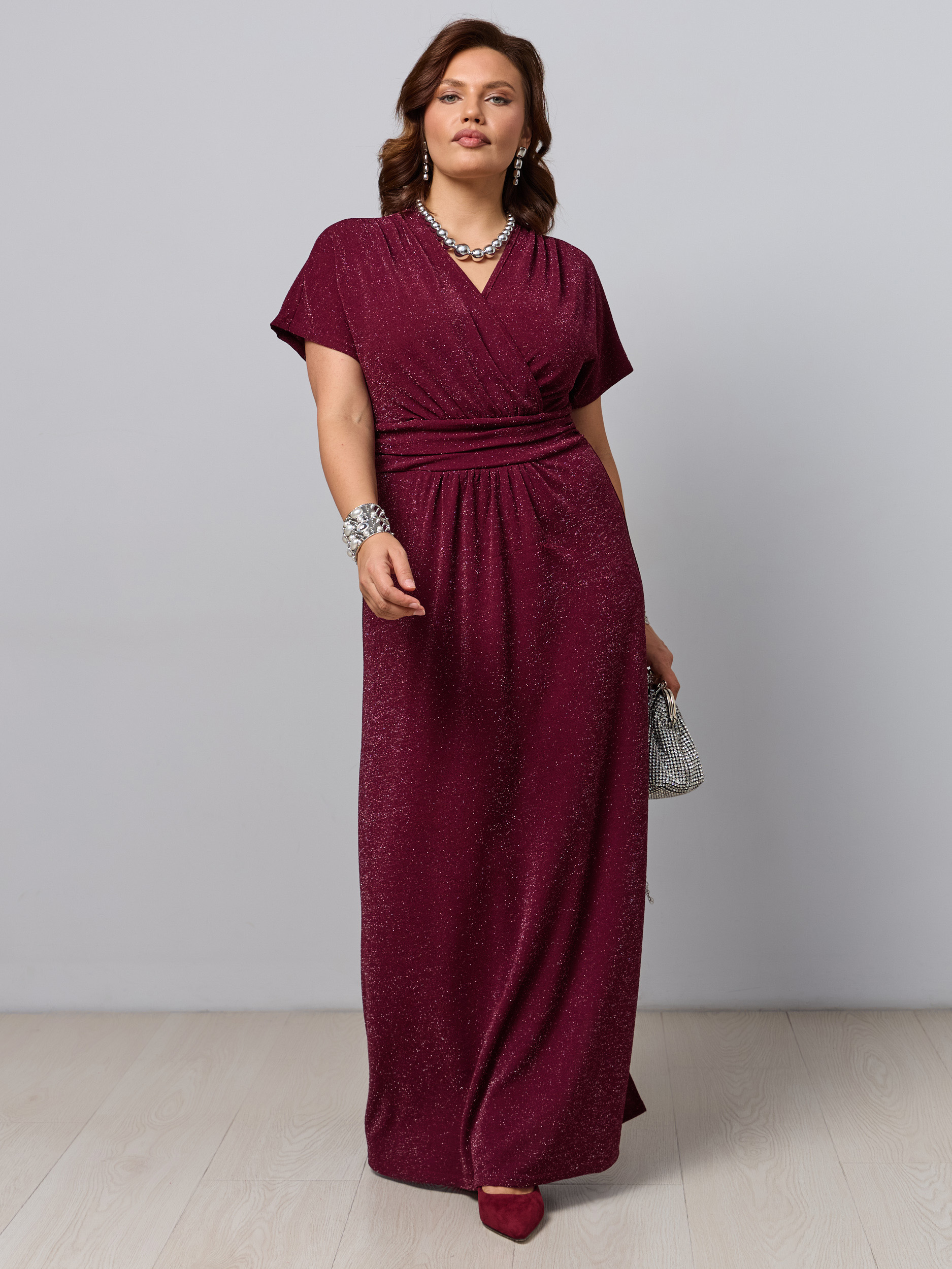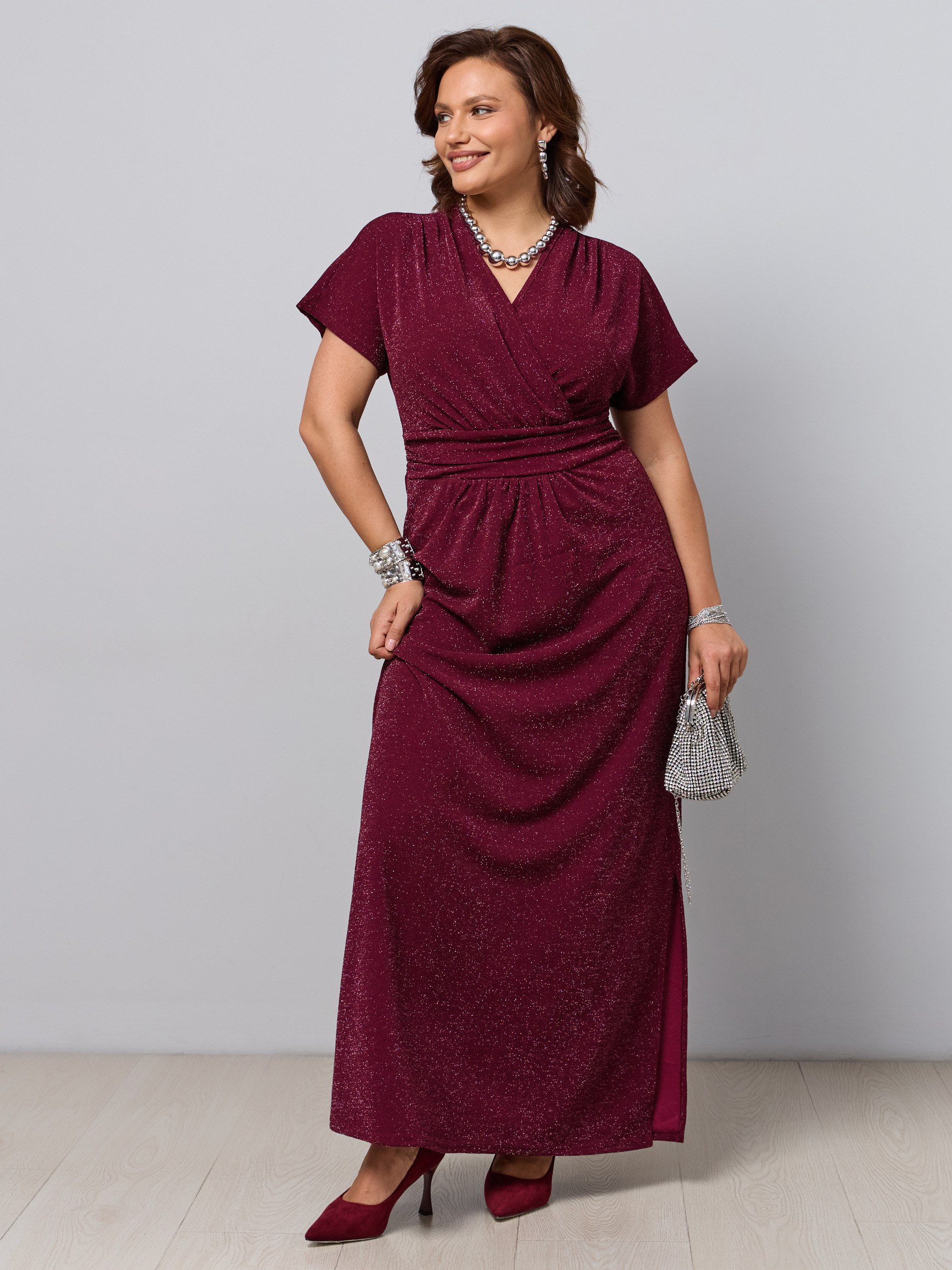 Макси-платье на кокетке. Ткань - трикотаж с люрексовой нитью. Разрез сбоку, рукав прикрывает плечи. Завышенная талия. V - образный вырез на запах.