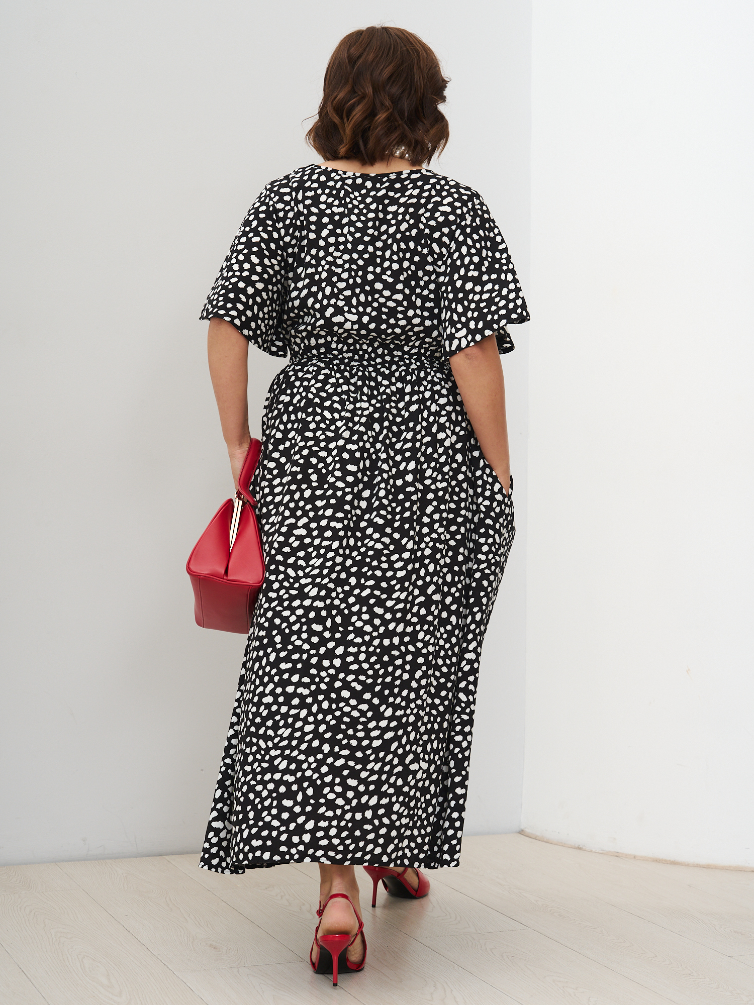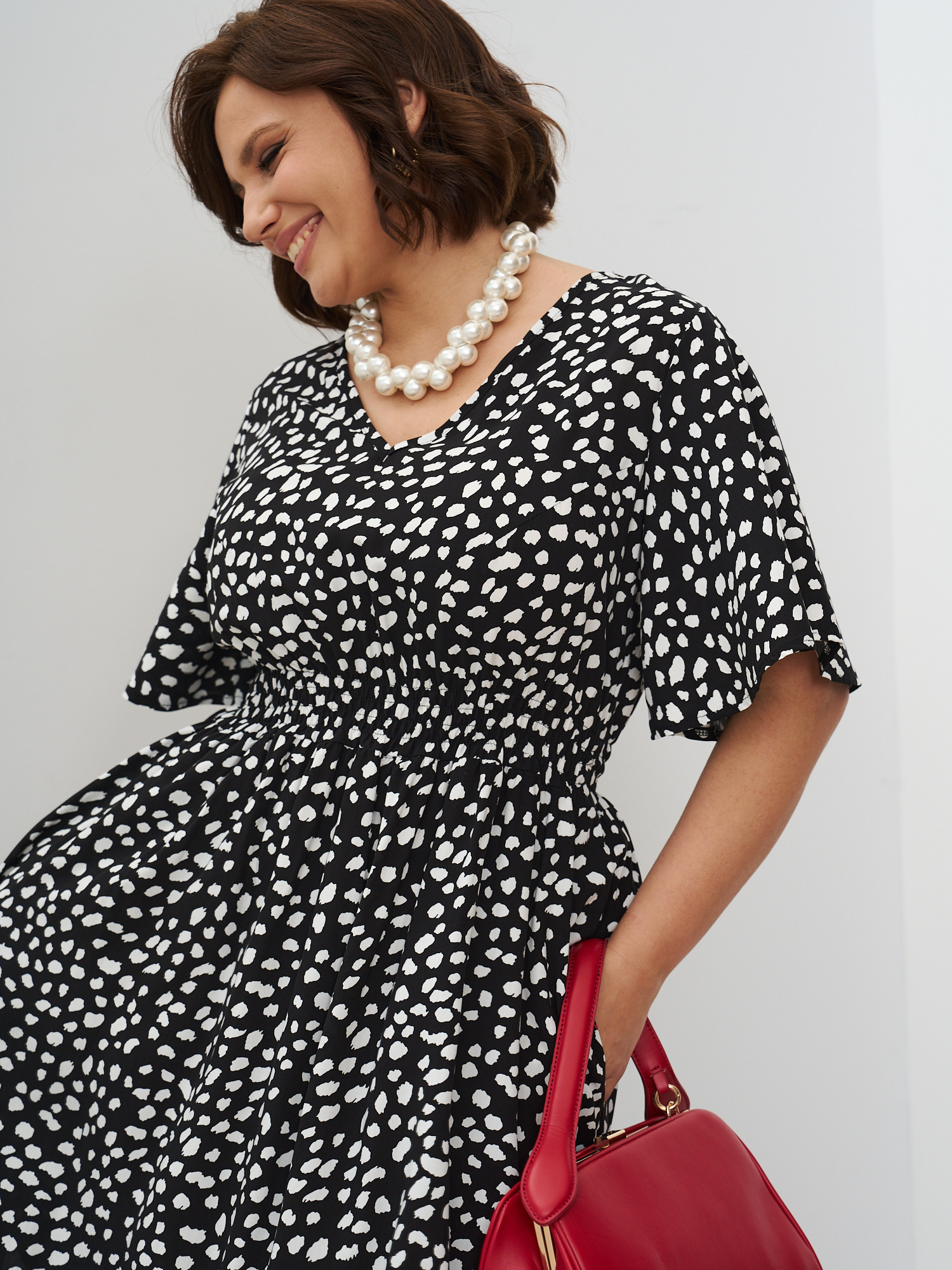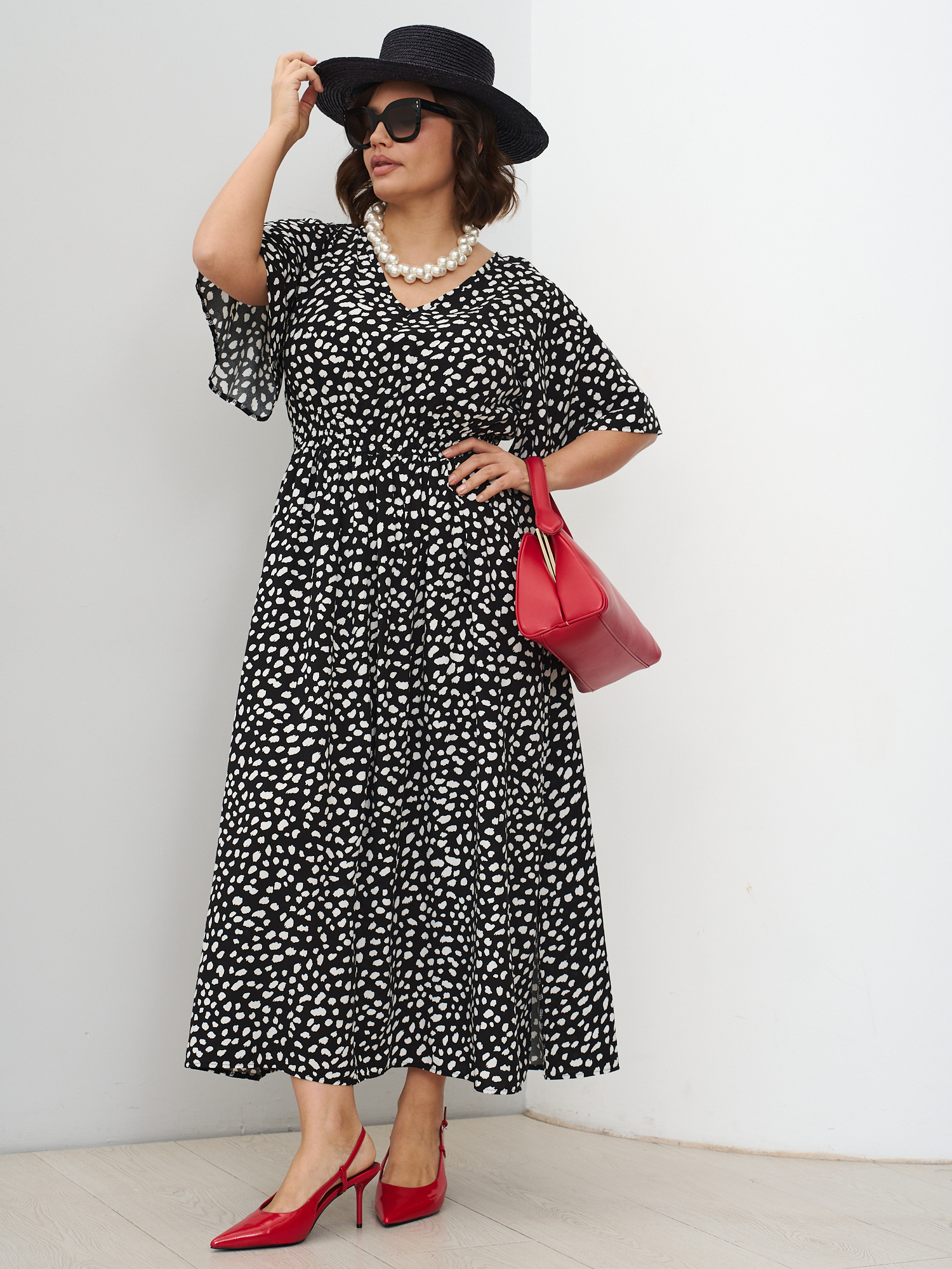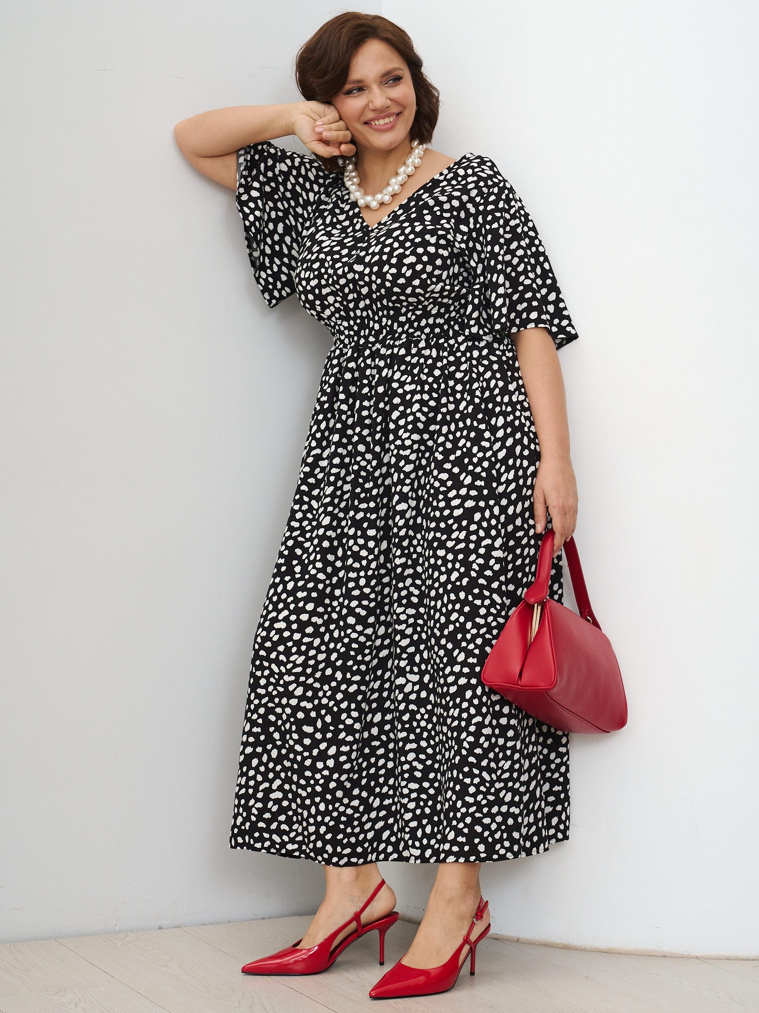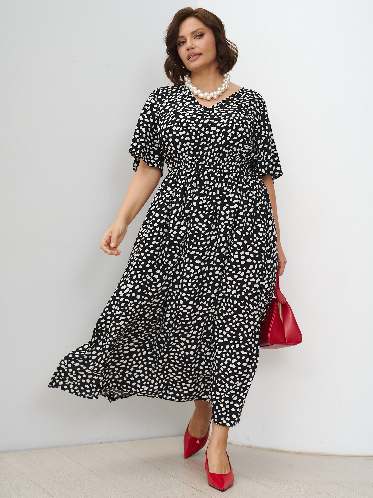 Женское летнее платье больших размеров. Стильное и элегантное платье-миди из комфортного трикотажа, отрезное по талии, приталенное с расклешённой юбкой, это платье создаёт женственный и лёгкий силуэт, отлично стройнит и подчеркивает талию. Рукав 3/4 на манжете, V- вырез на груди. Широкая резинка в талии дает комфортную посадку, крой платья учитывает особенности фигур Plus size, благодаря чему изделие хорошо садится по фигуре и подчёркивает талию без излишнего объема в области бёдер. Подходит как для беременных, так и для полных женщин. Длинное летнее платье с разрезами по бокам прекрасно подойдет для дома, для прогулок на свежем воздухе, отдыха на пляже или отпуска на море. Легкая натуральная ткань, платье идеально подойдет для лета и жаркой погоды. Платья с завышенной талией это находка для полных женщин: они помогут скрыть все недостатки и подчеркнуть достоинства фигуры. Красивое платье, которое Вы полюбите!