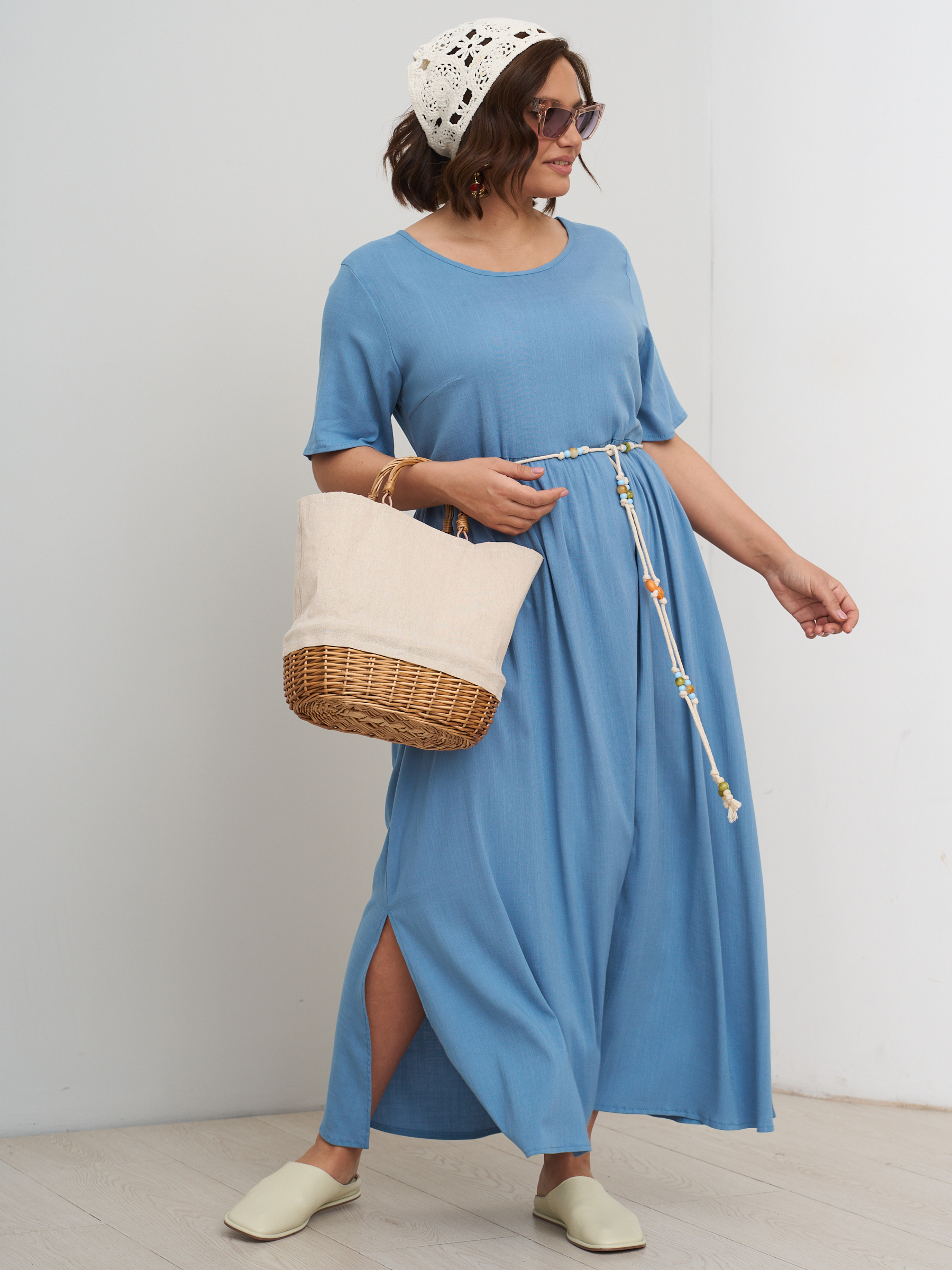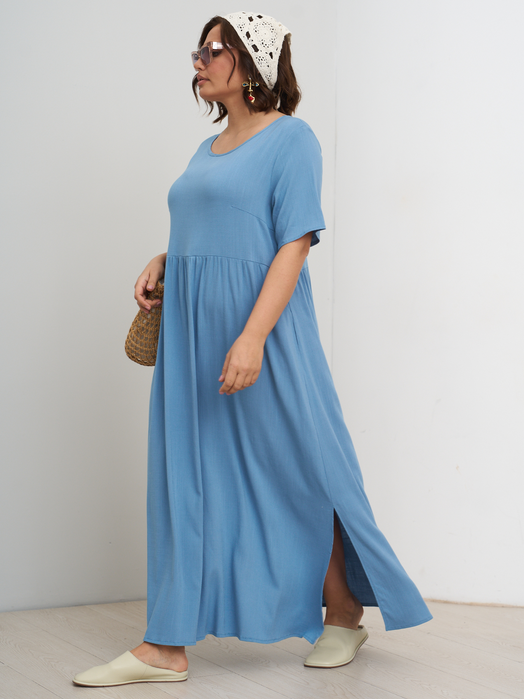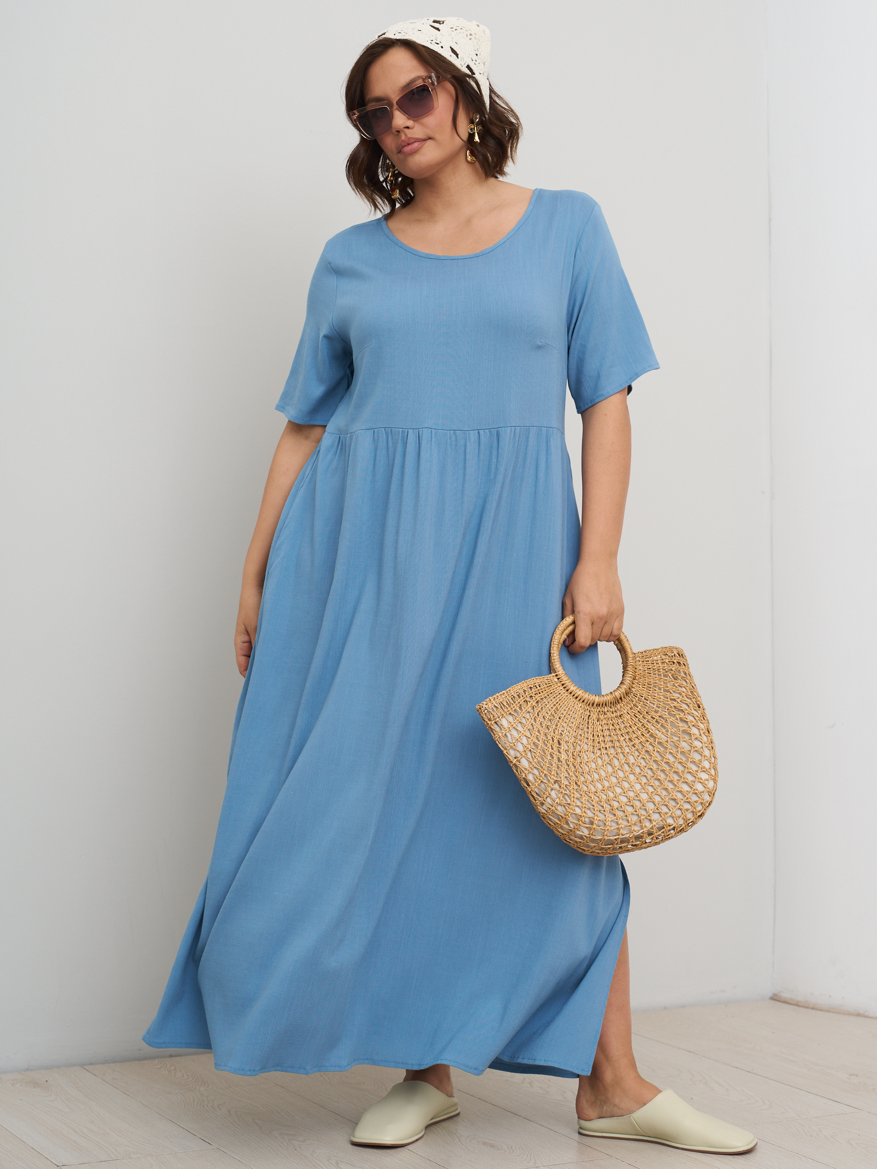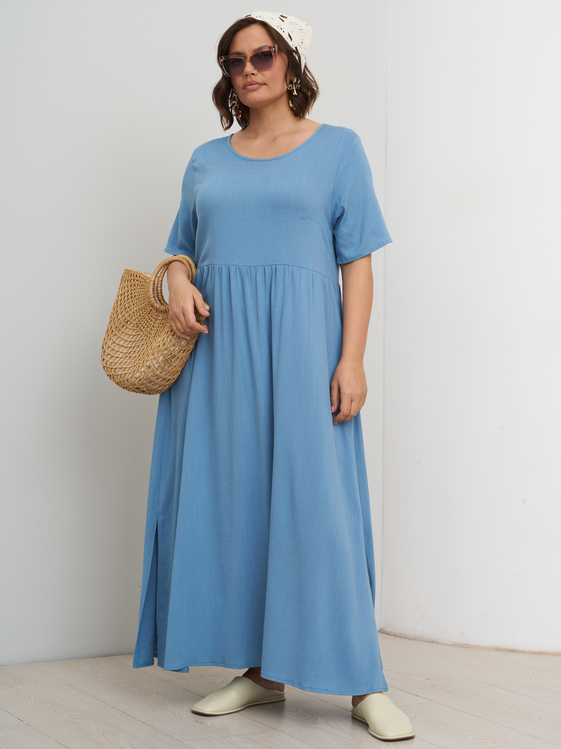 Платье летнее однотонное легкое штапельное. Отрезная полочка. Стиль бохо. На высокий рост. Разрезы по бокам. Округлый вырез горловины, свободный втачной рукав.