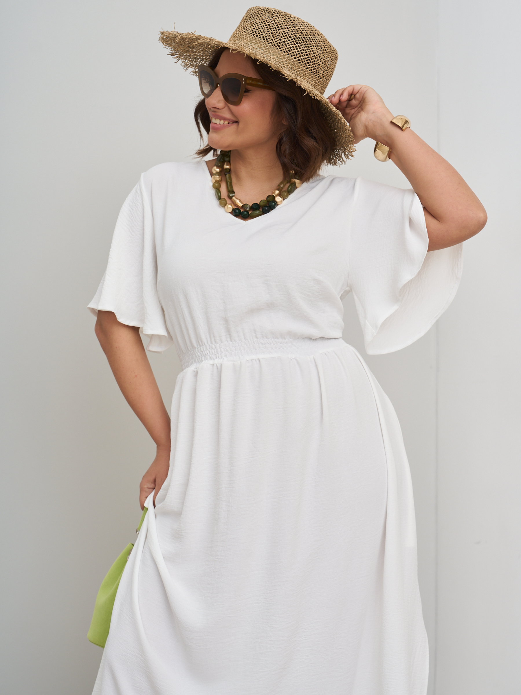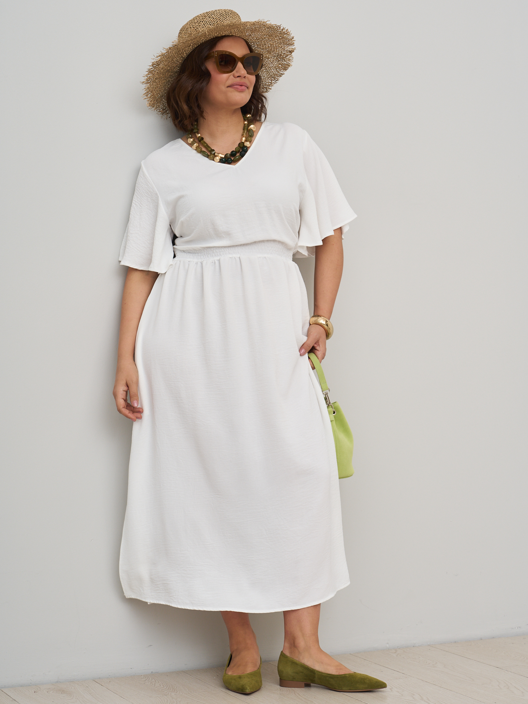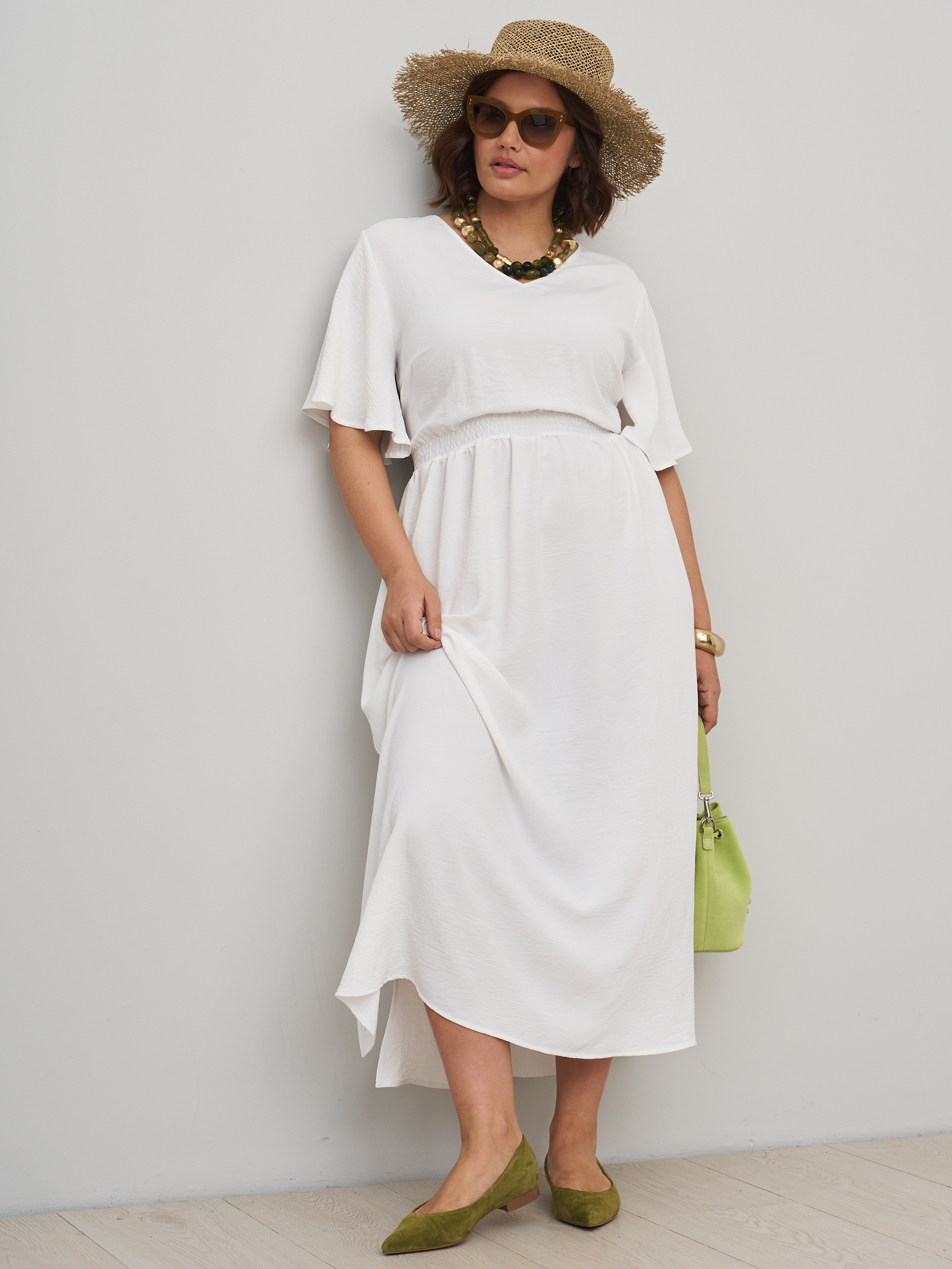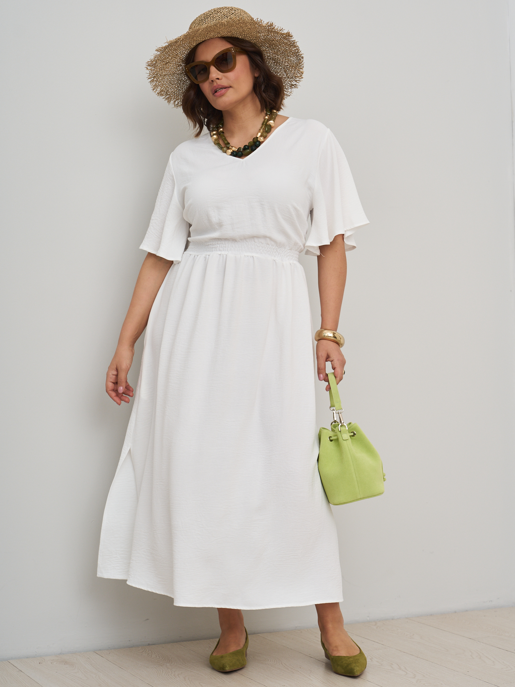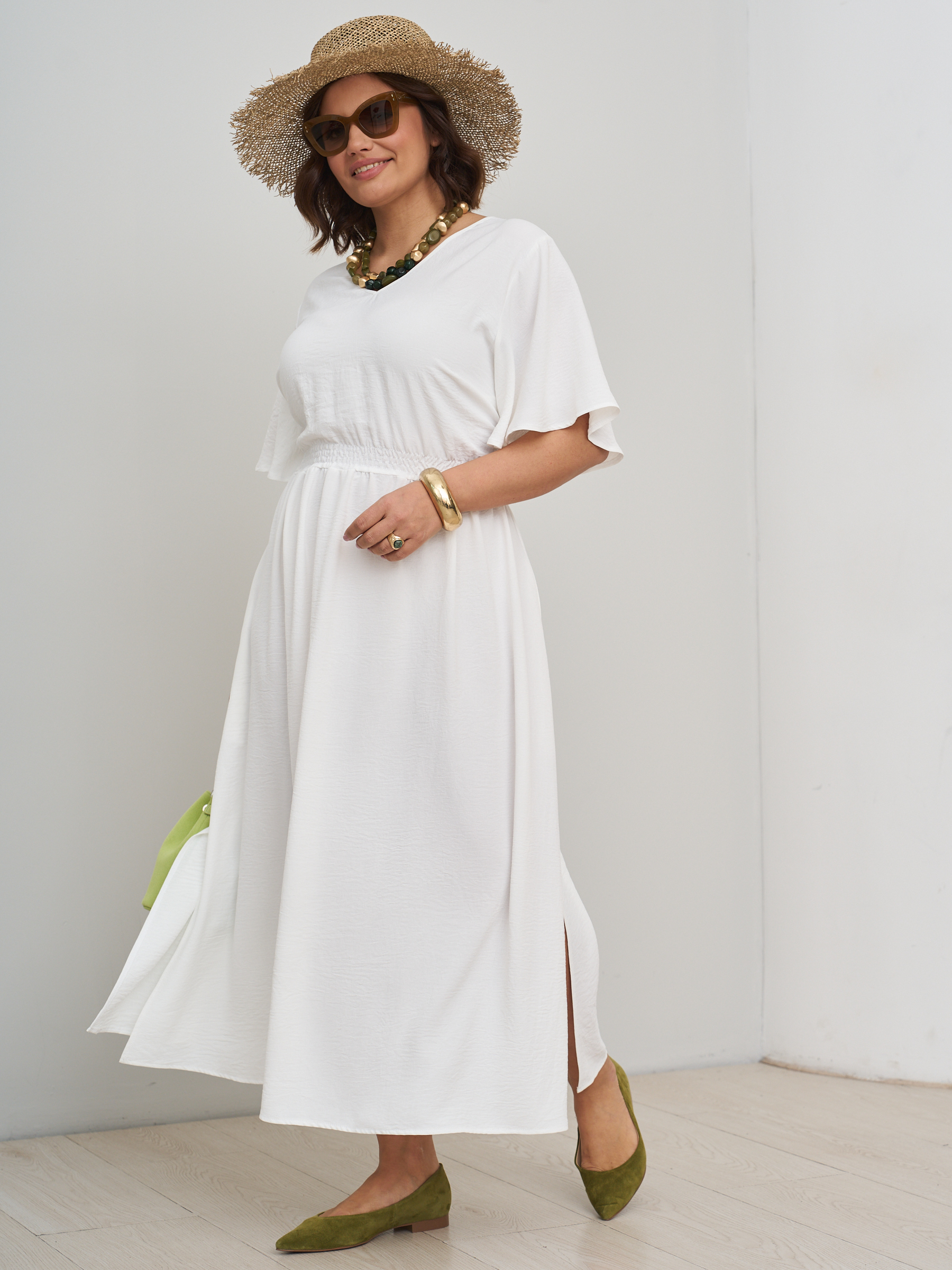 Женское летнее платье больших размеров. Стильное и элегантное платье-миди из комфортной вискозы, отрезное по талии, приталенное с расклешённой юбкой, это платье создаёт женственный и лёгкий силуэт, отлично стройнит и подчеркивает талию. Рукав 3/4 на манжете, V- вырез на груди. Широкая резинка в талии дает комфортную посадку, крой платья учитывает особенности фигур Plus size, благодаря чему изделие хорошо садится по фигуре и подчёркивает талию без излишнего объема в области бёдер. Подходит как для беременных, так и для полных женщин. Длинное летнее платье с разрезами по бокам прекрасно подойдет для дома, для прогулок на свежем воздухе, отдыха на пляже или отпуска на море. Легкая натуральная ткань, платье идеально подойдет для лета и жаркой погоды. Платья с завышенной талией это находка для полных женщин: они помогут скрыть все недостатки и подчеркнуть достоинства фигуры. Красивое платье, которое Вы полюбите!