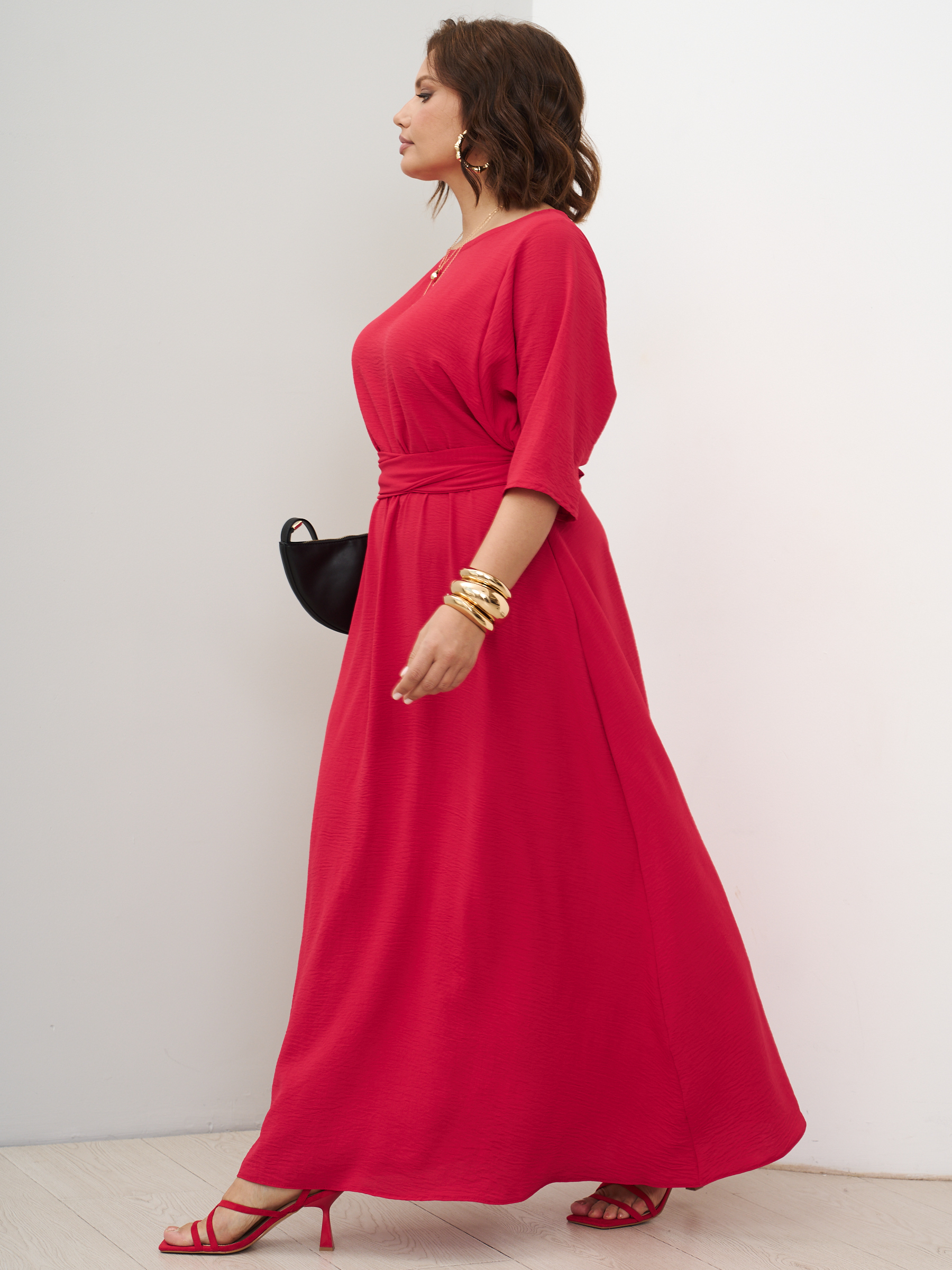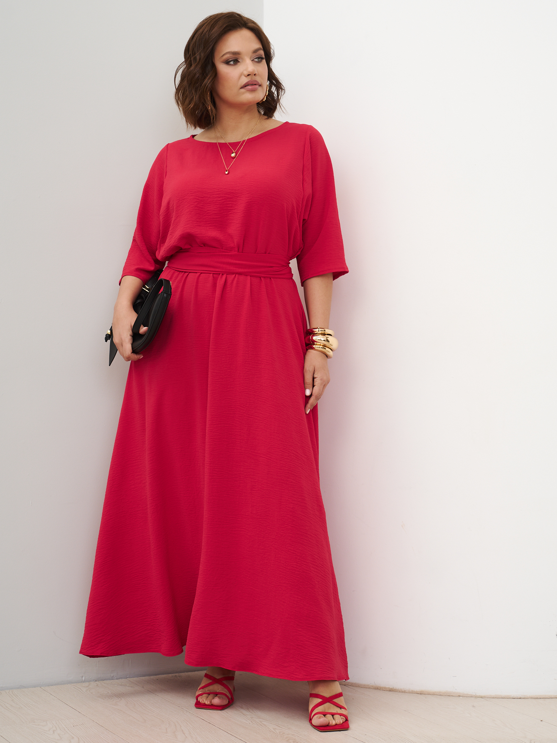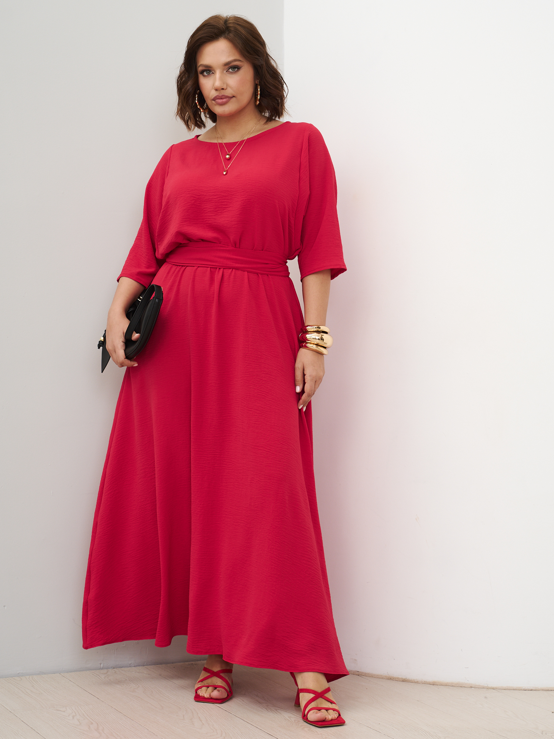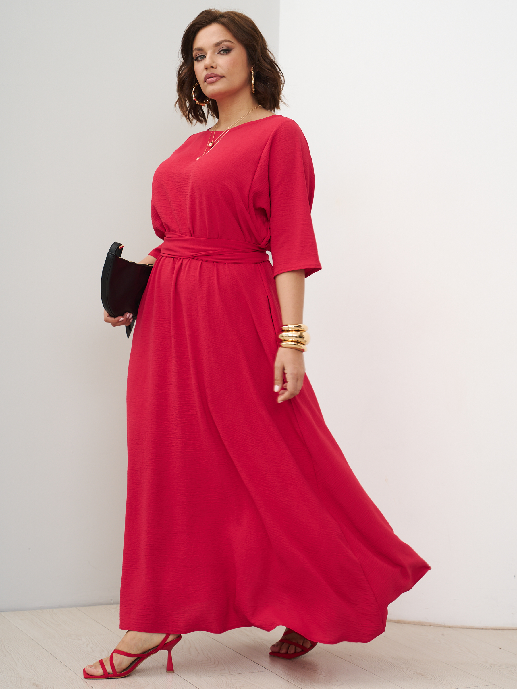 Летнее платье макси однотонное. Горловина округлая .Рукав 7/8 лутучая мышь. Карманы в боковых швах. Платье длинное приталенное. В комплекте пояс. Ткань - легкий текстиль с жатым эффектом.