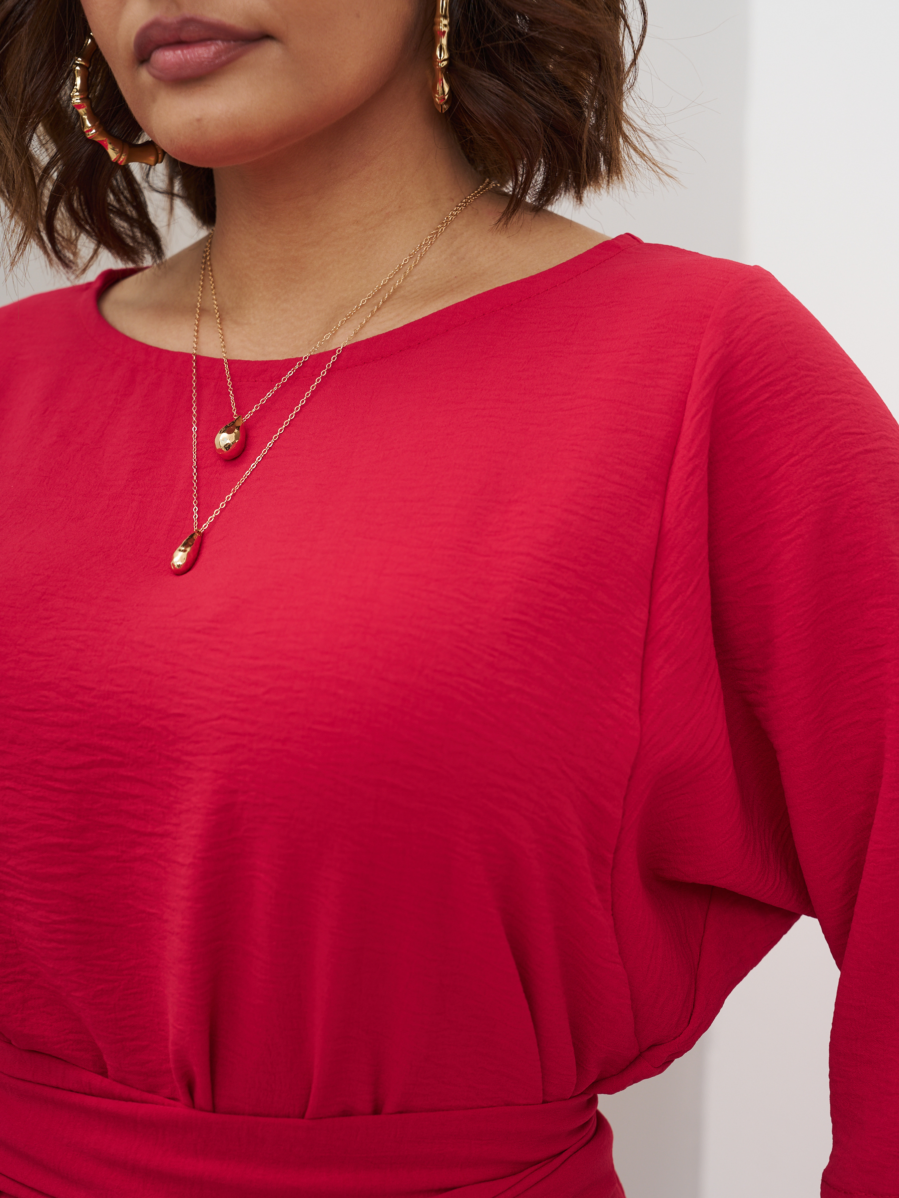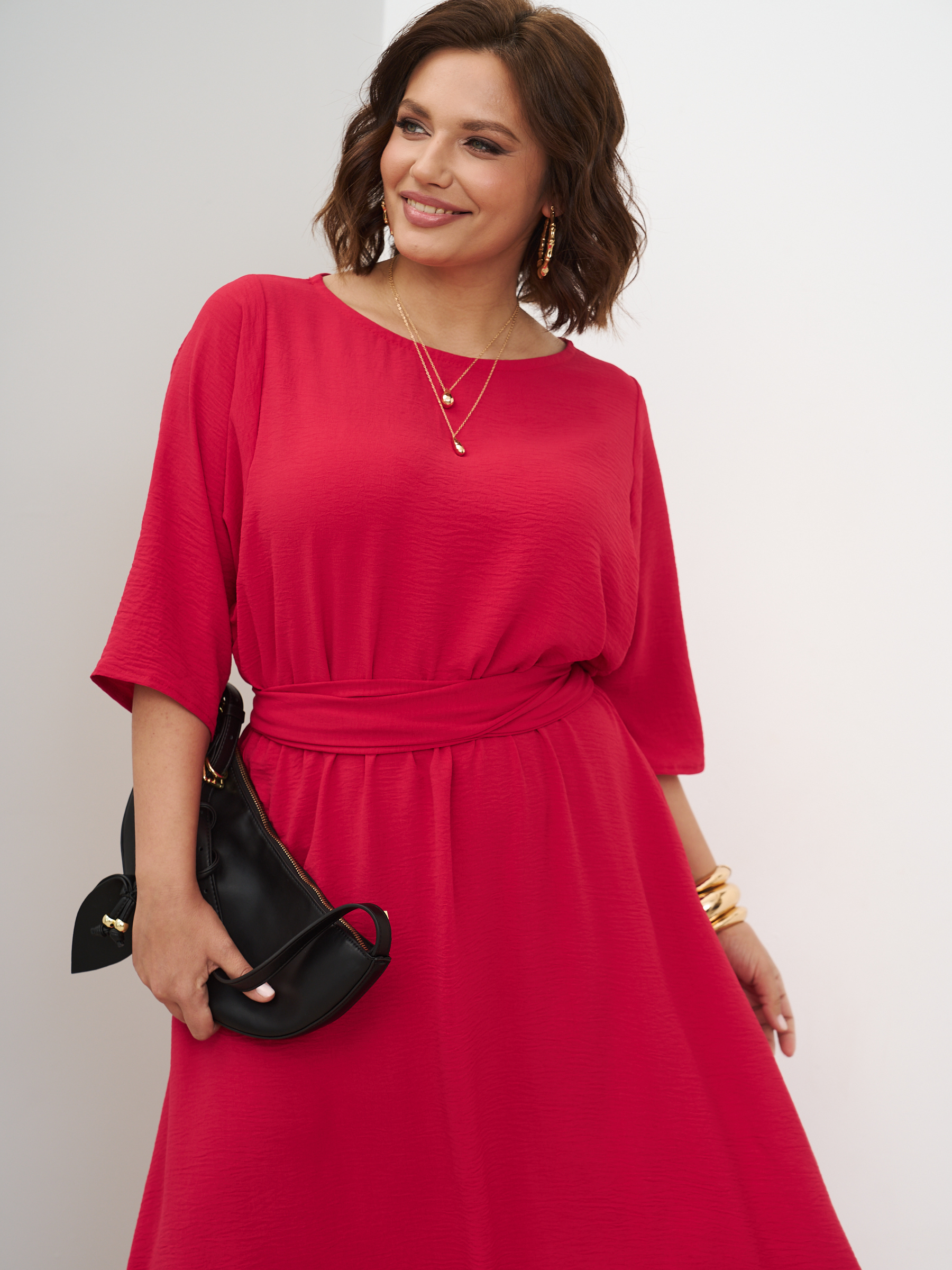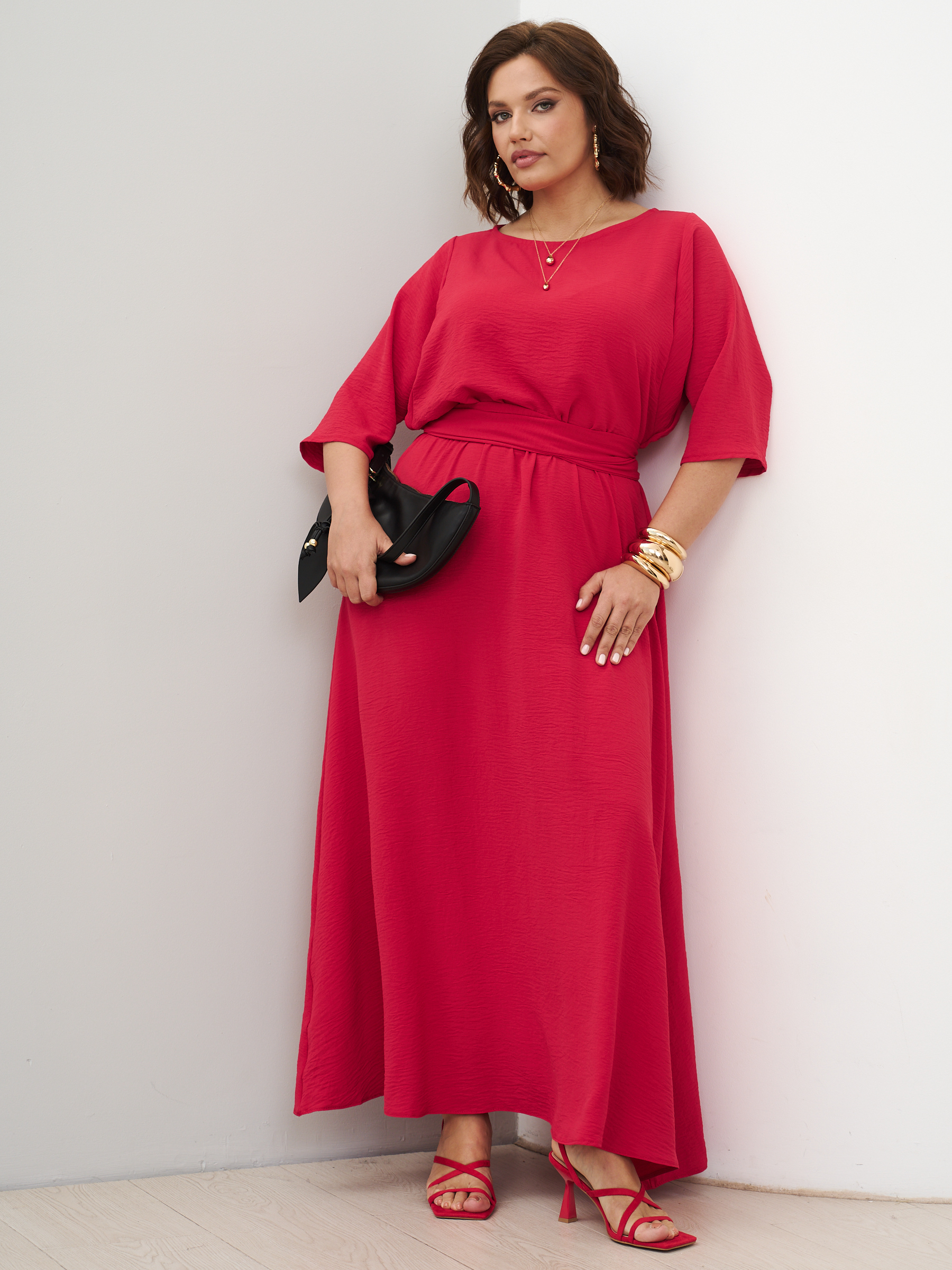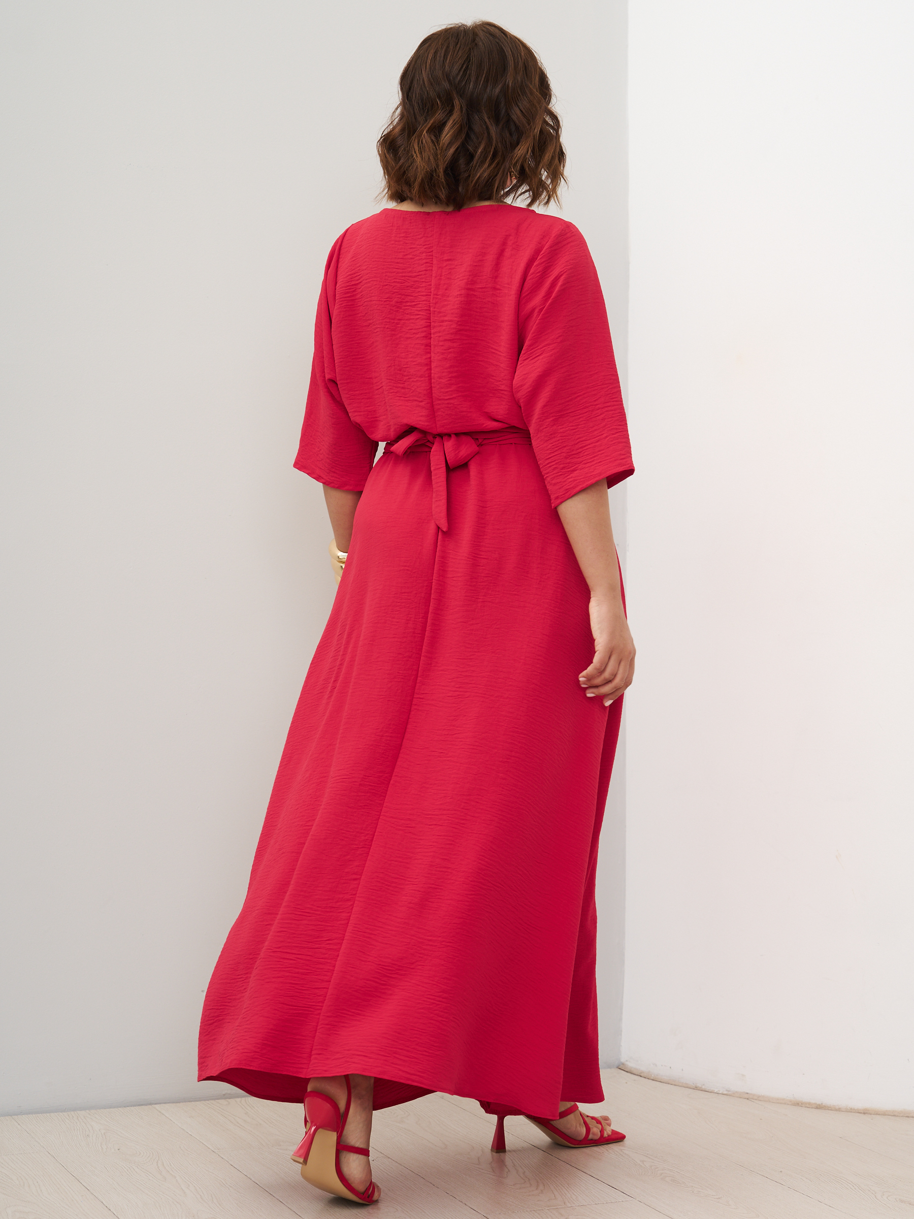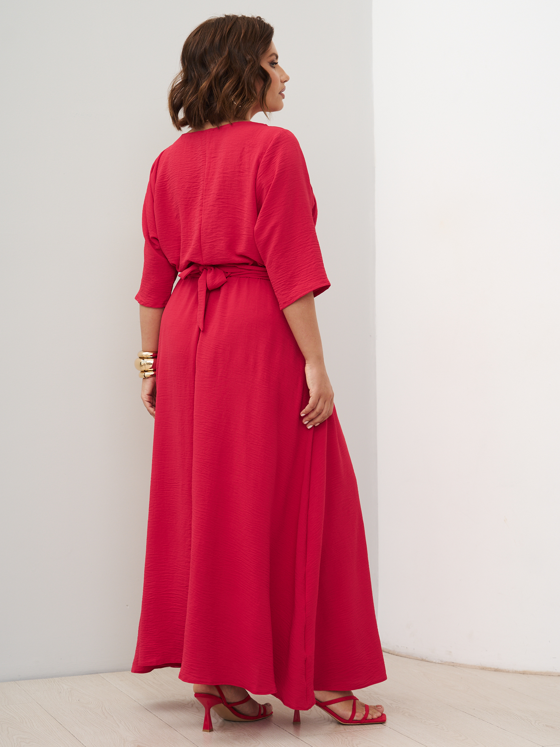 Летнее платье макси однотонное. Горловина округлая .Рукав 7/8 лутучая мышь. Карманы в боковых швах. Платье длинное приталенное. В комплекте пояс. Ткань - легкий текстиль с жатым эффектом.