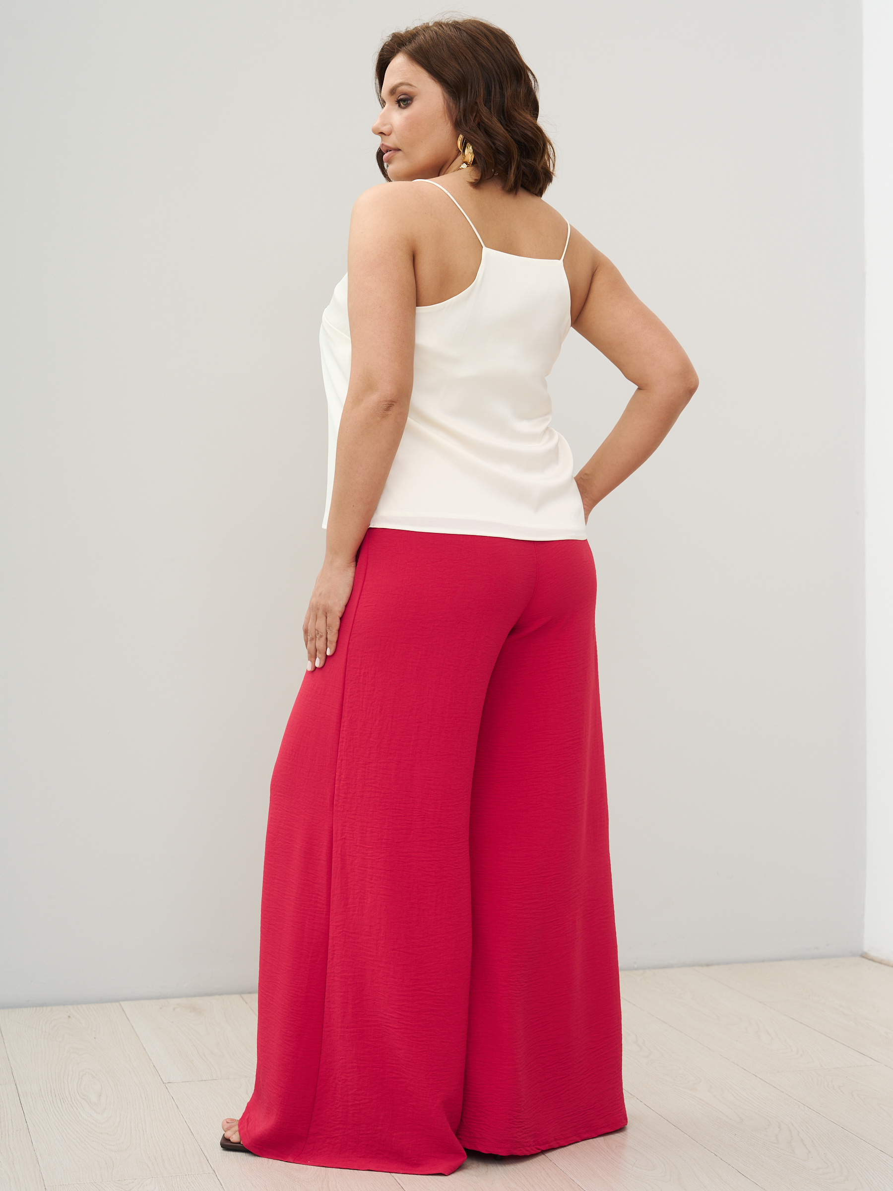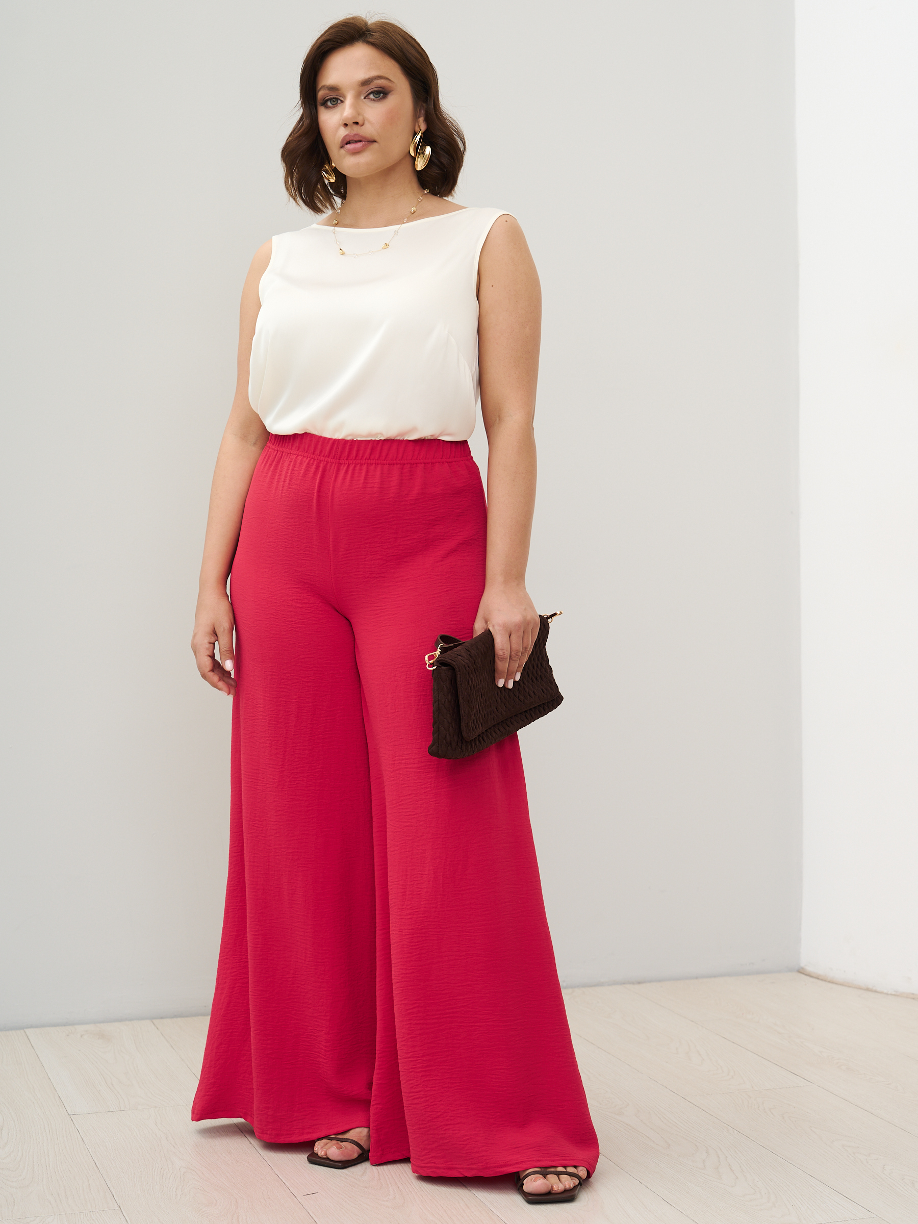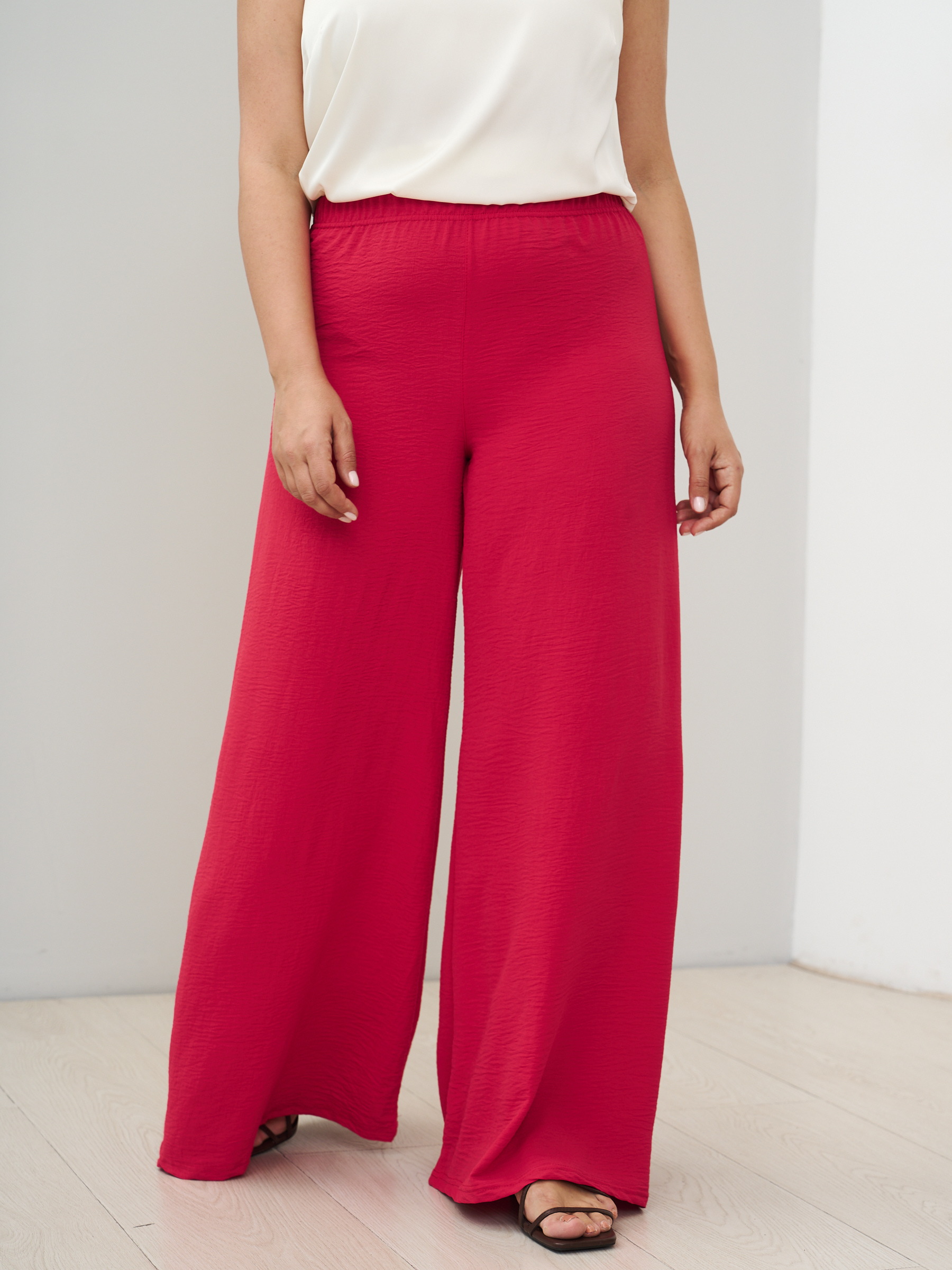 Стильные юбка- брюки для женщин с клешем от бедра. Самый актуальный тренд текущего сезона - брюки супер-клеш с высокой посадкой. Выразительный силуэт, точная посадка. Модель с комфортной высокой посадкой по фигуре и максимальным клёшем от середины бедра. Силуэт брюк отлично подходит женщинам с фигурой любой комплекции, хорошо сочетается с лаконичными блузами и топами. Ткань - легкая с эластичными свойствами, имеет слегка жатый эффект. Пояс на широкой втачной резинке, без карманов.