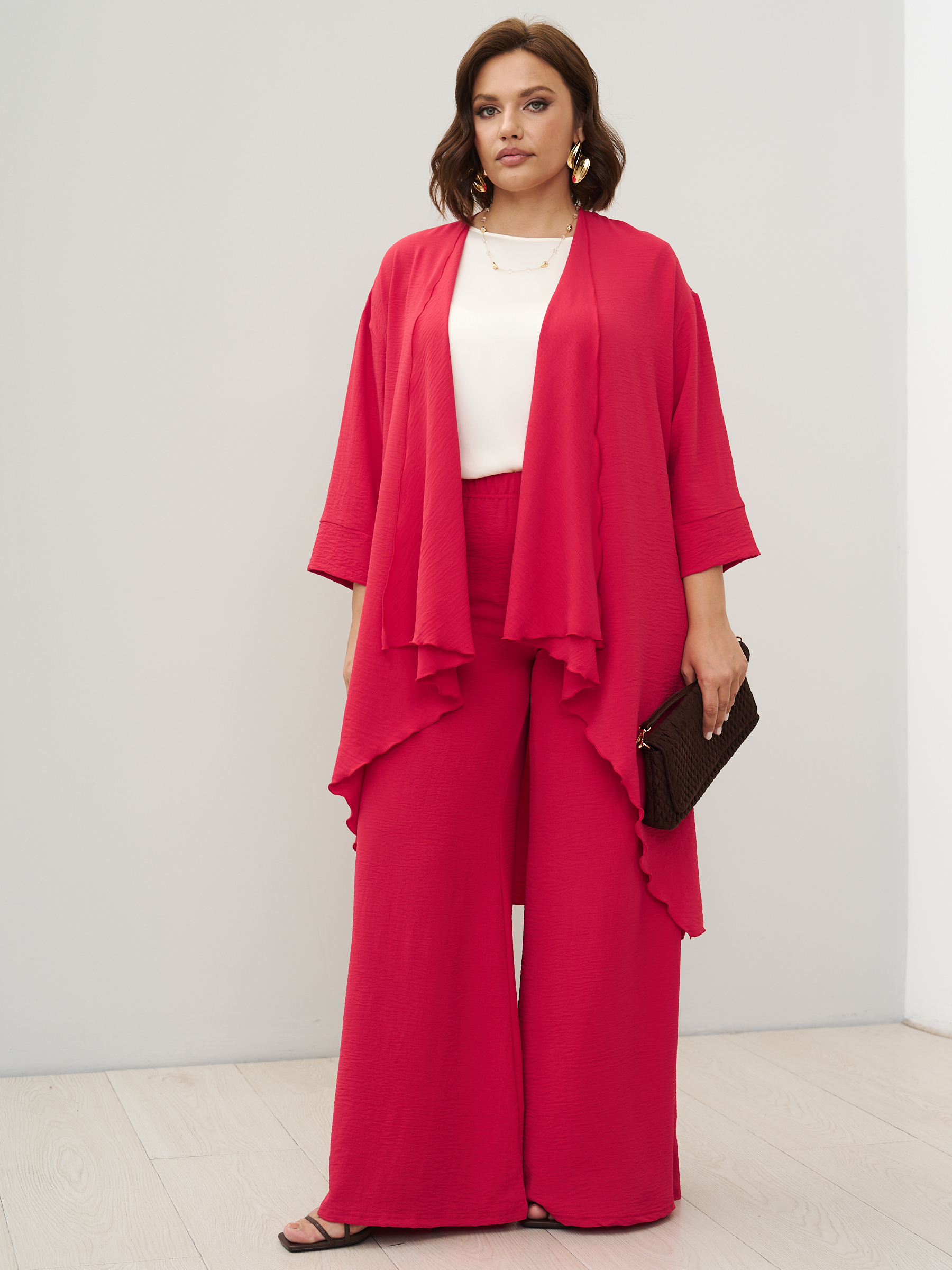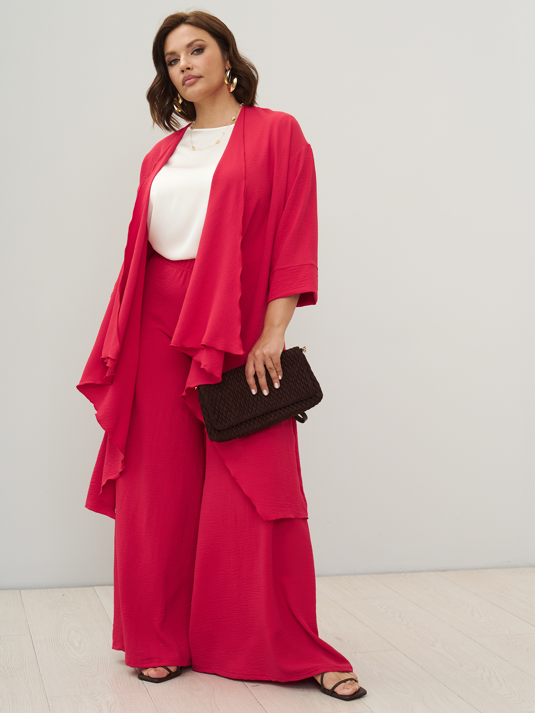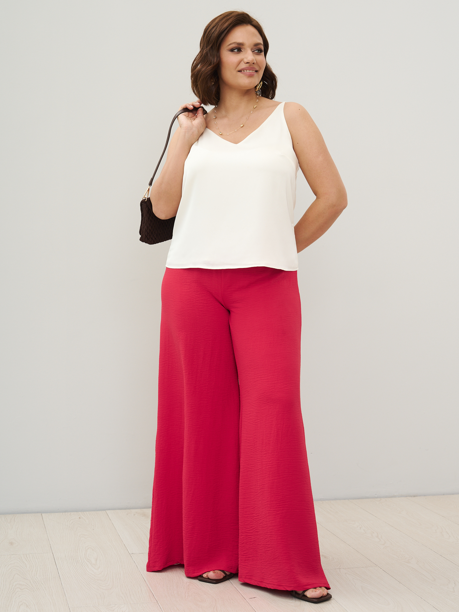 Стильные юбка- брюки для женщин с клешем от бедра. Самый актуальный тренд текущего сезона - брюки супер-клеш с высокой посадкой. Выразительный силуэт, точная посадка. Модель с комфортной высокой посадкой по фигуре и максимальным клёшем от середины бедра. Силуэт брюк отлично подходит женщинам с фигурой любой комплекции, хорошо сочетается с лаконичными блузами и топами. Ткань - легкая с эластичными свойствами, имеет слегка жатый эффект. Пояс на широкой втачной резинке, без карманов.