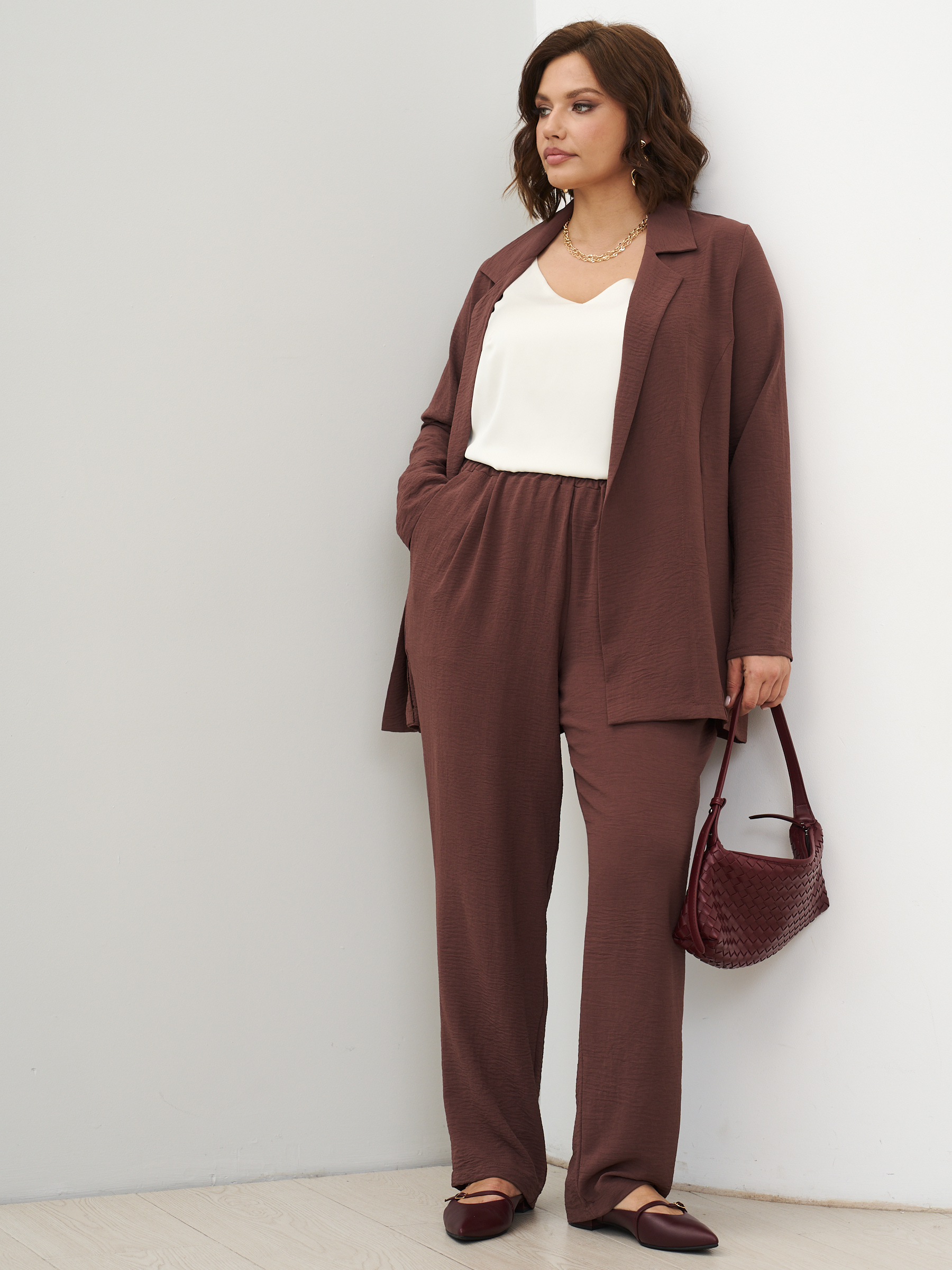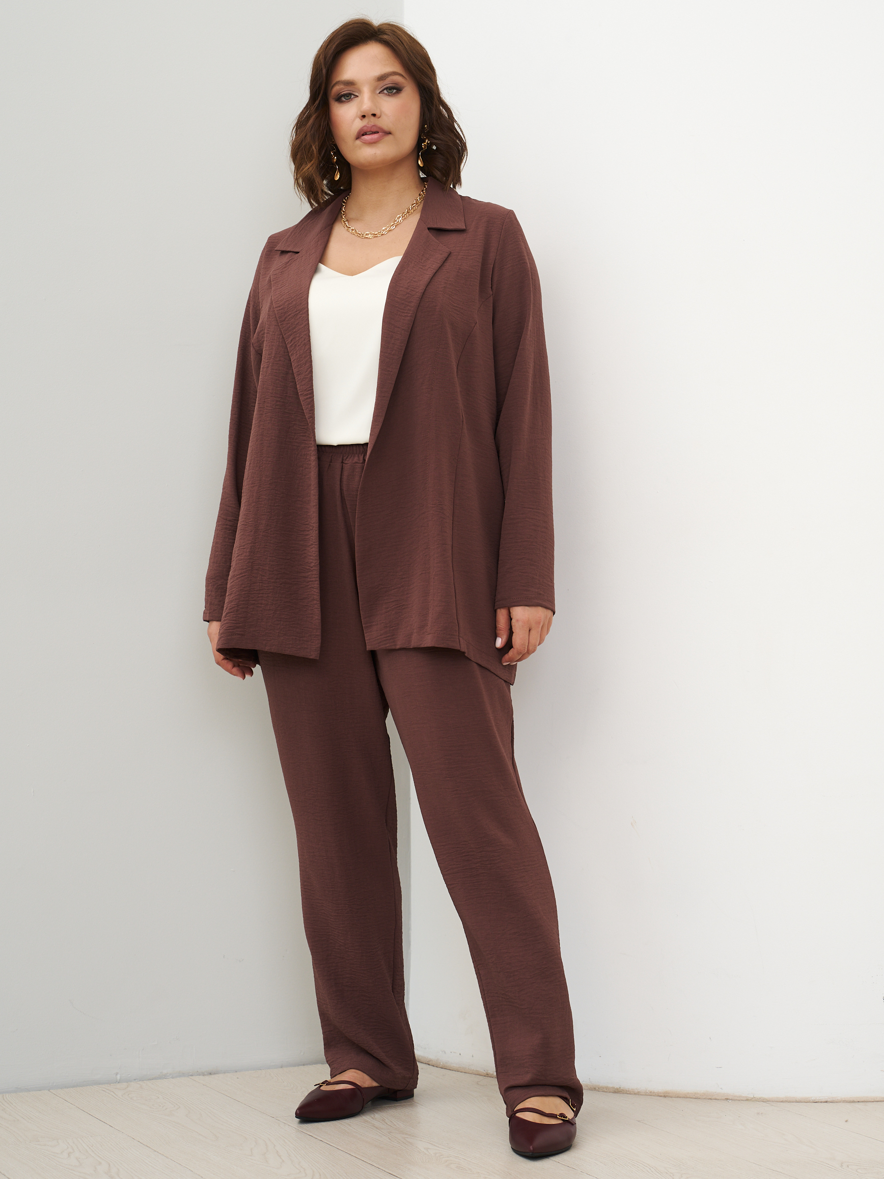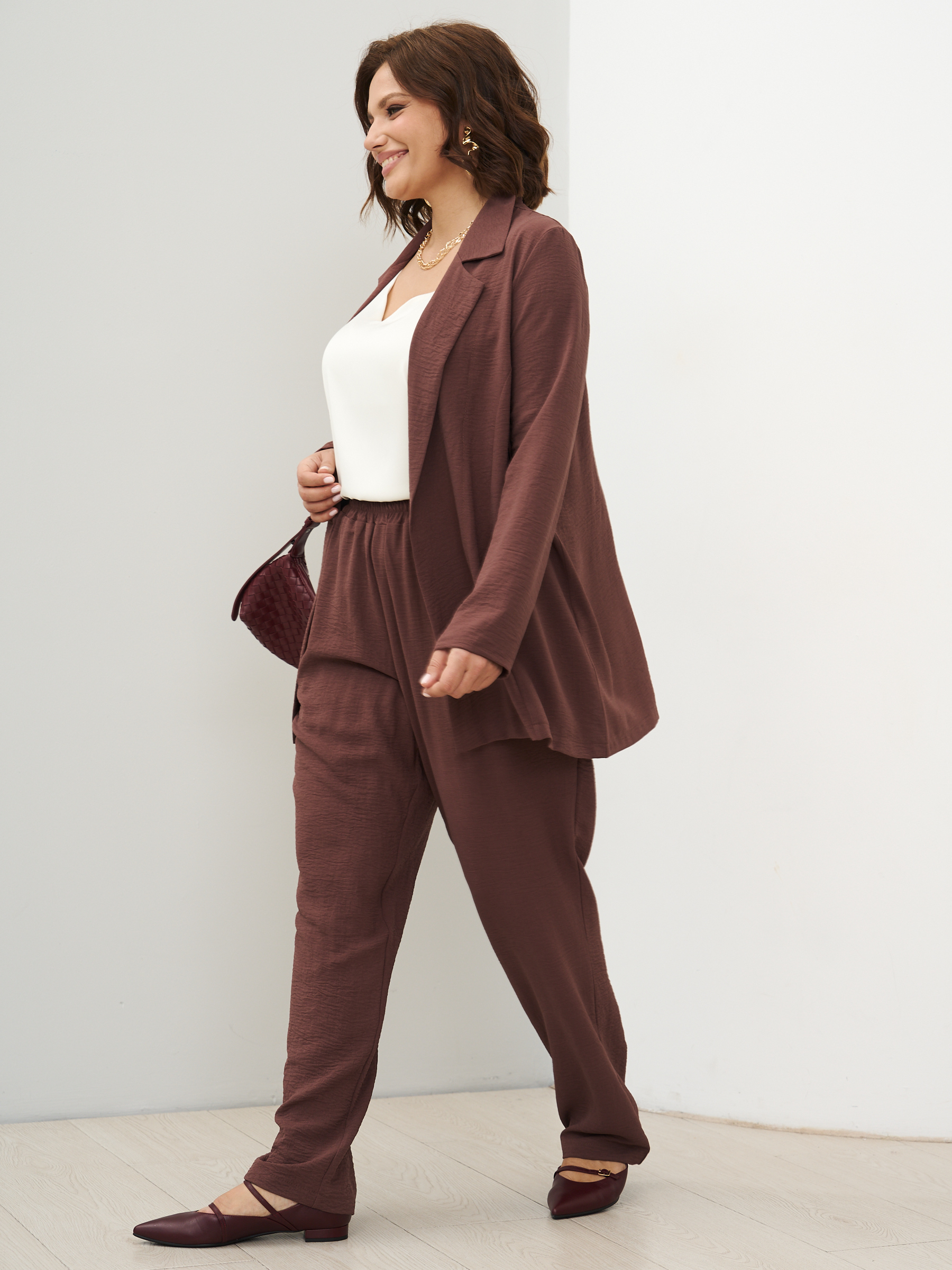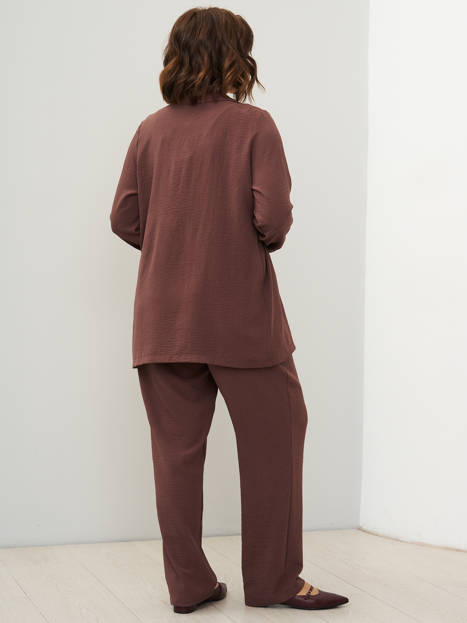 Женский костюм брючный с жакетом летний. Широкие брюки бананы и пиджак оверсайз. ткань - текстиль с эффектом жатки и эластичными свойствами; состав: 30% вискоза и 70% полиэстер. Брюки широкие, слегка заужены к низу, карманы с отрезным бочком, пояс на широкой резинке, защипы спереди. Жакет легкий без подклада, без застежки, без карманов. Костюм легко стирать и сушить, подходит для повседневного использования. Рекомендуется стирка в деликатном режиме. Возможна небольшая усадка ткани, постирайте перед тем, как регулировать длину брюк. Произведено в России с высоким качеством и вниманием к деталям. Летний костюм из текстиля станет идеальным выбором для тех, кто ценит комфорт и стиль.