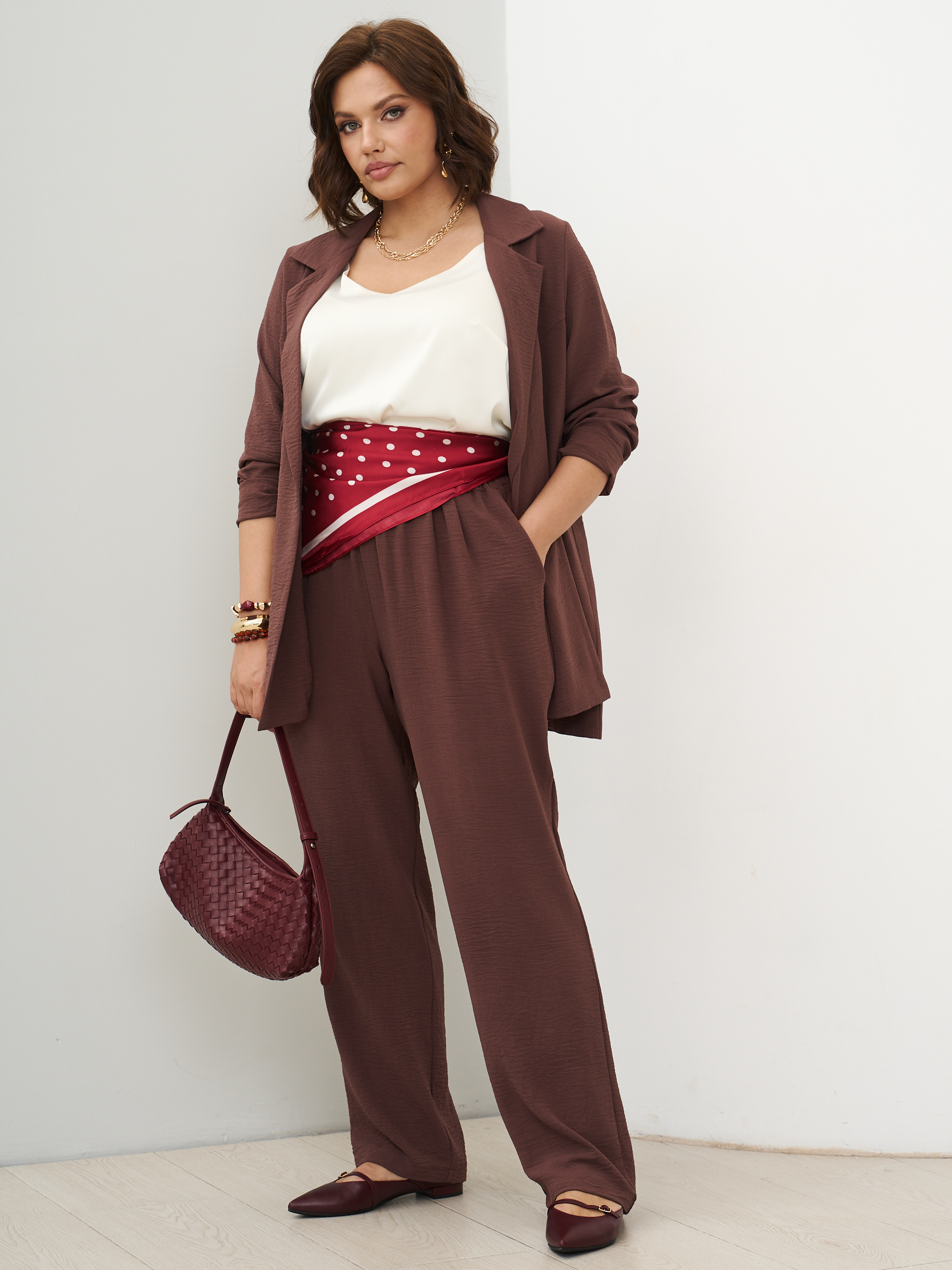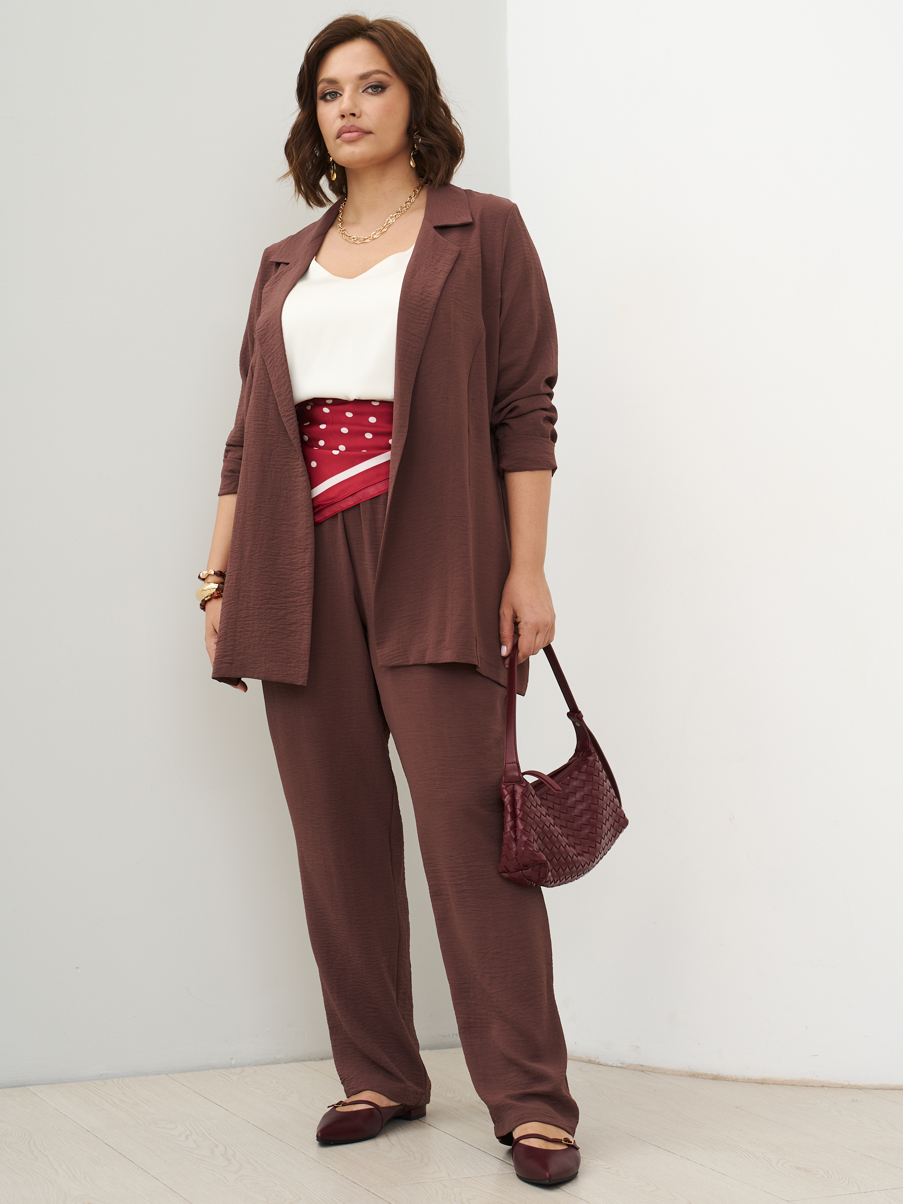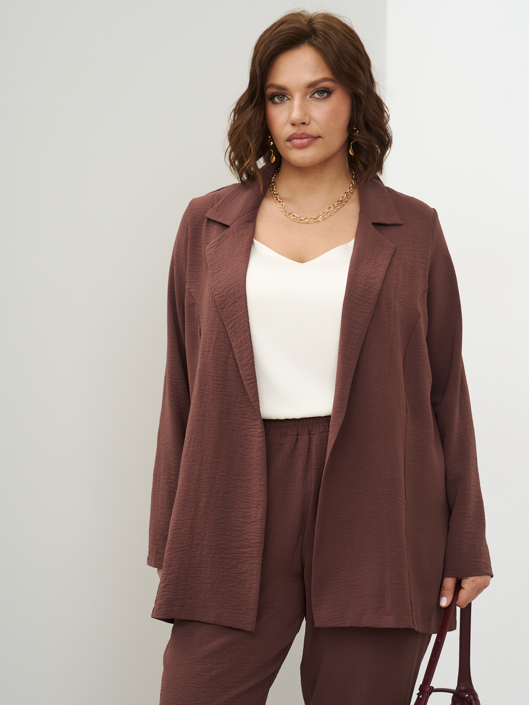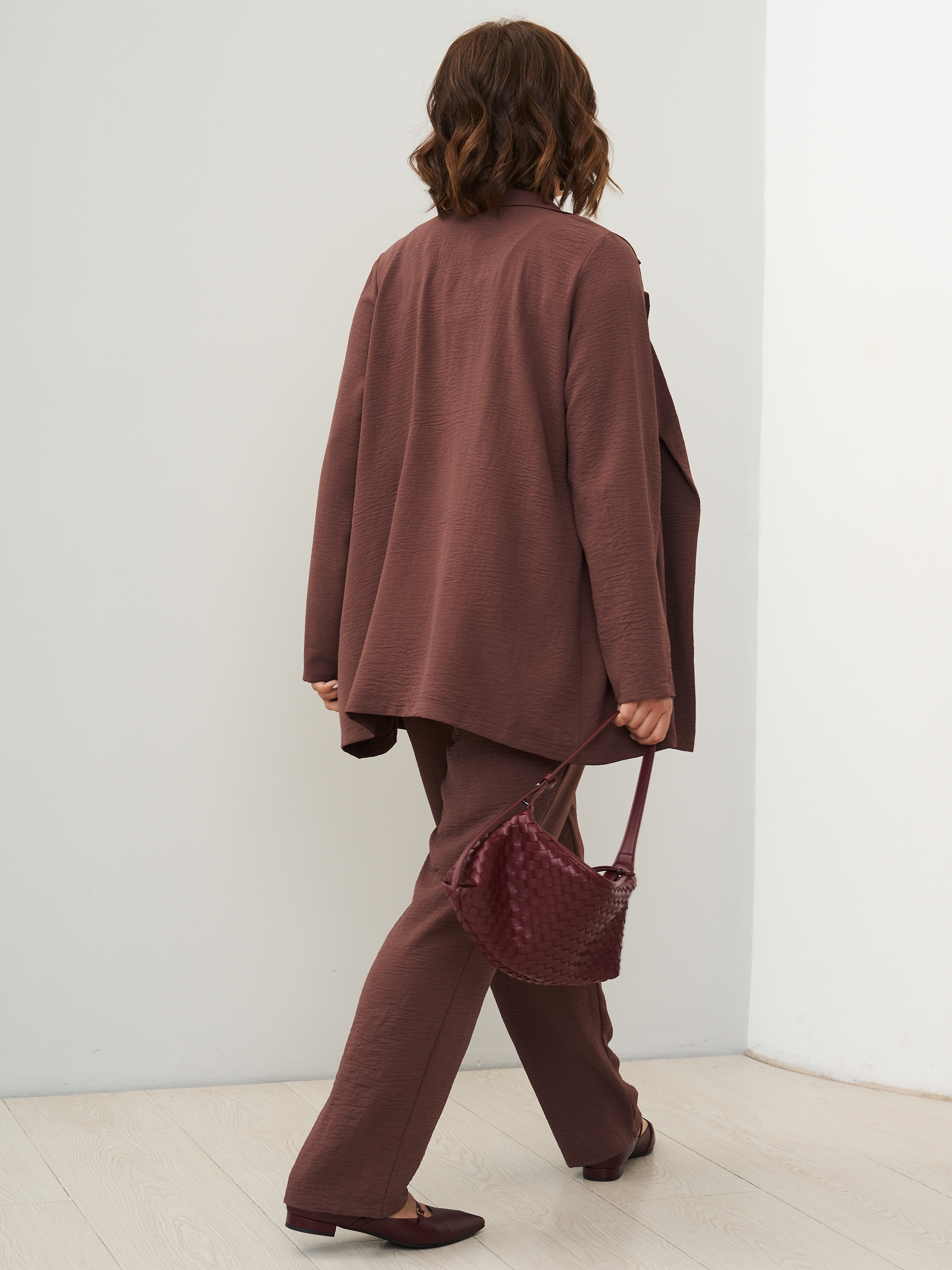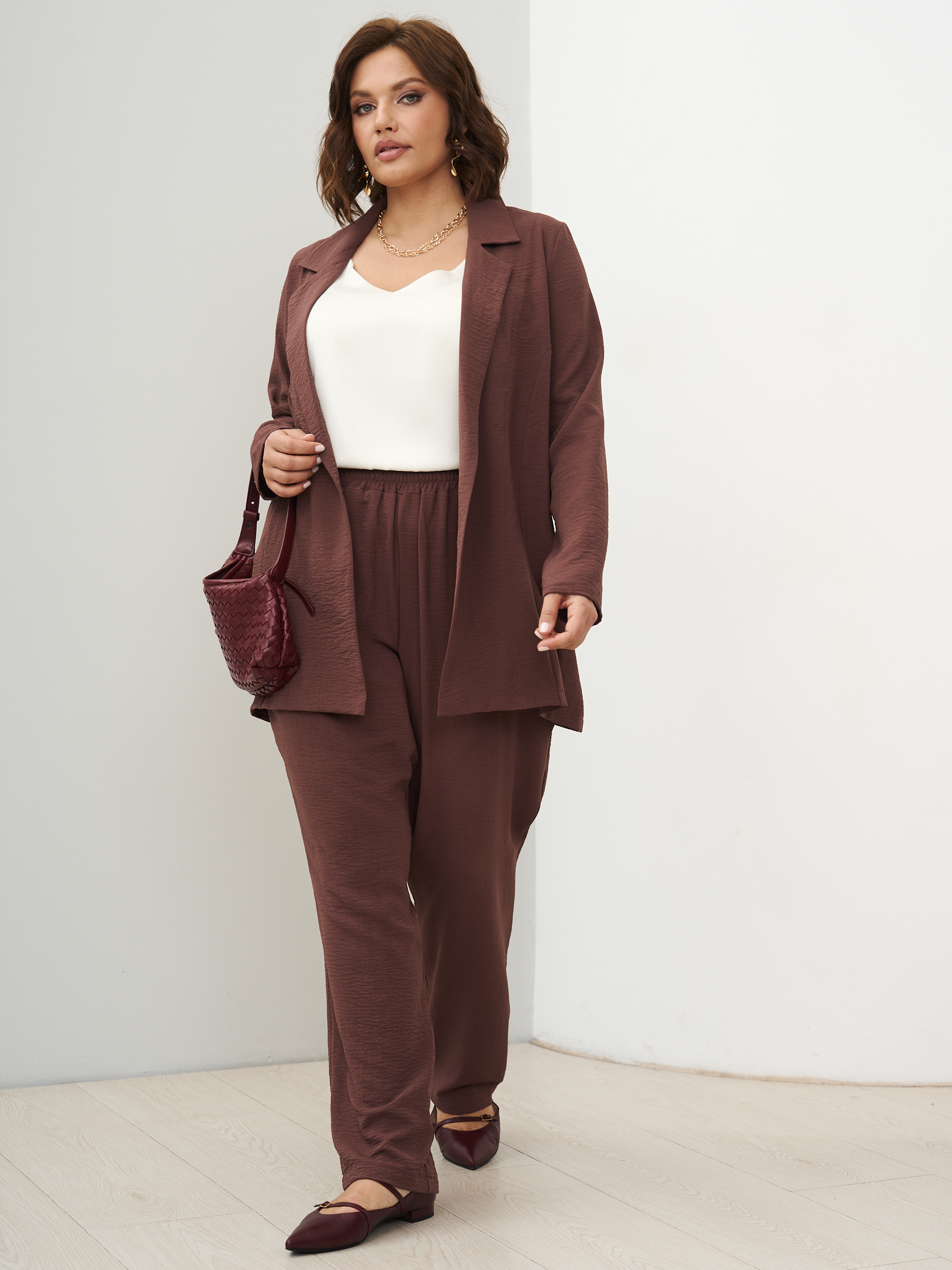 Женский костюм брючный с жакетом летний. Широкие брюки бананы и пиджак оверсайз. ткань - текстиль с эффектом жатки и эластичными свойствами; состав: 30% вискоза и 70% полиэстер. Брюки широкие, слегка заужены к низу, карманы с отрезным бочком, пояс на широкой резинке, защипы спереди. Жакет легкий без подклада, без застежки, без карманов. Костюм легко стирать и сушить, подходит для повседневного использования. Рекомендуется стирка в деликатном режиме. Возможна небольшая усадка ткани, постирайте перед тем, как регулировать длину брюк. Произведено в России с высоким качеством и вниманием к деталям. Летний костюм из текстиля станет идеальным выбором для тех, кто ценит комфорт и стиль.