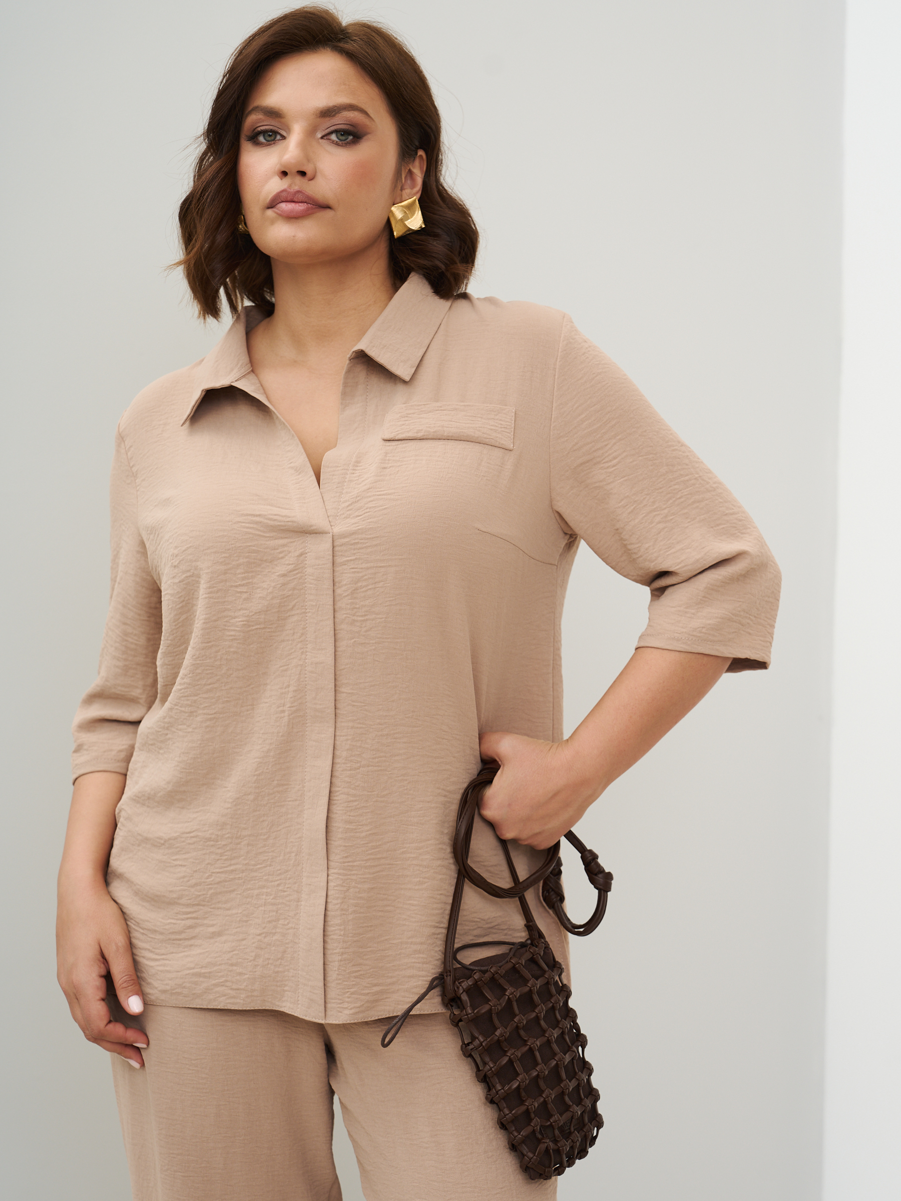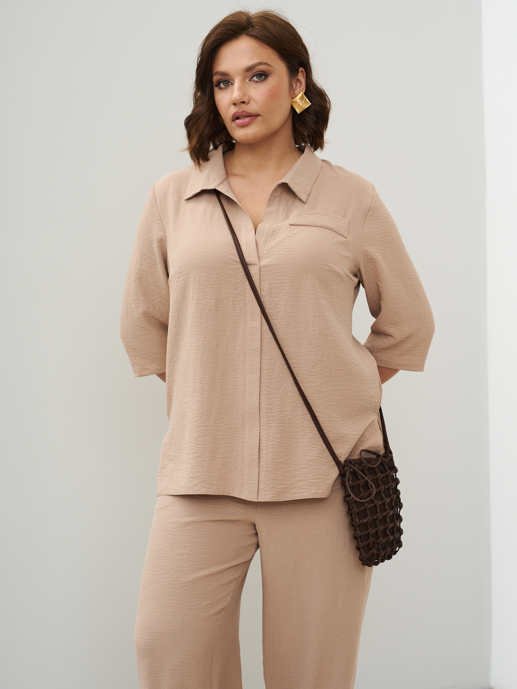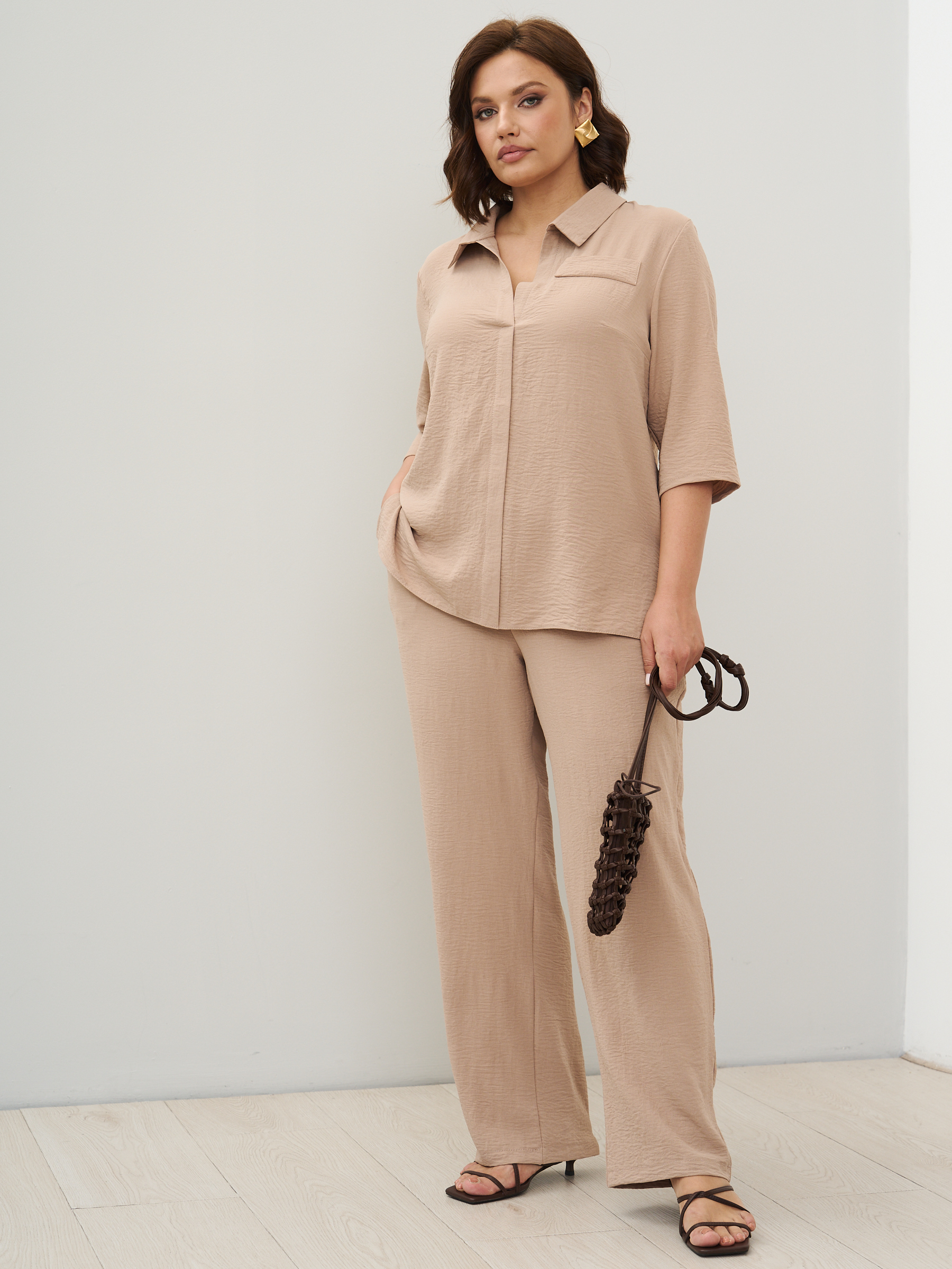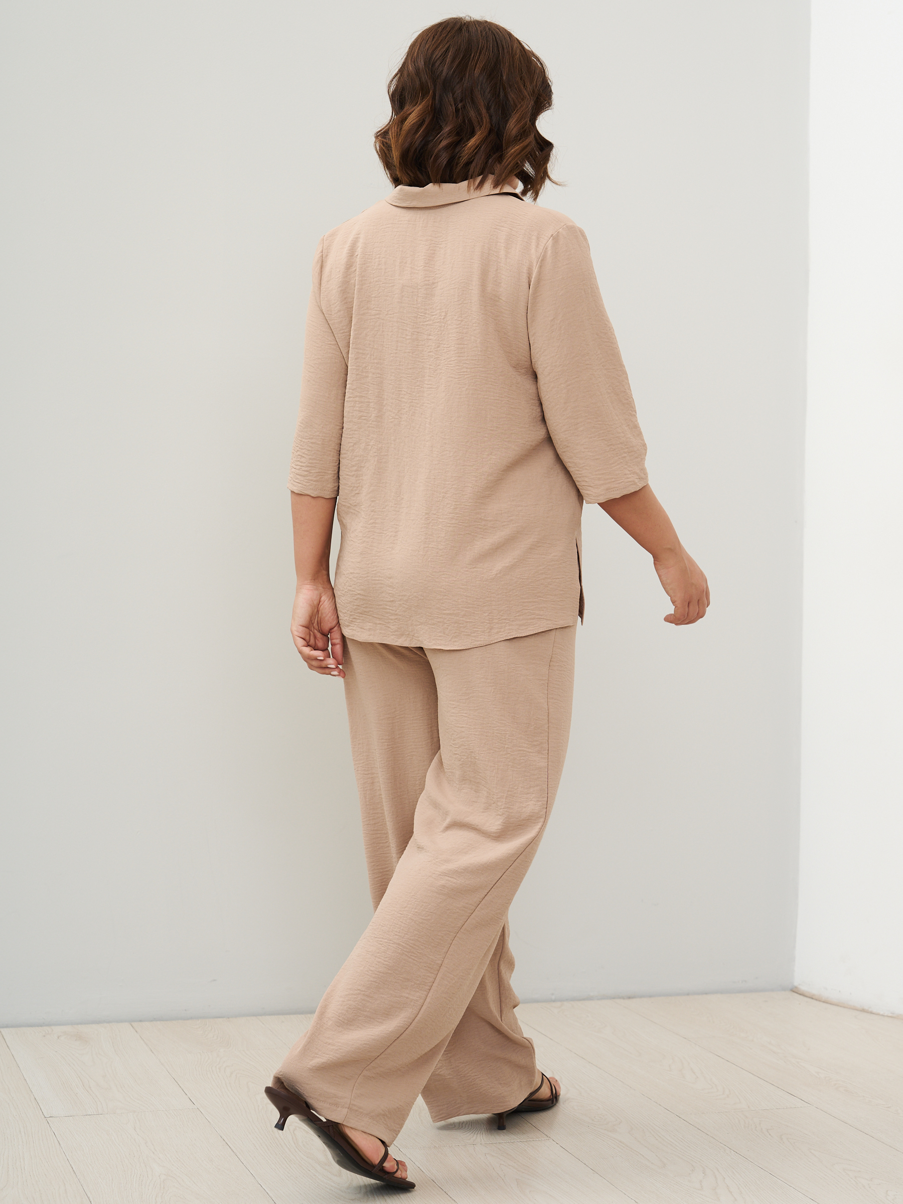 Женский костюм брючный с рубашкой летний. Прямые брюки и рубашка. Ткань - текстиль с эффектом жатки и эластичными свойствами; состав: 30% вискоза и 70% полиэстер. Брюки классические, слегка заужены к низу, карманы с отрезным бочком, пояс на широкой резинке. Рубашка с воротником стойка без застежки, без карманов. Костюм легко стирать и сушить, подходит для повседневного использования. Рекомендуется стирка в деликатном режиме. Возможна небольшая усадка ткани, постирайте перед тем, как регулировать длину брюк. Произведено в России с высоким качеством и вниманием к деталям. Летний костюм из текстиля станет идеальным выбором для тех, кто ценит комфорт и стиль.